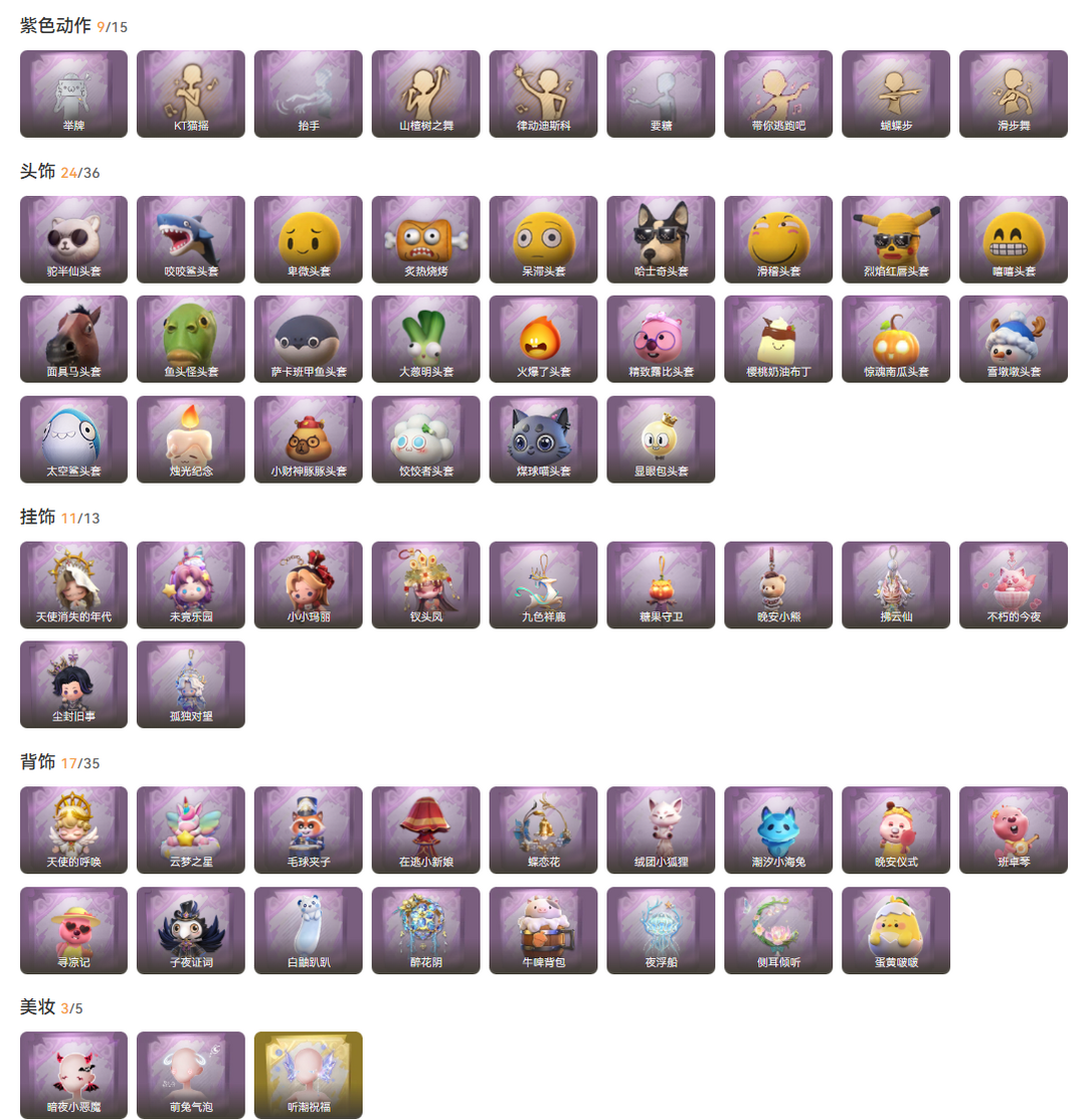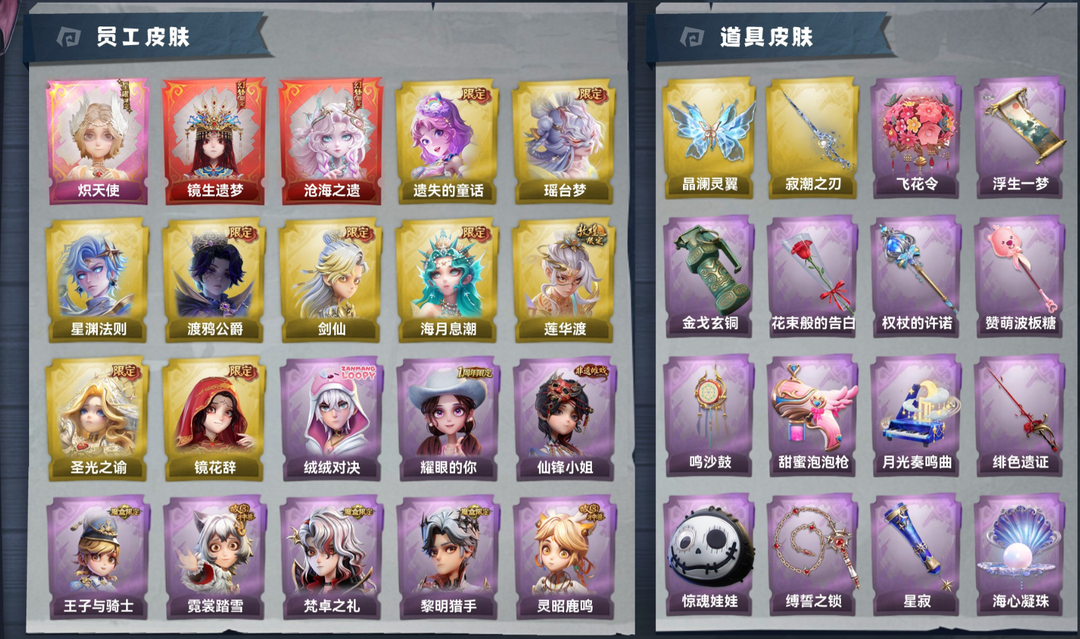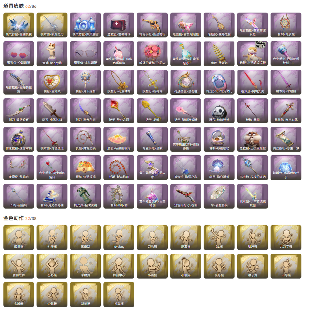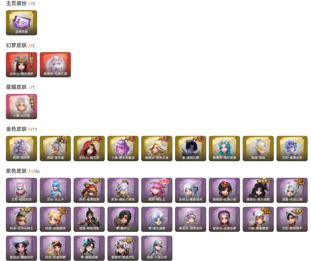 装备描述:2红1星耀9金26紫皮66道具皮肤60饰品 星耀皮肤 小黄-炽天使 幻梦皮肤 巫铃儿-镜生遗梦、薇薇安-沧海之遗 金色皮肤 薇薇安-圣光之谕、小黄-遗失的童话、巫铃儿-镜花辞、逍遥-莲华渡、零-渡鸦公爵、莉莉-瑶台梦、逍遥-剑仙、薇薇安-海月息潮、艾伦-星渊法则 紫色皮肤 小黄-霓裳踏雪、爱丽丝-丝缕哀歌、零-青云逸歌、阿念-灵昭鹿鸣、阿念-王子与骑士、逍遥-泽引山海、逍遥-绣春逍影、薇薇安-黑月挽歌、巫铃儿-素影瑶光、莉莉-情公主、莉莉-除妖小师妹、莉莉-莓果陷阱、艾伦-水王子、艾伦-绒绒对决、爱丽丝-甜梦派对、薇薇安-仙锋小姐、零-搬开山、艾伦-黎明猎手、阿念-庆宴绮愿、爱丽丝-耀眼的你、零-磨砺成锋、爱德华-梵卓之礼、逍遥-万迭云华