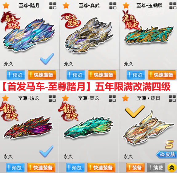 五年限【马车-至尊踏月❤️真武❤️玉麒麟❤️烛龙❤️青龙】满改满四级/逍遥屠龙奥丁刘备吕布+仙兽麒麟