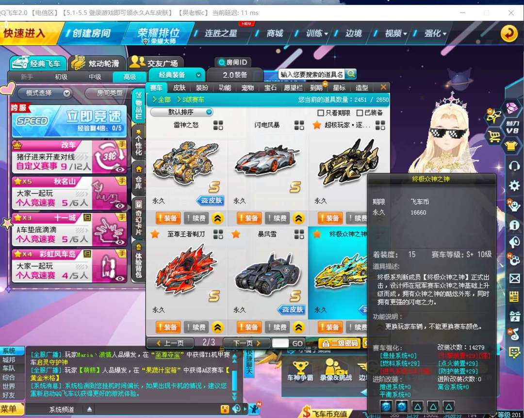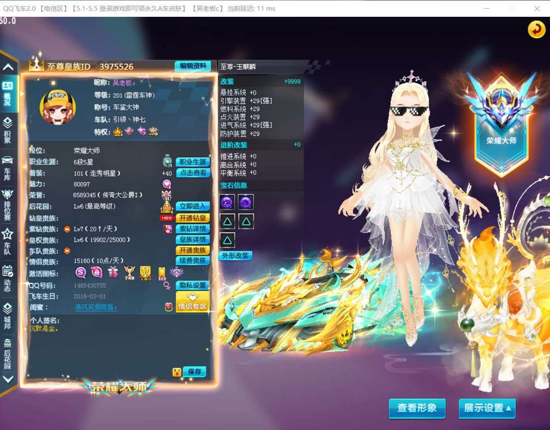 装备描述:13辆S车全部激活改装带宝石带顶级宠物仙兽麒麟+10,玉麒麟满改29双四宝石,爆天甲耀影十阶满改29双四宝石,爆天雷诺满改29双四宝石带三稀有皮肤,终极爆天甲准满改29双三宝石,终极众神之神吕布满改29双四宝石,众神之神幽兰满改29双四宝石,暴风雪Remake满改29双四宝石,疾影M18祝融满改29五个三宝石,超核玩家逐魂者高改双三宝石,闪电风暴高双三宝石,雷神之怒中改双三宝石,至尊王者剃刀中改双三宝石,爆天甲MIni中改双三宝石。两辆顶级T2:奥莉娜五阶天穹战音,满改29三竞速四级宝石,进阶双40。纪元女神高改,三竞速宝石。6辆T1:刑天战斧,双子守护者,战魂,雷诺守卫,无影之刃。永久A车44辆:雷诺满改29双四宝石进阶双40带惩戒轮胎车头,幻夜4级,幻梦皮肤。中改魔王雷诺三竞速宝石。宠物:顶级竞速宠物仙兽麒麟+10,星河和绘画师+10,帅气小正太+9。女衣服90页带几套悬浮动作套,男衣服45页几套悬浮,金玉发饰。可以边境排位,目前排位分数荣耀大师550分。