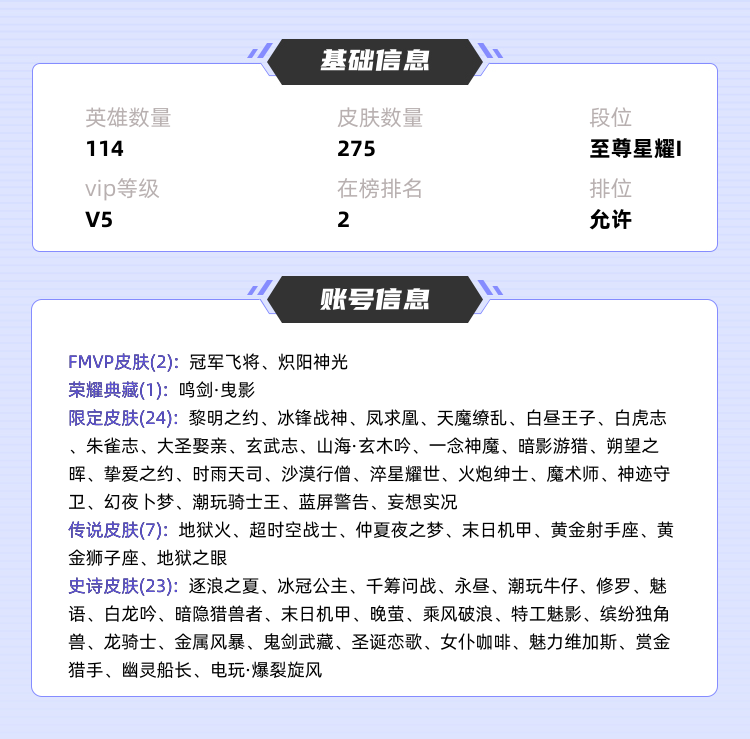 装备描述:>>>>>>毁号,涉及毁坏虚拟财产罪及计算机安全罪,请文明游戏素质游戏,让我们共建美好租号平台>>>>>> 本游戏账号: V5用户,基础段位:最强王者,英雄多,皮肤多。典藏皮肤1个,感受典藏皮肤带来的优质体验快感,FMVP皮肤2个,尽情享受FMVP皮肤带来的主角光环, 私人所属英雄皮肤有:李白 鸣剑·曳影孙尚香 末日机甲||宫本武藏 地狱之眼||狄仁杰 超时空战士||达摩 黄金狮子座||貂蝉 仲夏夜之梦||孙悟空 地狱火||后羿 黄金射手座镜 炽阳神光||花木兰 冠军飞将,等等 注意事项: A.游戏过程中请不要恶意挂机或者不文明发言;B.恶意挂机、顶号等行为将被拉黑无法再次下单;C.进入游戏后中途请勿退出登陆,否则无法再次上号;D.部分账号由于异地登录可能会出现密码错误提示,通常再尝试5-6次后可上号。 |||||||||>喜欢本账号请点 ☆收藏☆高质量账号请游戏局内保持文明,防止禁言影响他人游戏,祝您玩得愉快!