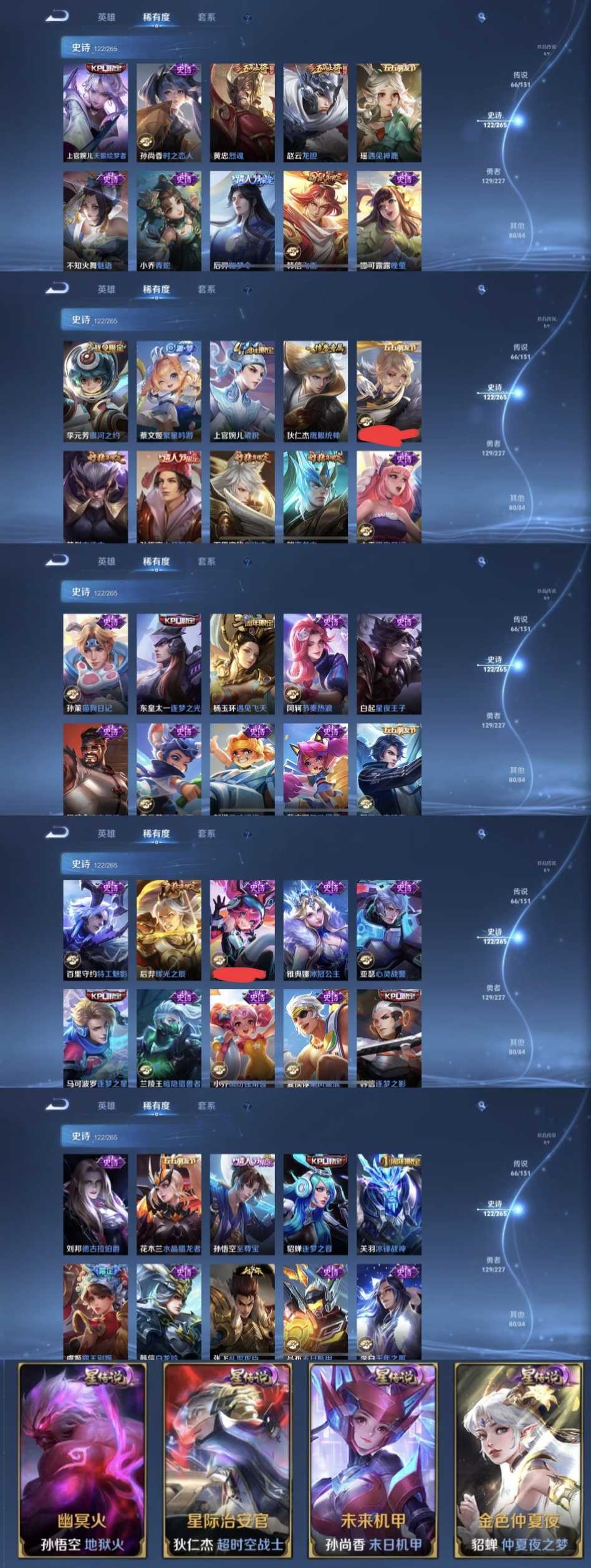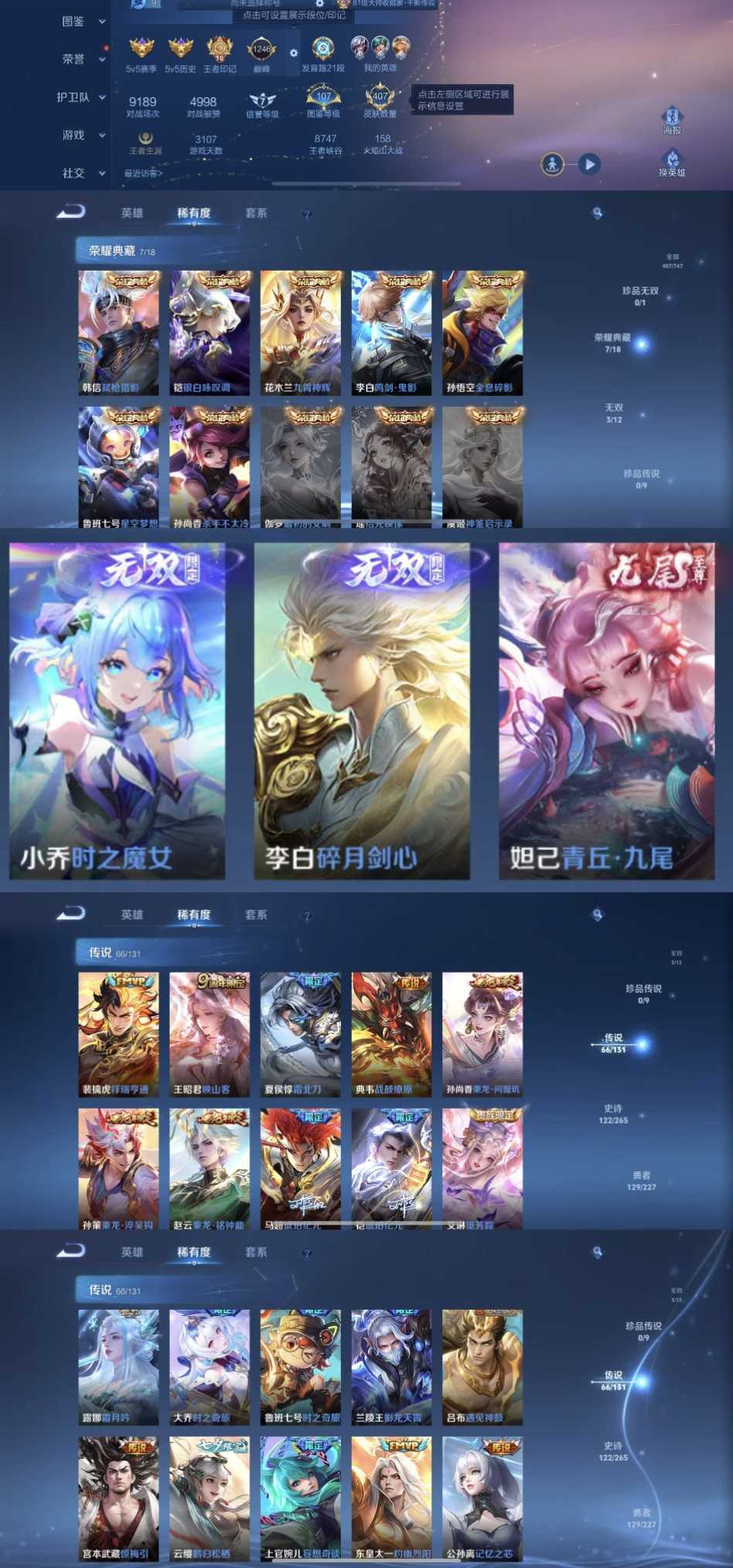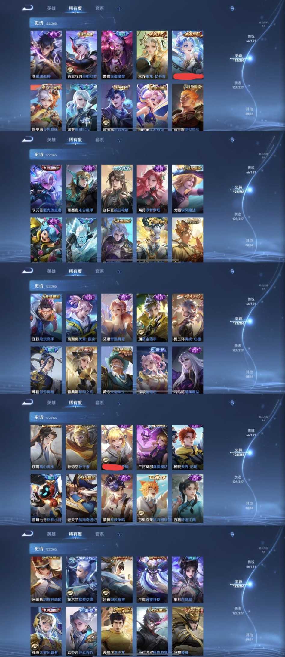 限制: 租号2次及以上 | 撤单率<49%才可租用此帐号装备描述:时间到了还登录白玩或者顶号全部改密拉黑处理永不解除,顶号机器会秒禁玩改密,顶号不仅拉黑还没得玩,赚三两块不容易,请理解谢谢。 ❤❤❤❤❤❤❤❤❤❤❤❤ 请勿开挂,挂机,送头,骂人,撤单后游戏等如有违规永久拉黑永不解除。 重置二级密码不要费劲了,号主每天都会上号查看,多行不义必自毙,人在做天在看,多做好事多自律,少做缺德事 该号英雄127个皮肤407个,典藏7个,无双3个,星传说4个,传说66个,史诗122个,祝你游戏愉快~