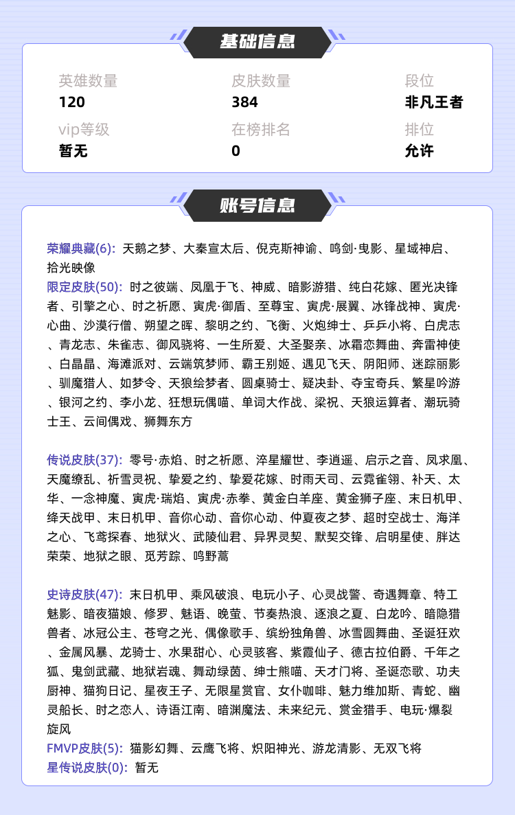 装备描述:>>>>>>毁号,涉及毁坏虚拟财产罪及计算机安全罪,请文明游戏素质游戏,让我们共建美好租号平台>>>>>> 本游戏账号: ,基础段位:非凡王者,英雄多,皮肤多。典藏皮肤6个,感受典藏皮肤带来的优质体验快感,FMVP皮肤5个,尽情享受FMVP皮肤带来的主角光环, 私人所属英雄皮肤有:诸葛亮 星域神启||瑶 拾光映像||武则天 倪克斯神谕||小乔 天鹅之梦||李白 鸣剑·曳影||芈月 大秦宣太后孙悟空 零号·赤焰||孙悟空 地狱火||诸葛亮 时雨天司||诸葛亮 武陵仙君||瑶 时之祈愿||达摩 黄金狮子座||孙尚香 异界灵契||孙尚香 末日机甲||大乔 挚爱花嫁||露娜 启示之音||武则天 海洋之心||李信 一念神魔||小乔 音你心动||曜 李逍遥||女娲 补天||铠 绛天战甲||裴擒虎 寅虎·赤拳||李白 凤求凰||公孙离 祈雪灵祝||吕布 天魔缭乱||宫本武藏 地狱之眼||貂蝉 仲夏夜之梦||孙策 挚爱之约||孙策 末日机甲||李元芳 飞鸢探春||兰陵王 默契交锋||赵云 淬星耀世||艾琳 觅芳踪||伽罗 太华||虞姬 云霓雀翎||虞姬 启明星使||狄仁杰 超时空战士||梦奇 胖达荣荣