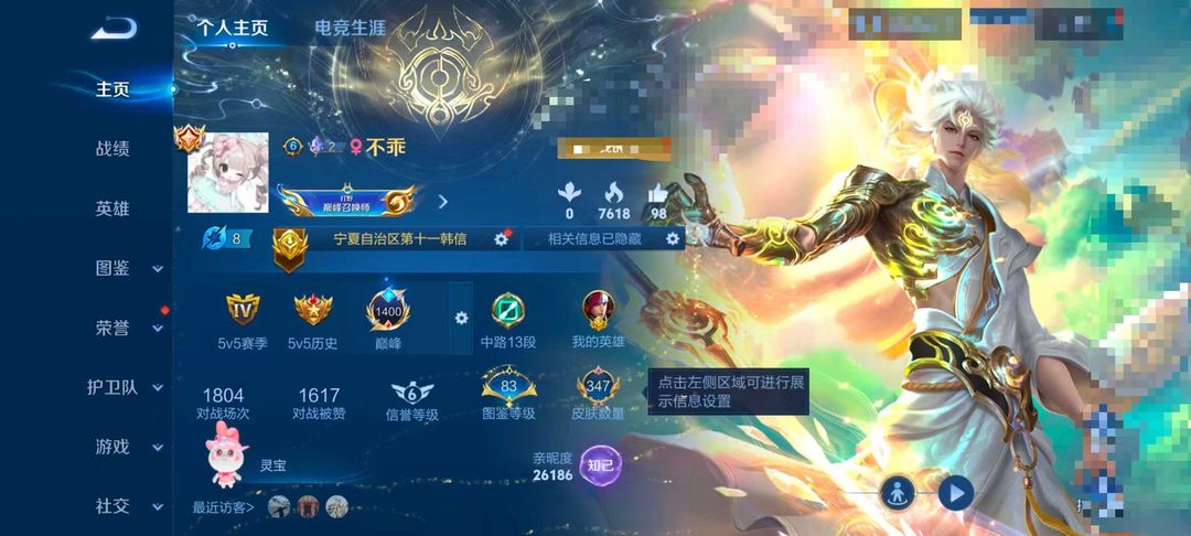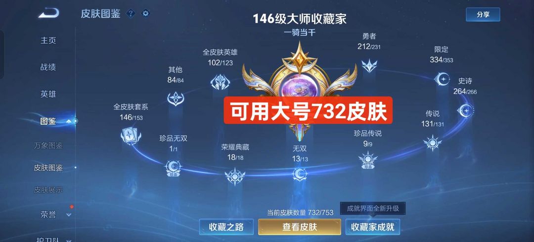 V10贵族347皮肤荣耀贵族传承号♥可用大号732个皮肤♥瑶典藏♥甄姬韩信小乔无双♥嫦娥珍品♥小魔方