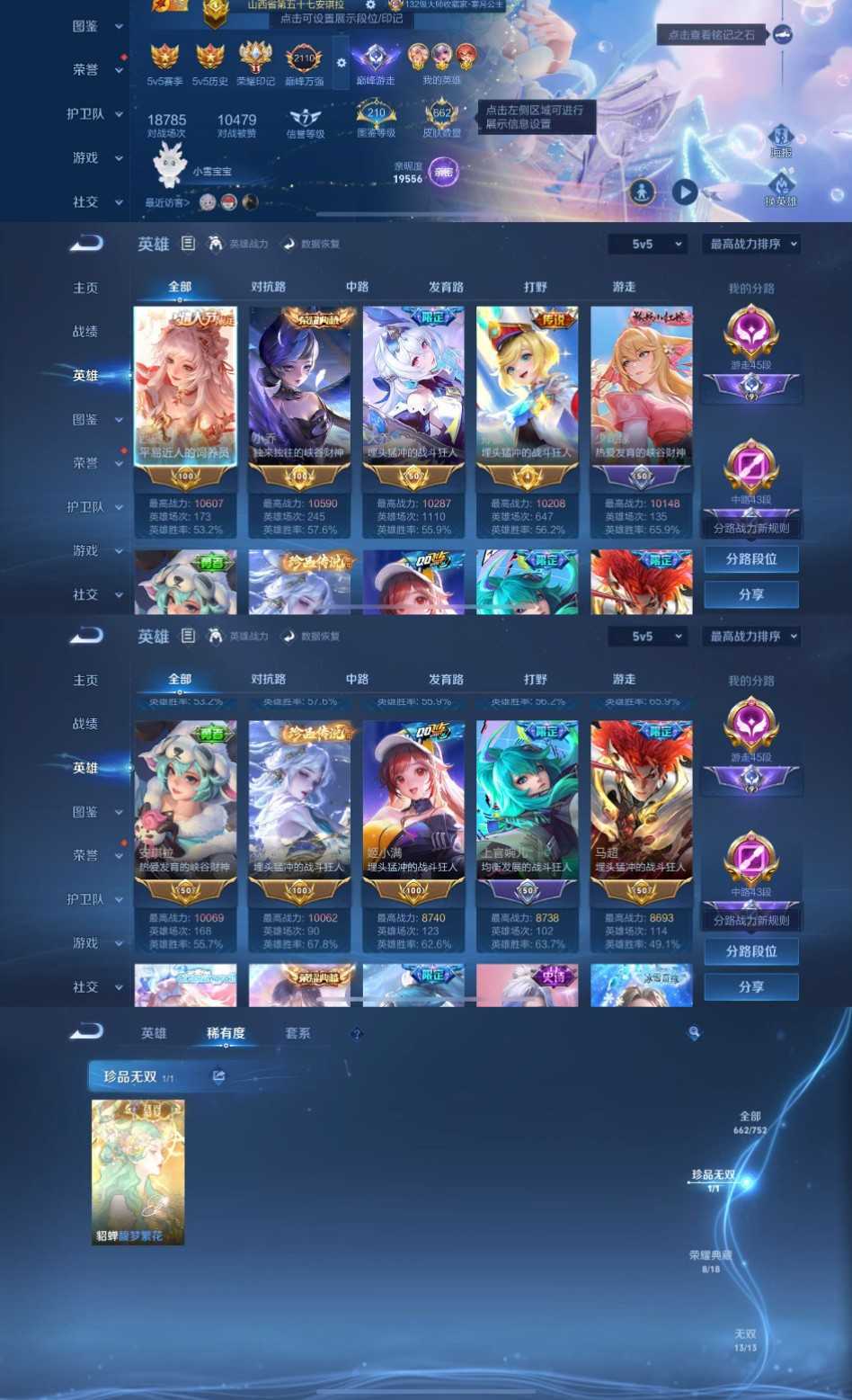 限制: 租号2次及以上 | 撤单率<49%才可租用此帐号装备描述:时间到了还登录白玩或者顶号全部改密拉黑处理永不解除,顶号机器会秒禁玩改密,顶号不仅拉黑还没得玩,赚三两块不容易,请理解谢谢。 ❤❤❤❤❤❤❤❤❤❤❤❤❤❤❤❤❤❤❤ 请勿开挂,挂机,送头,骂人,撤单后游戏等如有违规永久拉黑永不解除。 重置二级密码不要费劲了,号主每天都会上号查看,多行不义必自毙,人在做天在看,多做好事多自律,少做缺德事。 该号英雄128个皮肤662个,珍品无双1个,典藏9个,无双13个,珍品传说9个,星传说7个,传说108个,史诗223个,祝您游戏愉快~