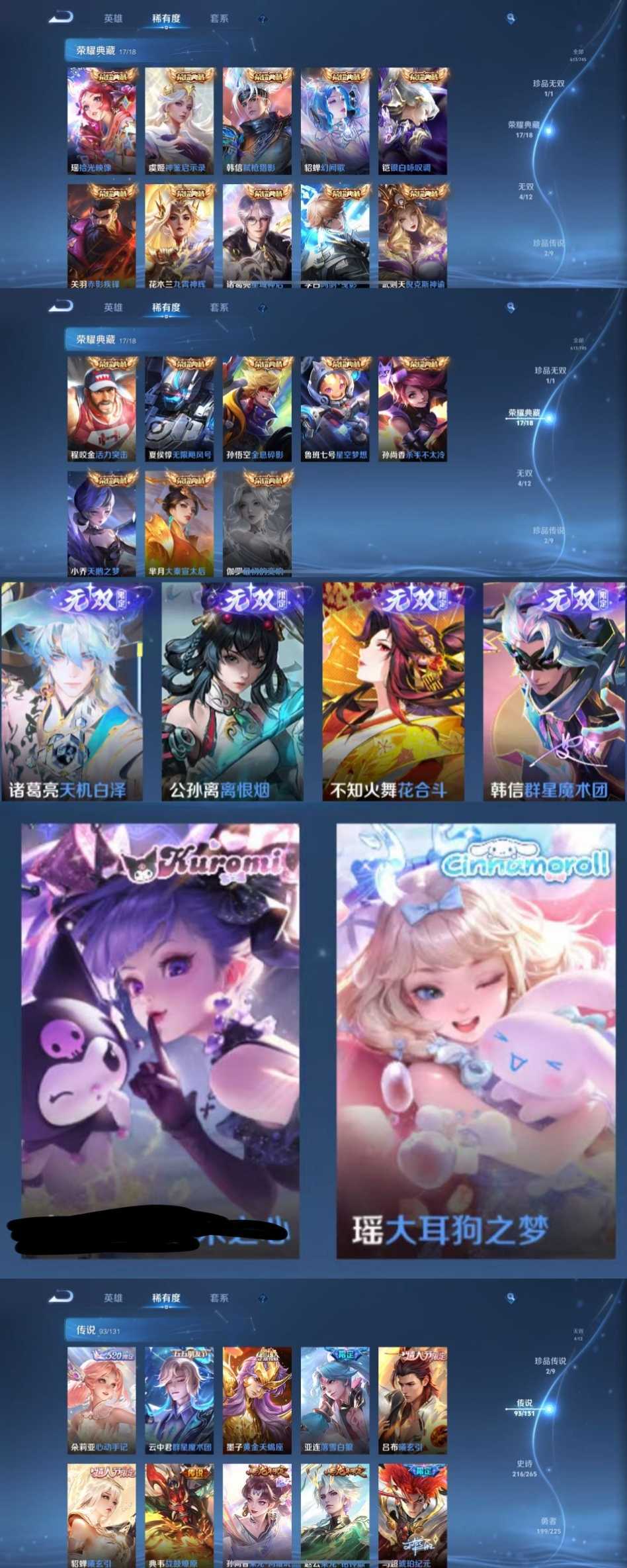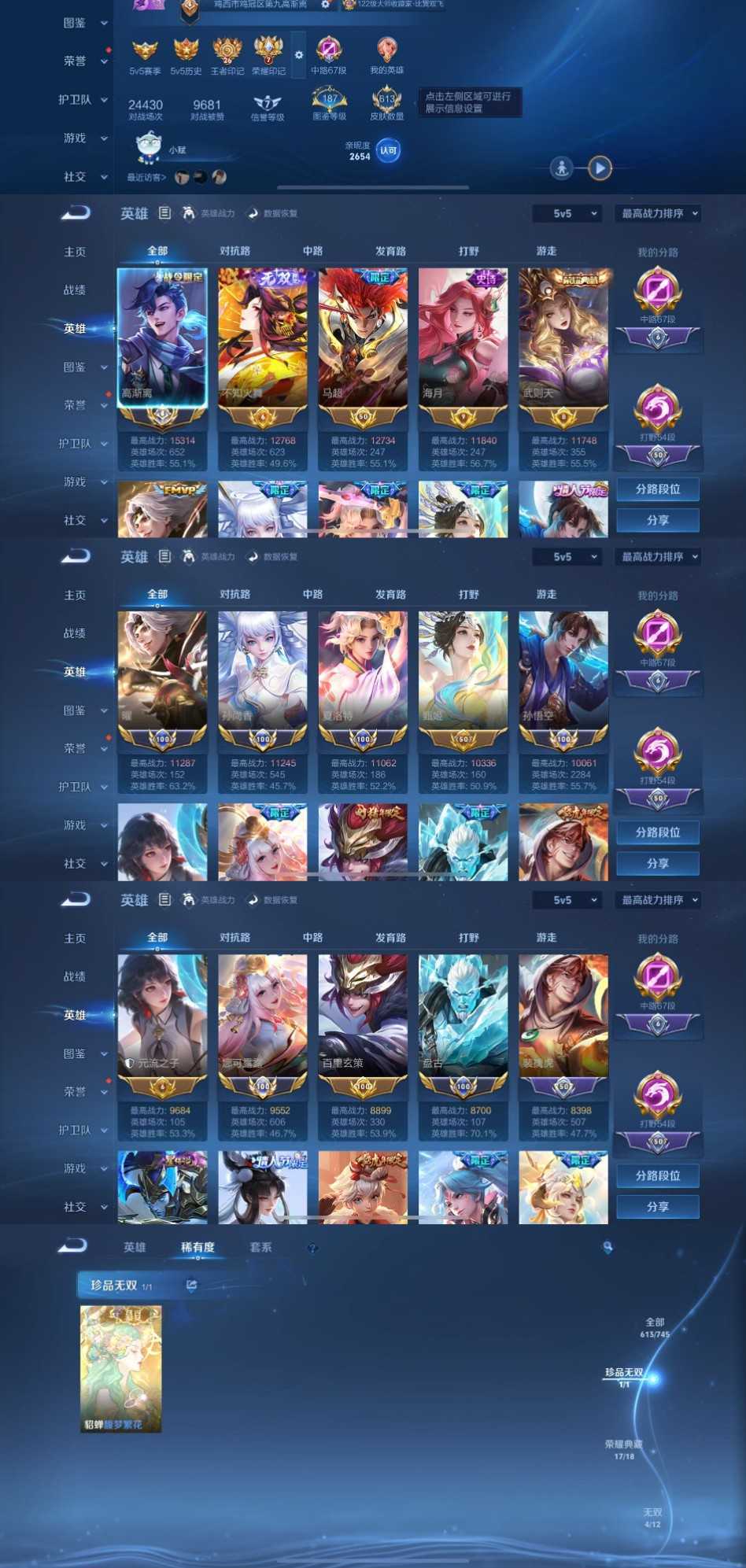 限制: 租号2次及以上 | 撤单率<49%才可租用此帐号装备描述:时间到了还登录白玩或者顶号全部改密拉黑处理永不解除,顶号机器会秒禁玩改密,顶号不仅拉黑还没得玩,赚三两块不容易,请理解谢谢。 ❤❤❤❤❤❤❤❤❤❤❤❤❤❤❤❤❤❤ 请勿开挂,挂机,送头,骂人,撤单后游戏等如有违规永久拉黑永不解除。 重置二级密码不要费劲了,号主每天都会上号查看,多行不义必自毙,人在做天在看,多做好事多自律,少做缺德事。 该号英雄128个皮肤613个,珍品无双1个,典藏18个,无双4个,珍品传说2个,星传说7个,传说93个,史诗216个,祝你游戏愉快