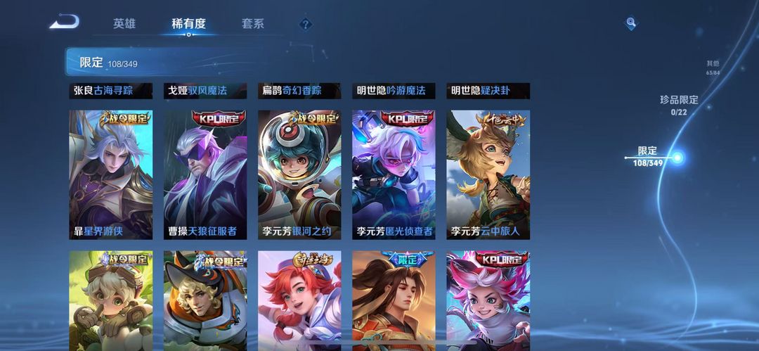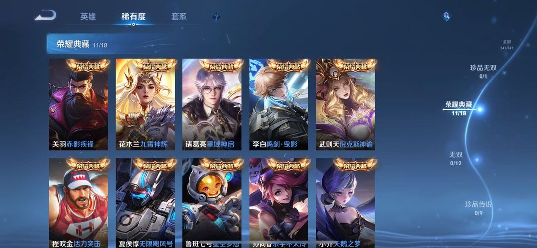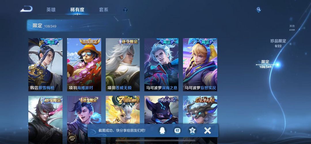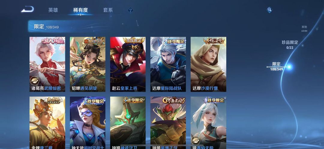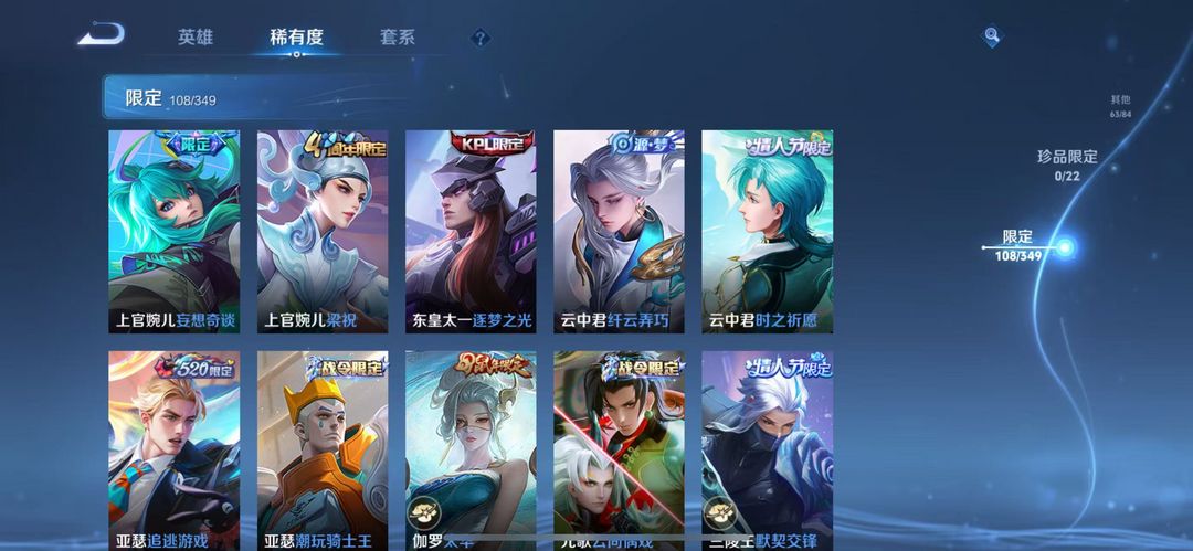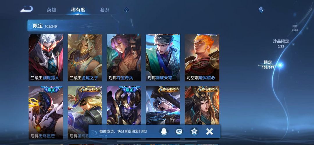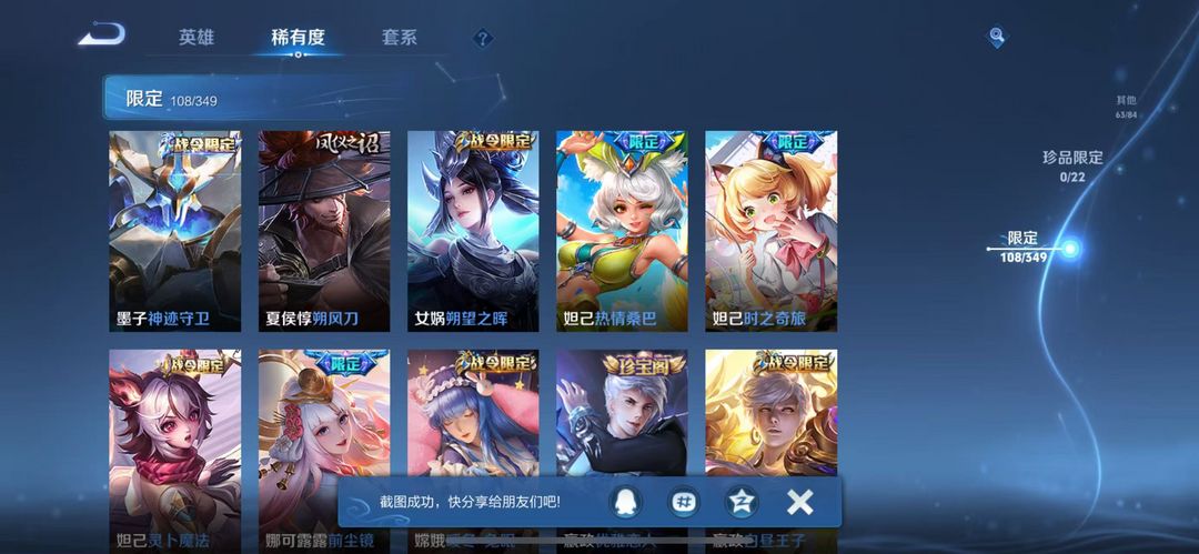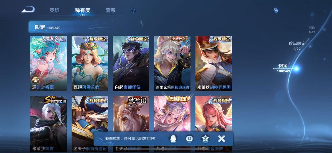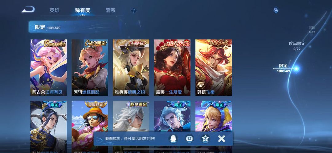 荣耀皮肤11个关羽花木诸葛李白武则天程咬金夏侯鲁班孙尚香小乔芈月限定皮肤108个