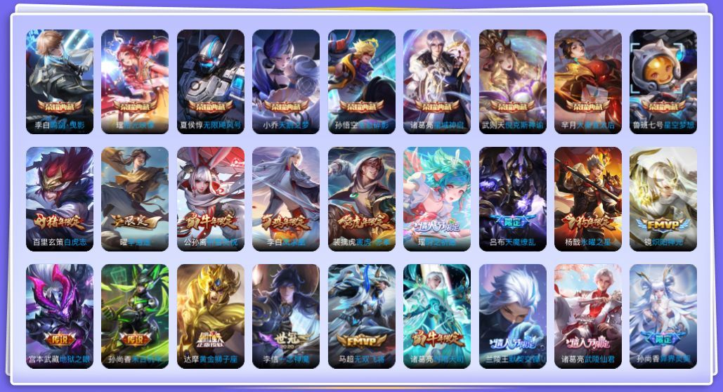装备描述:贵族等级: V10 英雄数: 125 皮肤数: 434 荣耀水晶: 武则天,天鹅之梦,星空梦想,倪克斯神谕,无限飓风号,大秦宣太后,鸣剑·曳影,全息碎影,星域神启 传说皮: 黄金狮子座,黄金射手座,冠军飞将,绛天战甲,久胜战神,炽阳神光,一念神魔,末日机甲-孙尚香,地狱火,仲夏夜之梦,音你心动-小乔,零号·赤焰,海洋之心,地狱之眼,飞鸢探春,音你心动-周瑜,胖达荣荣,李逍遥,乞巧织情,游龙清影,超时空战士-狄仁杰,遇见胡旋,挚爱之约,无双飞将,艾琳觅芳踪 限定皮: 冰锋战神,遇见飞天,李小龙,奔雷神使,祈雪灵祝,游园惊梦,梁祝,御风骁将,云端筑梦师,时雨天司,引擎之心,白鹤梁神女,魔法小厨娘,辉光之辰,异界灵契,白晶晶,天狼溯光者,天魔缭乱,神威,蜜橘之夏,永曜之星,奇迹圣诞,乒乒小将,天狼征服者,青春决赛季,逐梦之翼,天狼狩猎者,冰霜恋舞曲,天狼运算者,逐梦之星,逐梦之影,热情桑巴,逐梦之光,神奇女侠,凤求凰,寅虎·御盾,美猴王,白虎志,青龙志,瑞麟志,玄武志,朱雀志,凤凰于飞,梅西,如梦令-嫦娥,纯白花嫁,默契交锋-兰陵王,真爱至上,一生所爱,武陵仙君,如梦令-后羿,大圣娶亲,默契