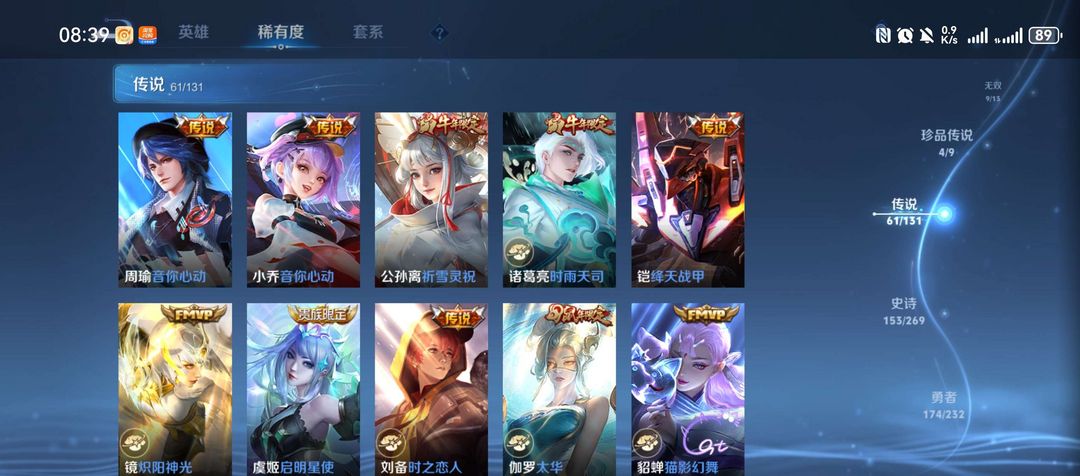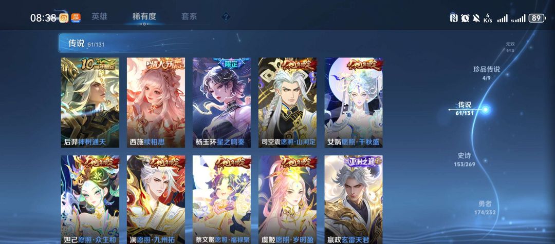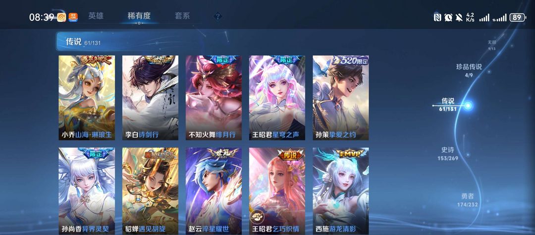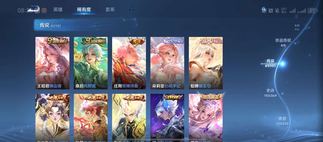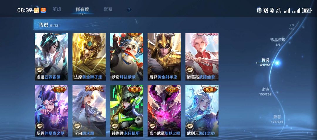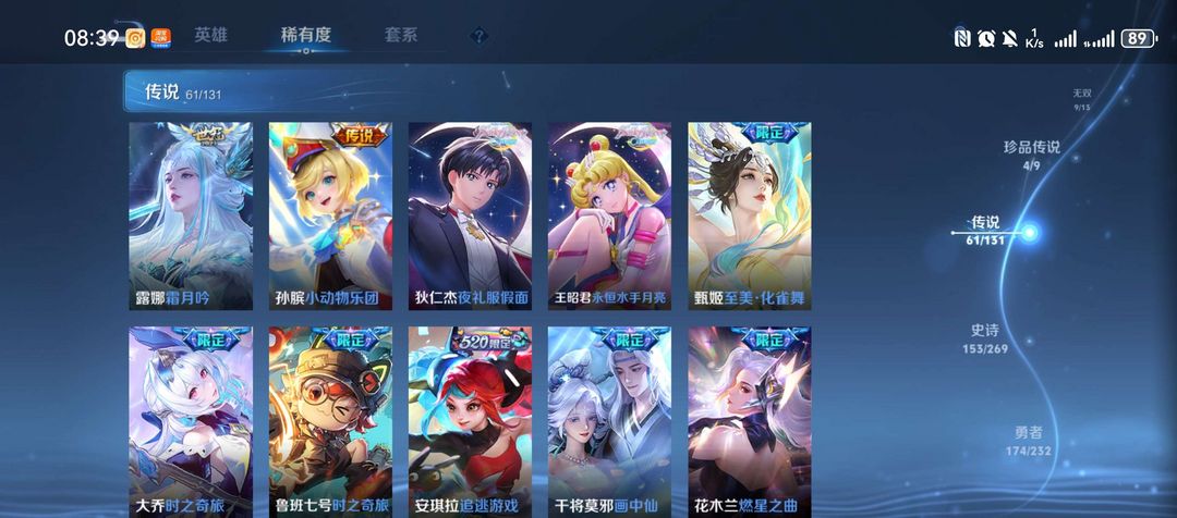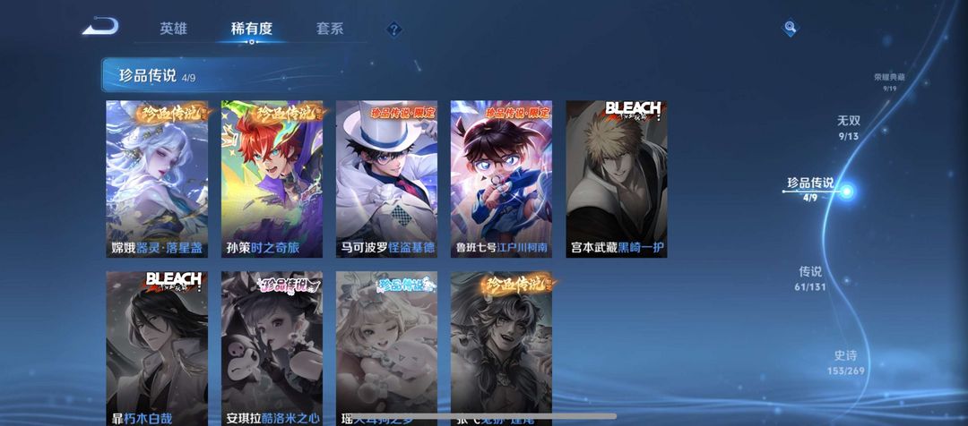 装备描述:皮肤收藏拉满:拥有9款荣耀典藏(伽罗最初的交响、瑶拾光映像、李白鸣剑・曳影、武则天倪克斯神谕等吕布)、9 款无双限定(诸葛亮天机白泽、曜器灵・螭龙剑、公孙离离恨烟等)、4 款珍品传说(马可波罗怪盗基德,鲁班七号柯蓝,嫦娥器灵・落星盏、孙策时之奇旅等),传说皮肤累计 61款,收藏家等级达95 级大师,皮肤总数 492款,限定、史诗等各类皮肤覆盖面极广,视觉与收藏价值兼备。