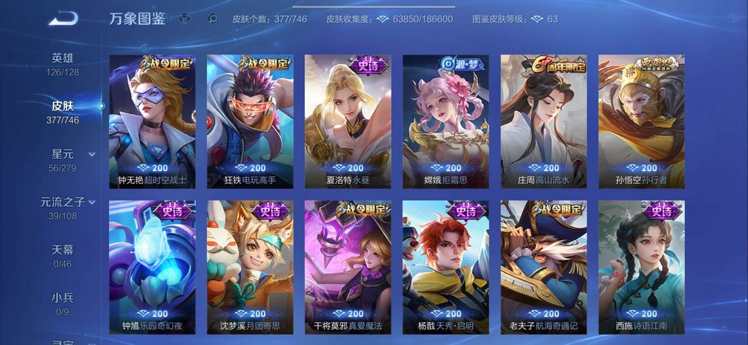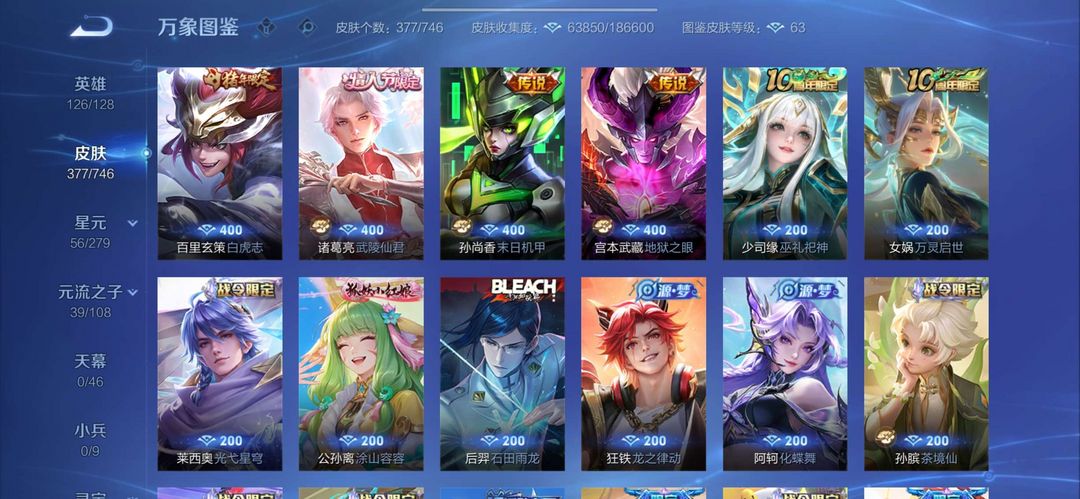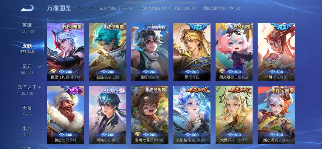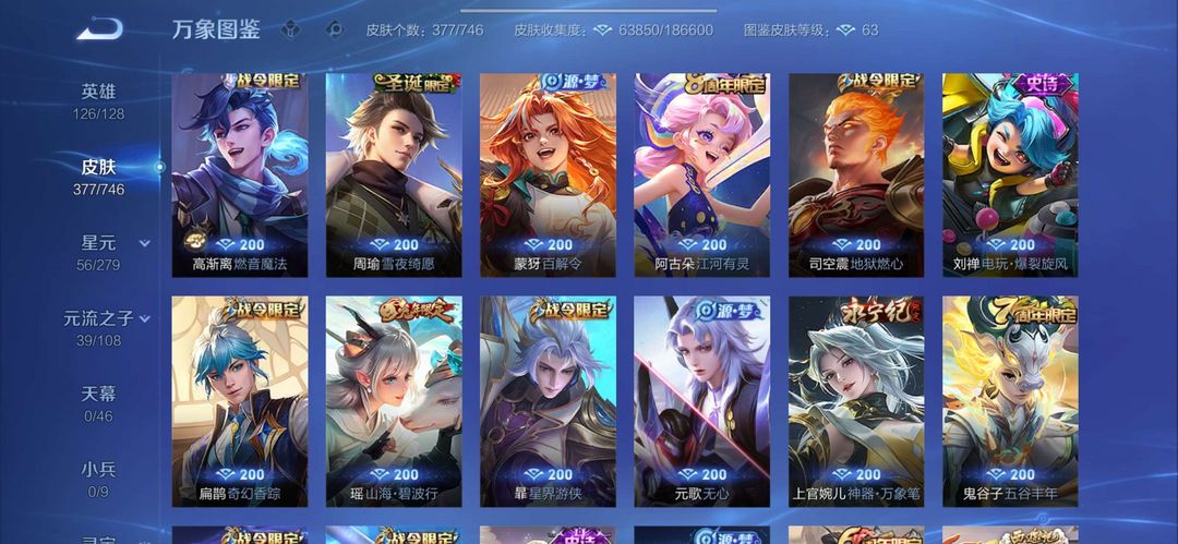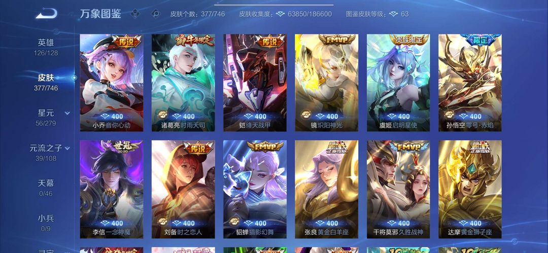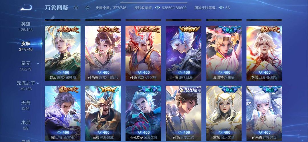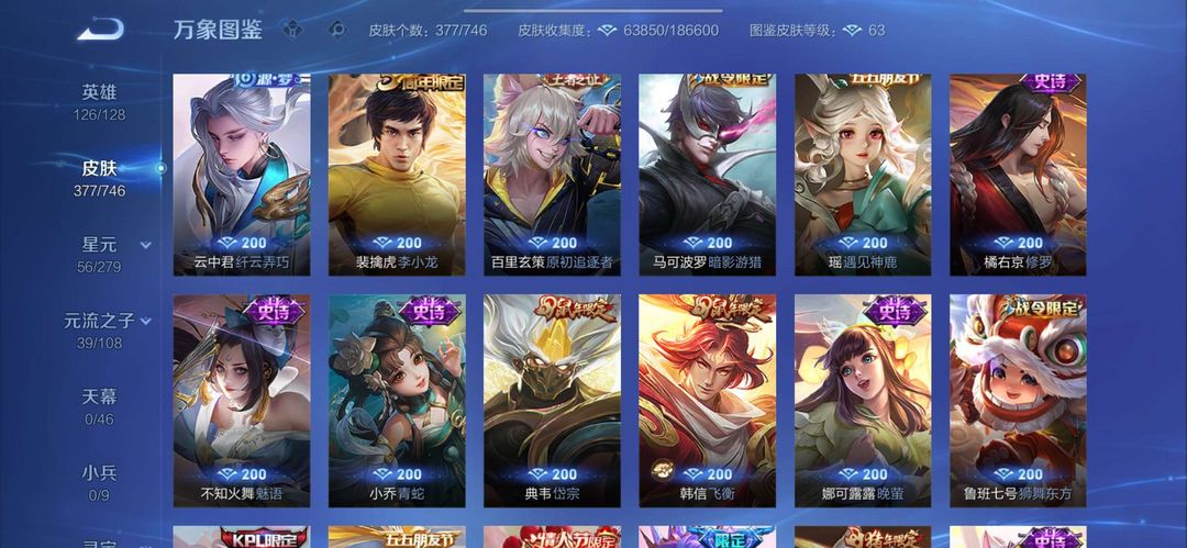 v9,373个皮肤,韩信,关羽,猴子,瑶典藏,公孙离无双,龙年限定全套。