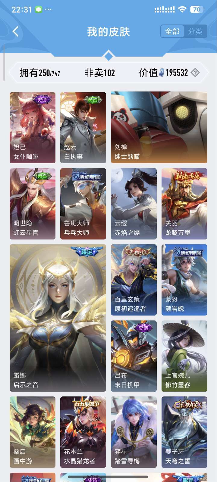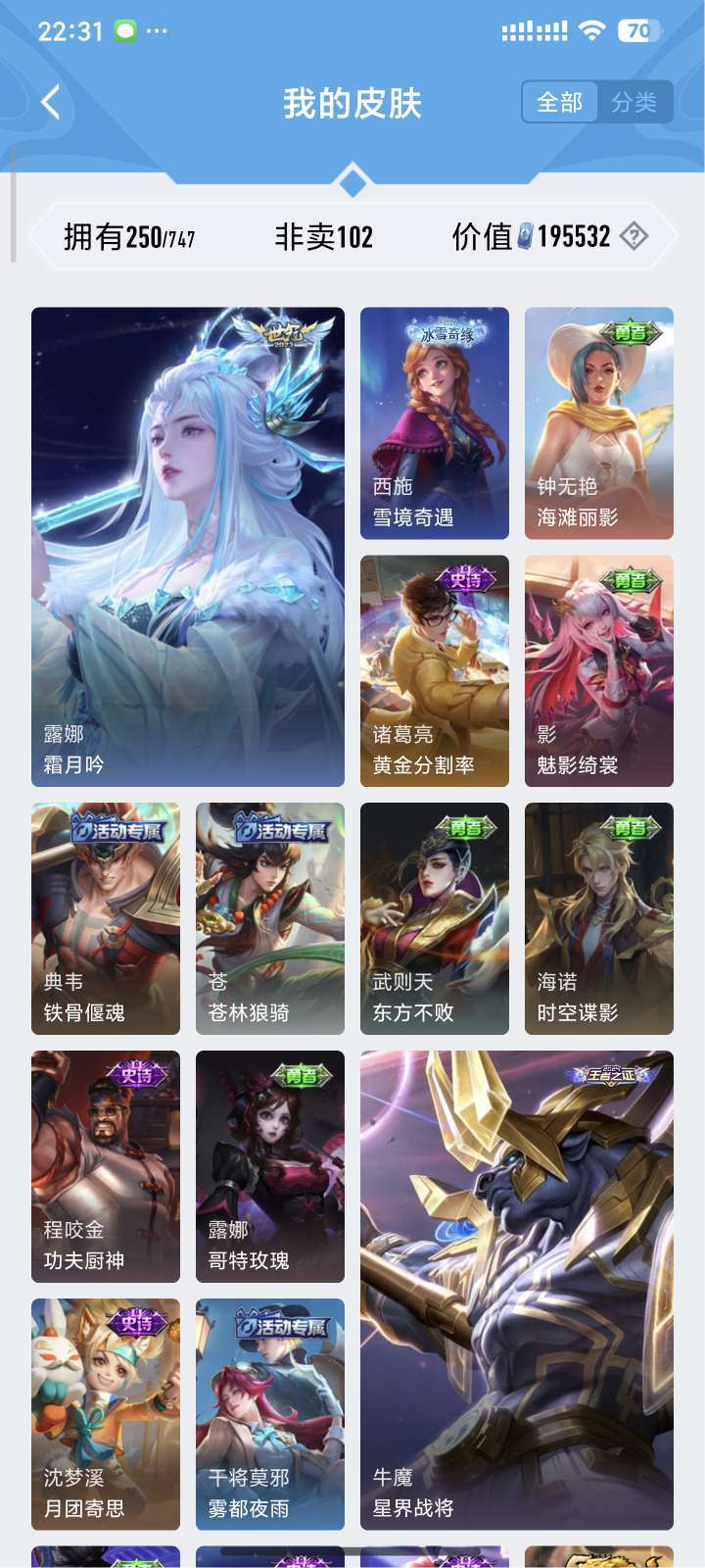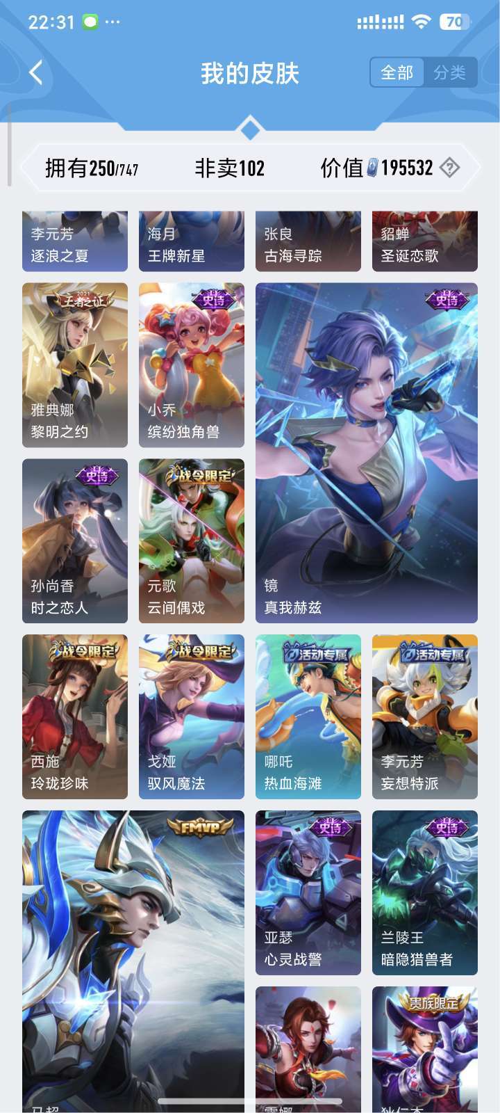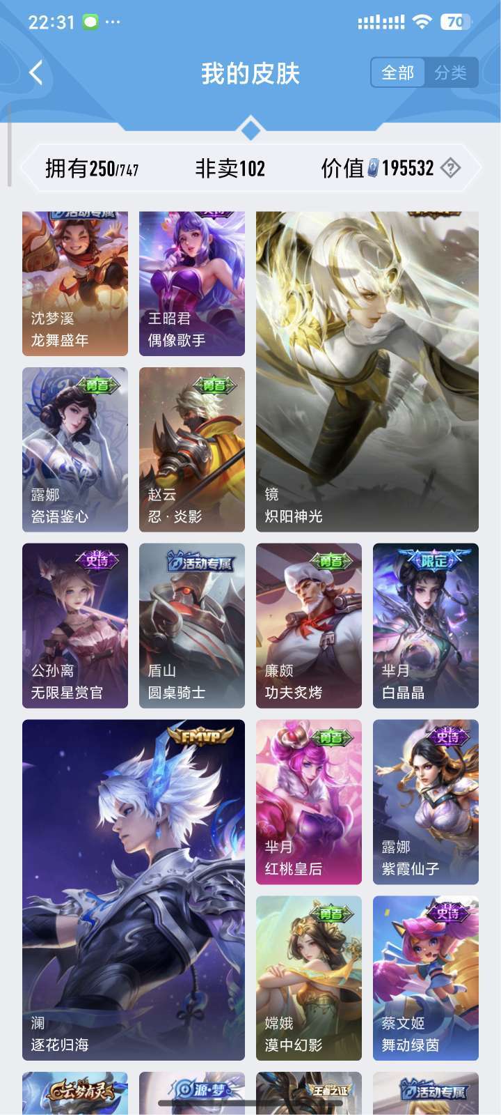 装备描述:镜全皮 露娜全皮 达摩黄金狮子座 夏洛特浮生妄 澜随花逐海 李信炽霜斩 刘备时之恋人 镜炽阳神光 露娜霜月吟