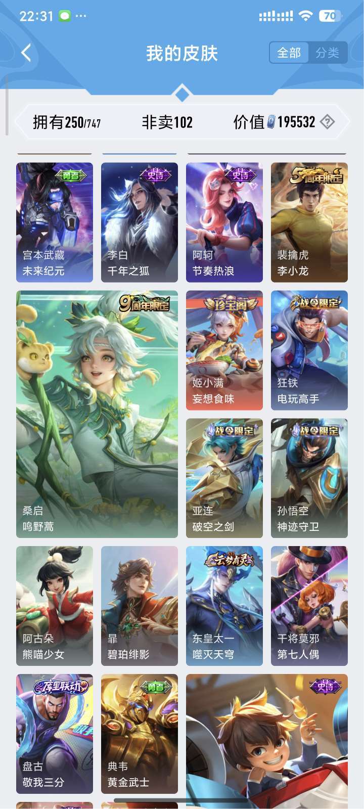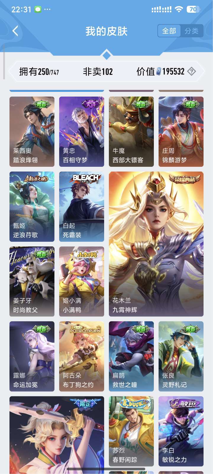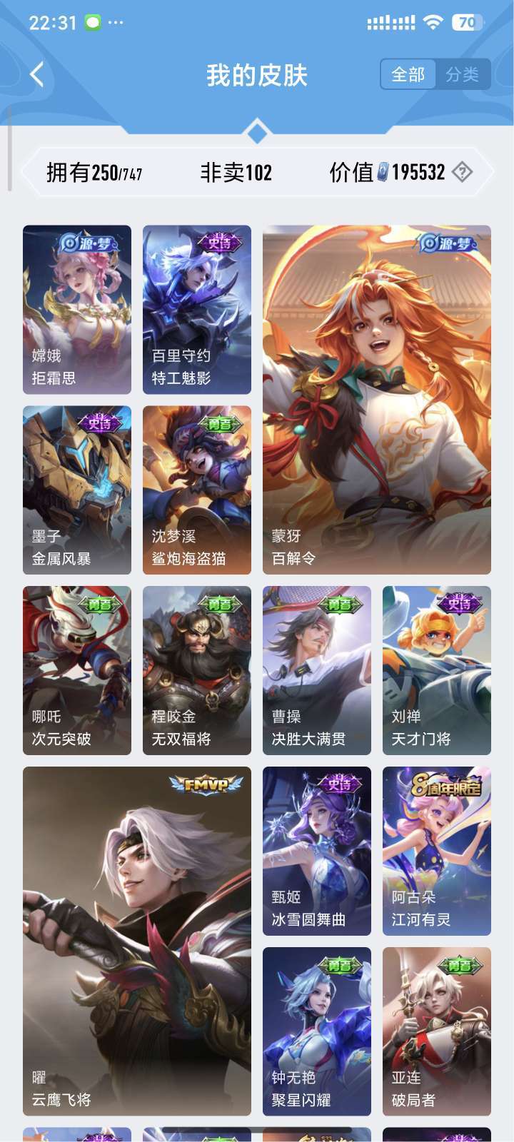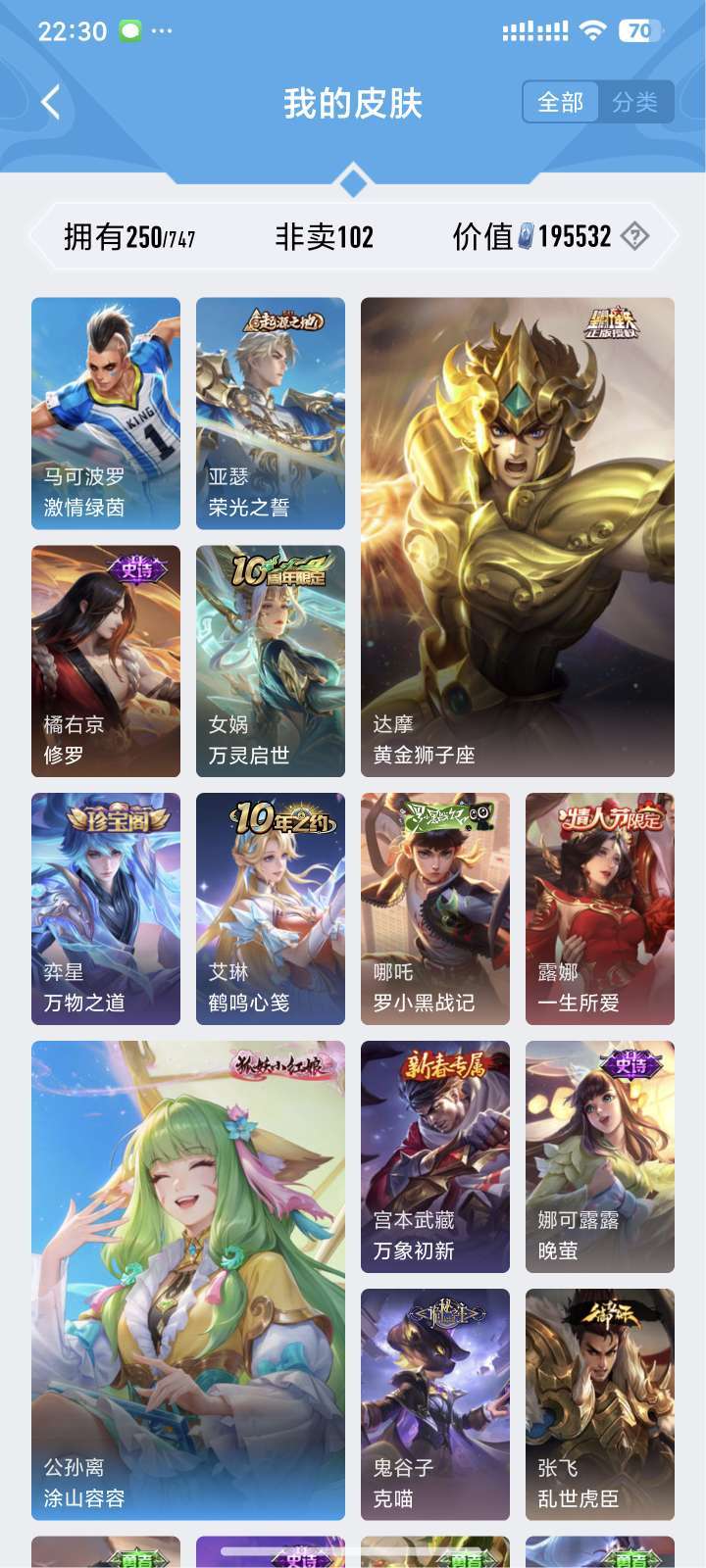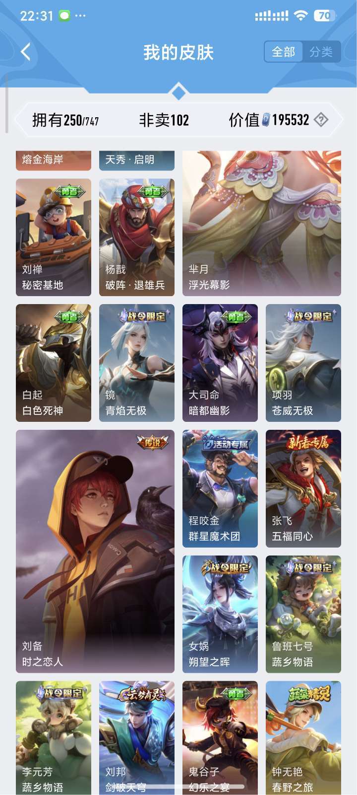 装备描述:镜全皮 露娜全皮 达摩黄金狮子座 夏洛特浮生妄 澜随花逐海 李信炽霜斩 刘备时之恋人 镜炽阳神光 露娜霜月吟