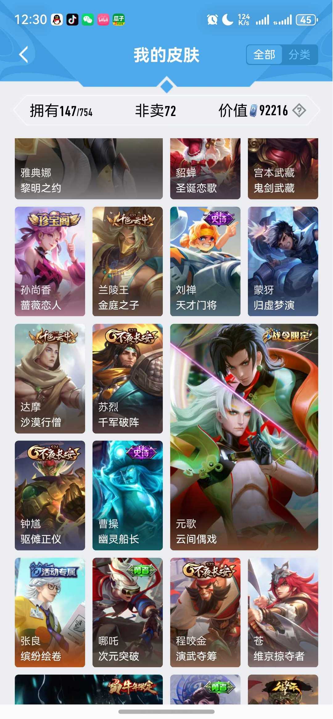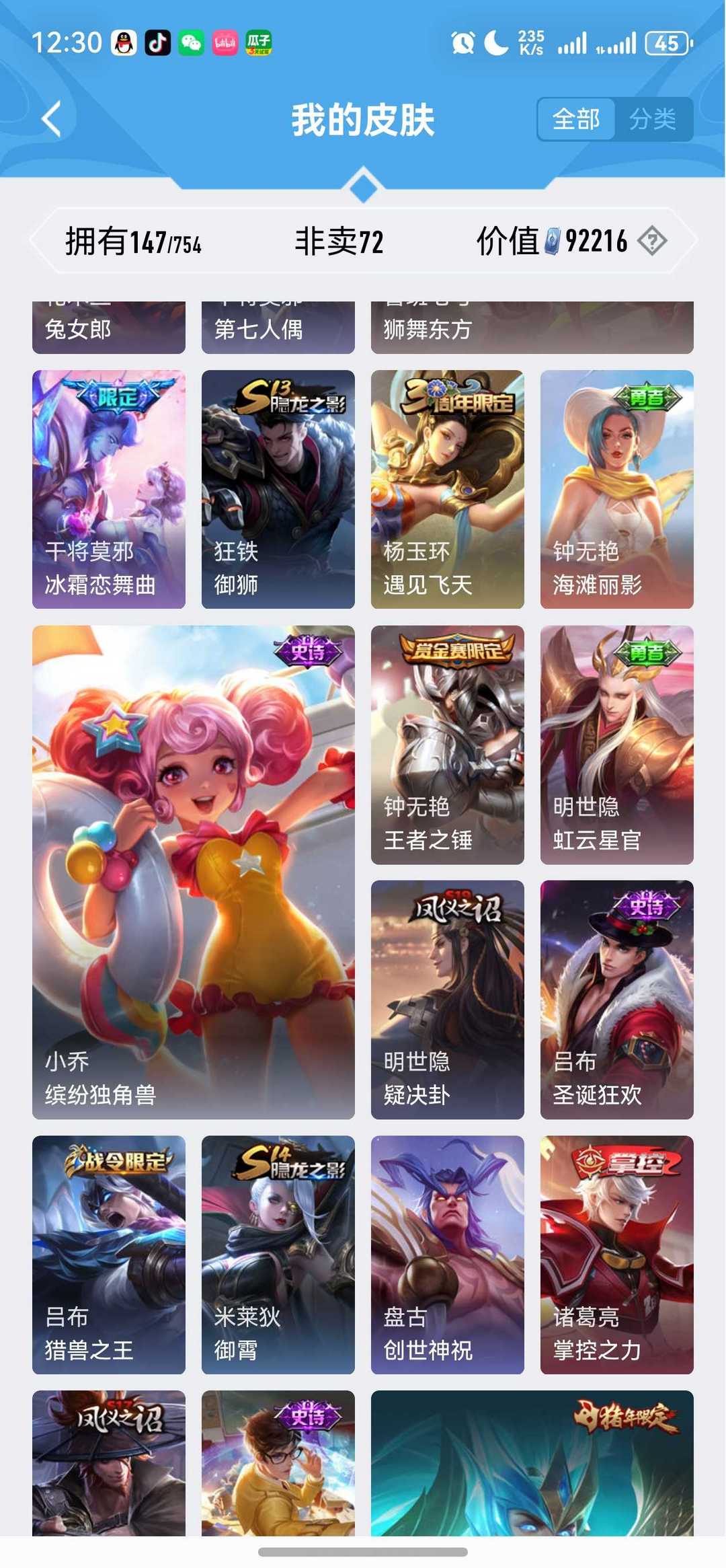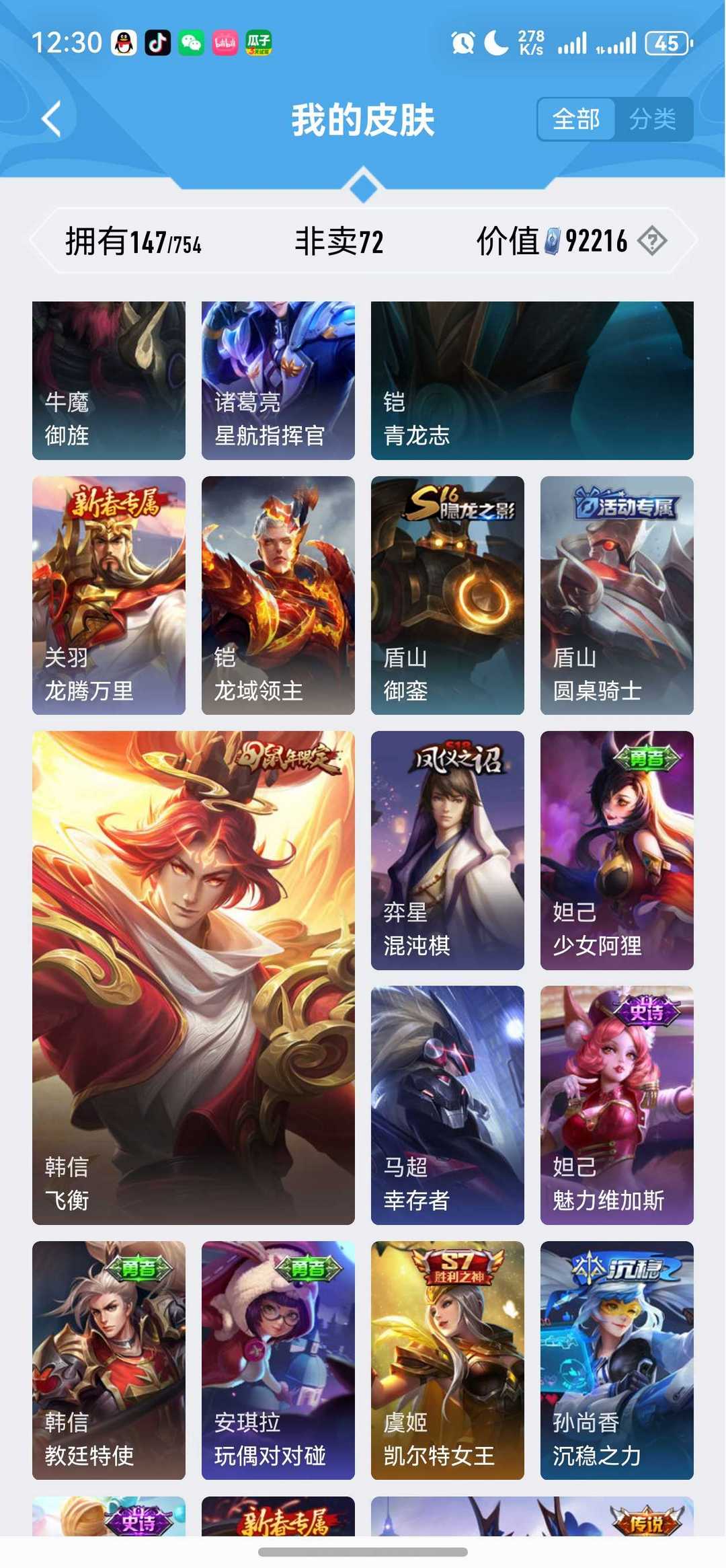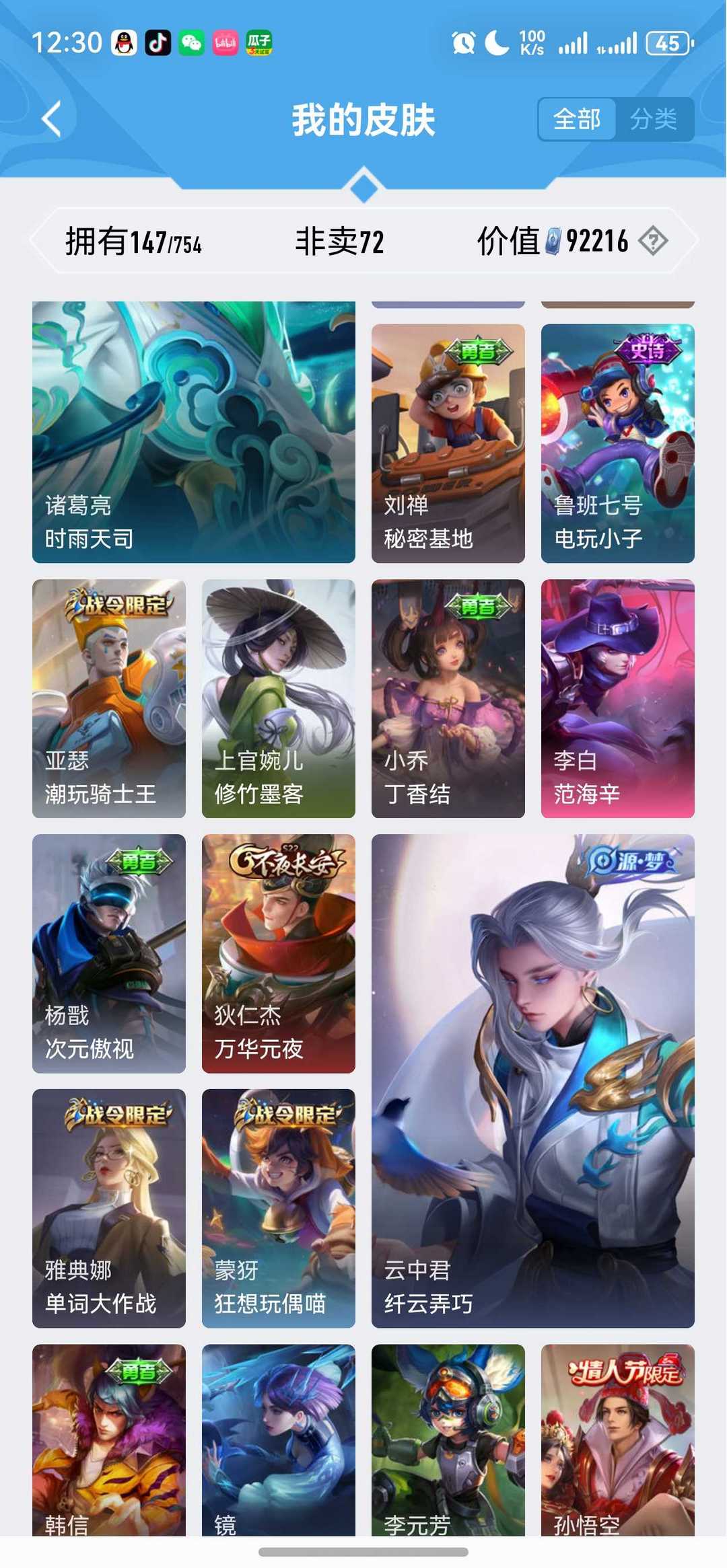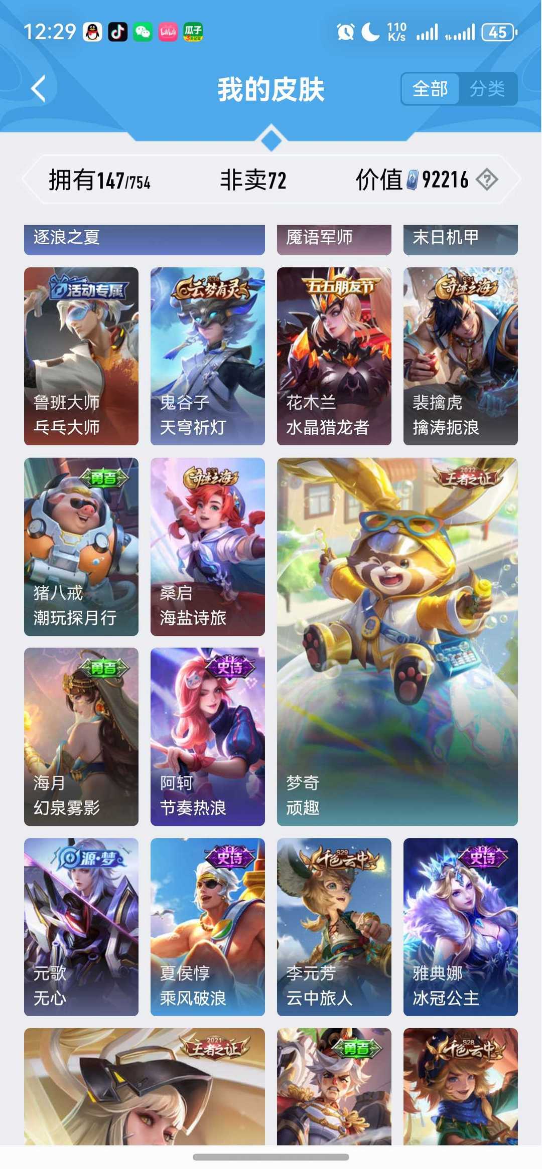 诸葛亮 时雨天司、黄金分割率等皮肤、花木兰、水晶、猎龙者、貂蝉、仲夏夜之梦、韩信、街头霸王、裴擒虎、