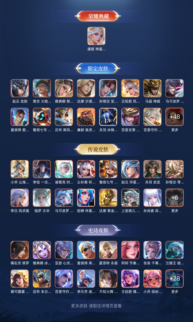 装备描述:v8 368个皮肤超多限定皮肤多传说多限定史诗无双小乔,虞姬典藏,两个柯南限定至尊宝凤求凰等皮肤