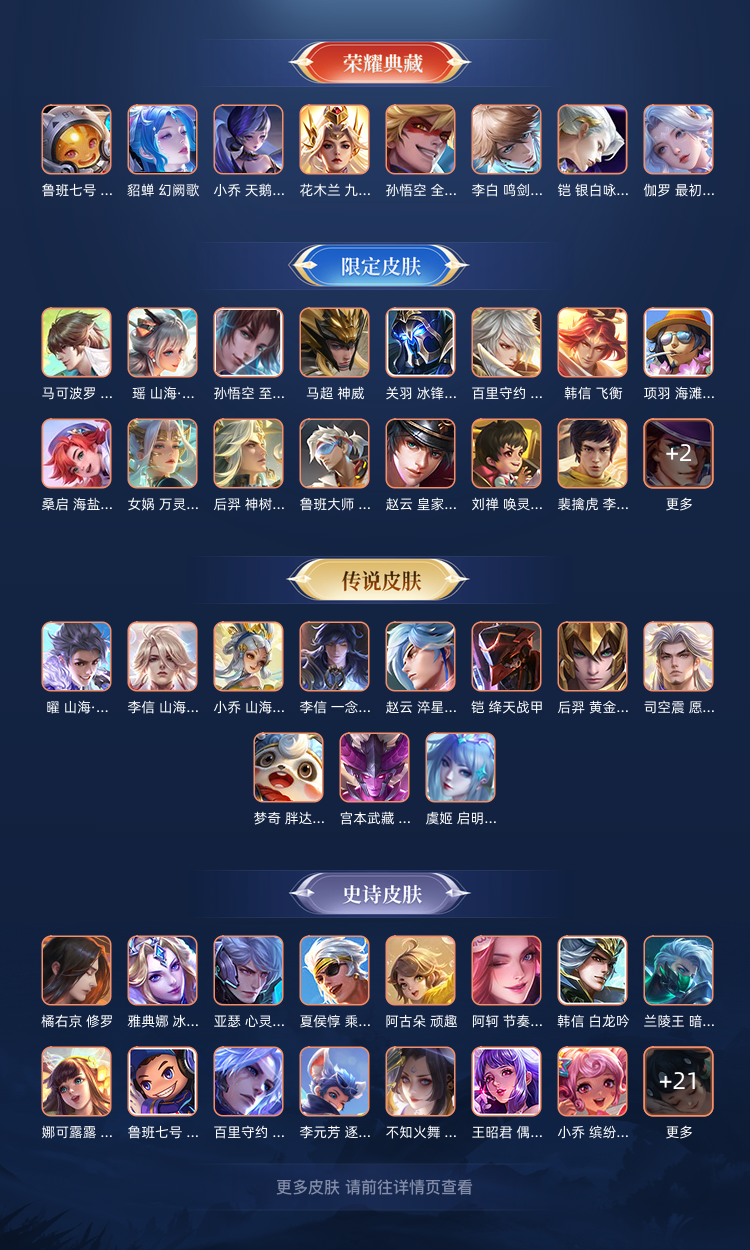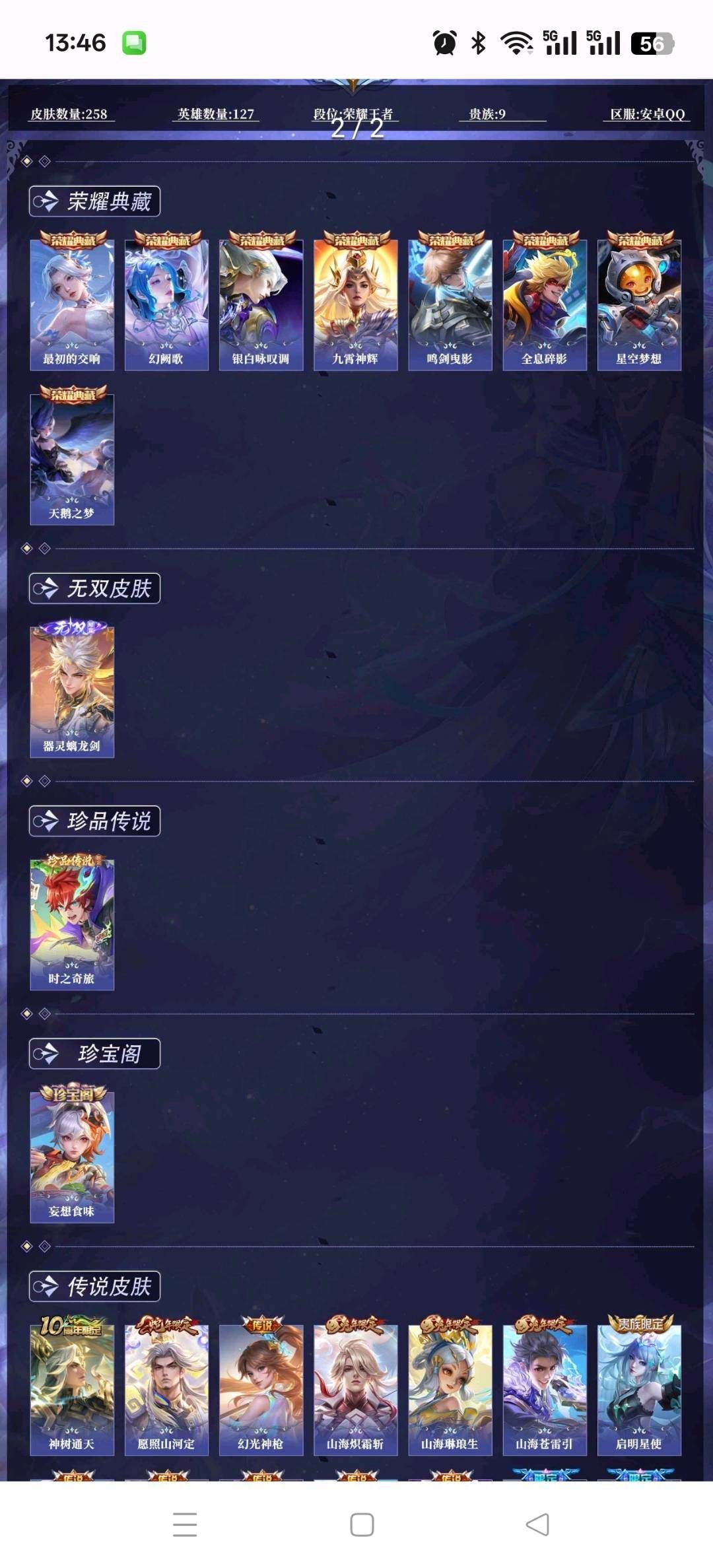 装备描述:贵族等级V9,段位荣耀王者,英雄数量127,典藏皮肤数8,皮肤数量259,天鹅之梦/至尊宝/星空梦想/器灵·螭龙剑/鸣剑·曳影/幻阙歌/鹤羽星尊/时之奇旅(孙策)/最初的交响/神威/炽阳神光/九霄神辉/神树通天/银白咏叹调/愿照·山河定/天鹅之梦/至尊宝/星空梦想/器灵·螭龙剑/鸣剑·曳影/幻阙歌/鹤羽星尊/时之奇旅(孙策)/最初的交响/神威/炽阳神光/九霄神辉/神树通天/银白咏叹调/愿照·山河定