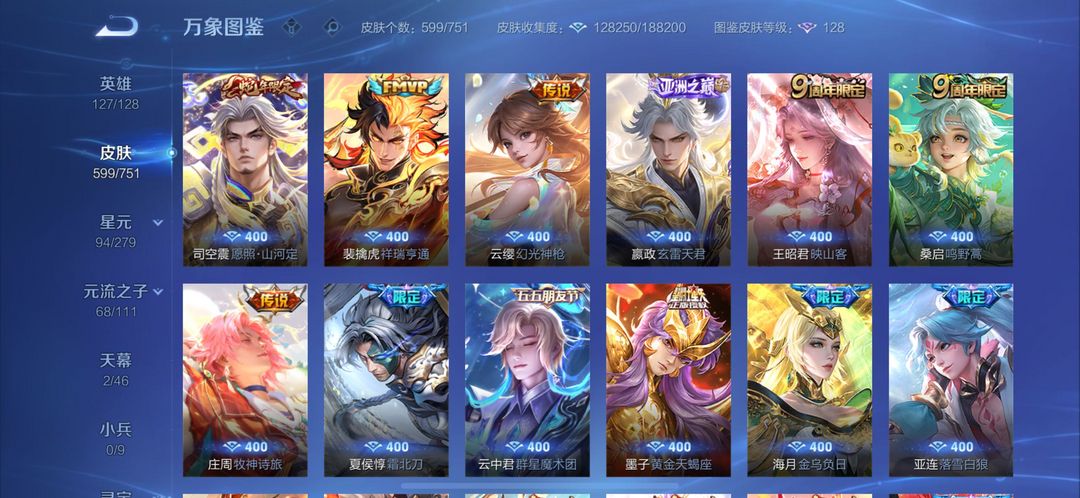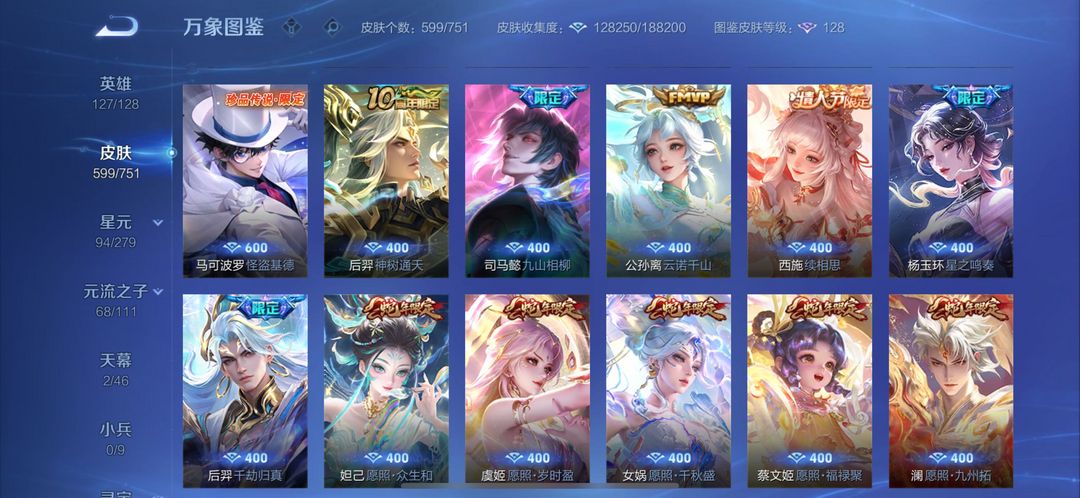 装备描述:【省标4】 贵族无双10 荣耀典藏8无双8珍品传说9发育路46段,皮肤数量599,天幕2 累计充值近8万,5快一小时绝对不贵,欢迎来