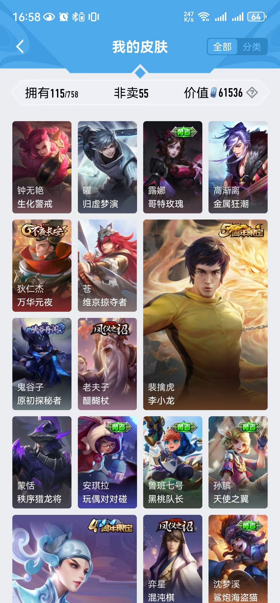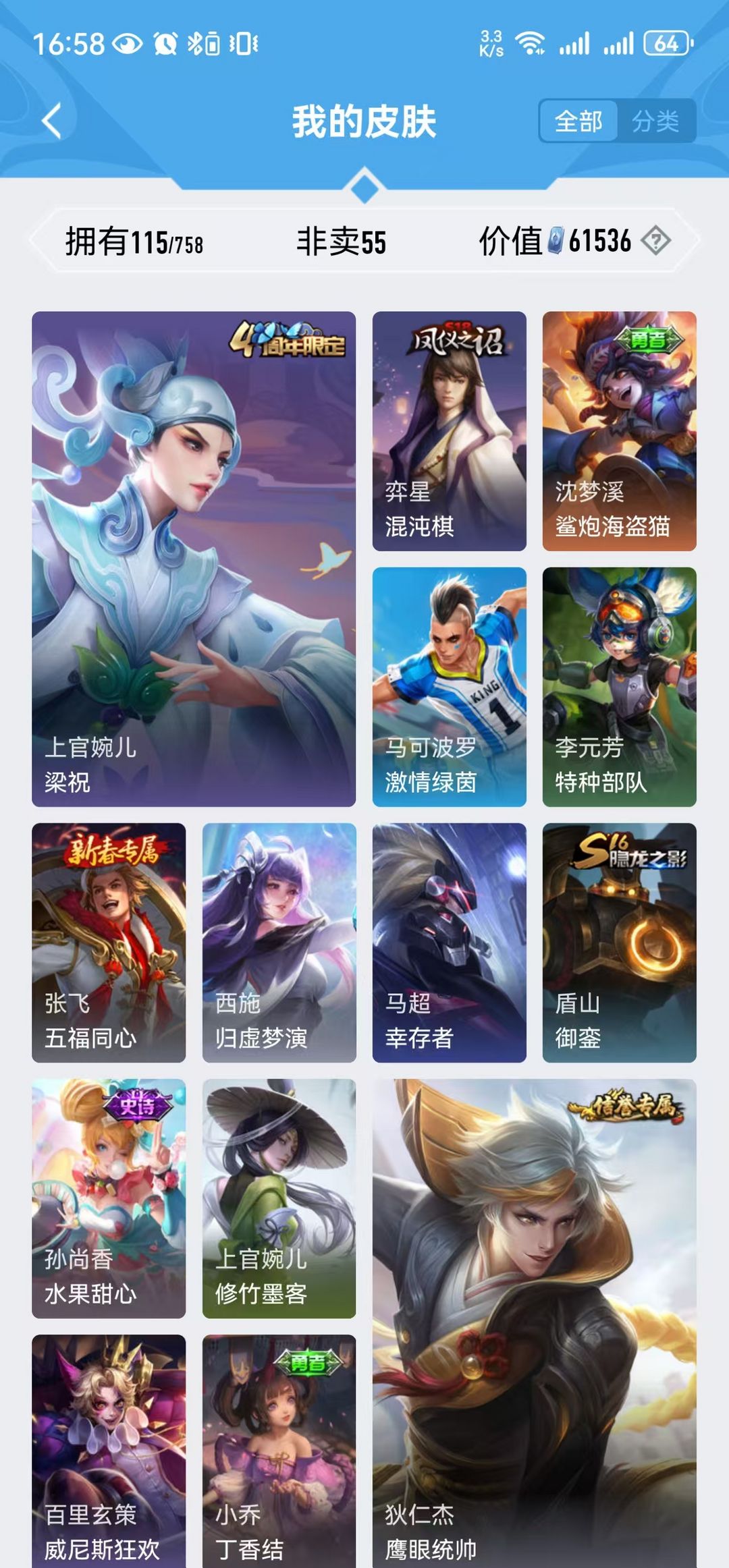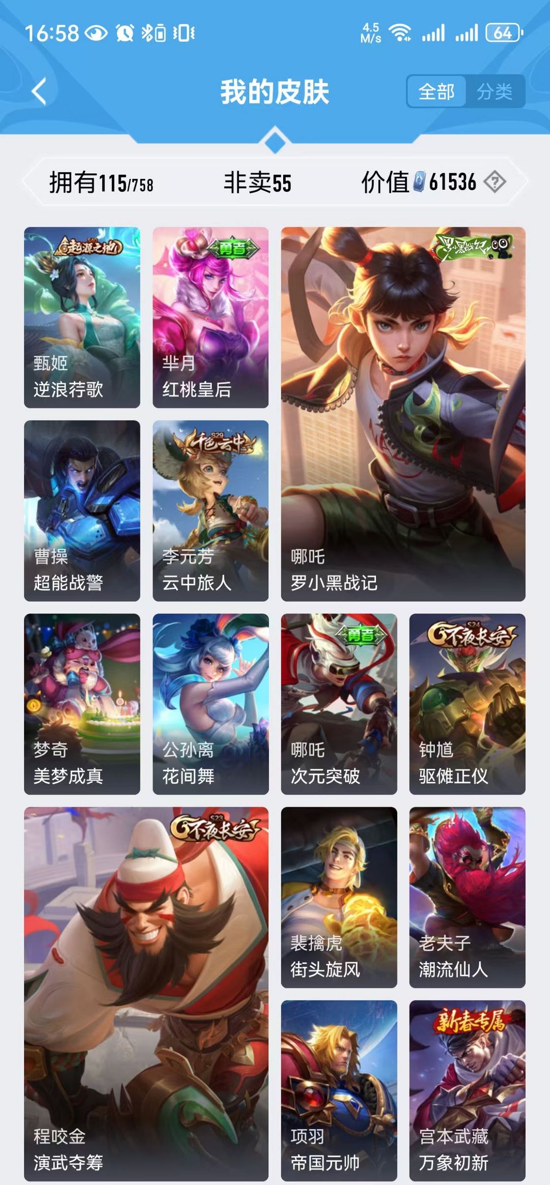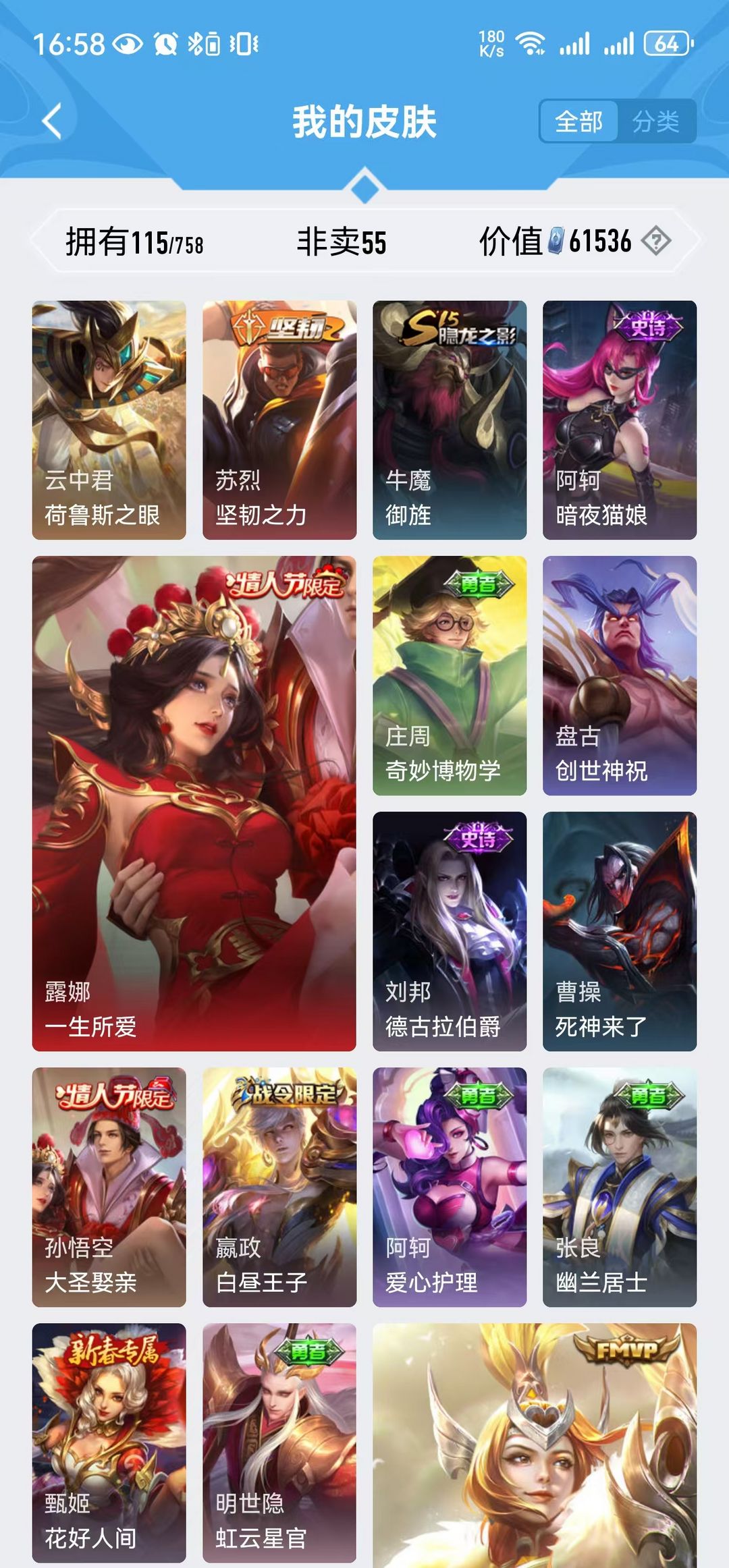 装备描述:露娜一生所爱 花木兰冠军飞将鲁班七号(鲁班七号 黑桃队长);伽罗(伽罗 花见巫女);苍(苍 维京掠夺者);孙权;戈娅;诸葛亮(诸葛亮 星航指挥官);艾琳;孙尚香(孙尚香 水果甜心);孙悟空(孙悟空 大圣娶亲,孙悟空 至尊宝,孙悟空 地狱火);花木兰(花木兰 冠军飞将,花木兰 兔女郎);元歌(元歌 午夜歌剧院);墨子(墨子 进击墨子号);牛魔(牛魔 御旌);莱西奥;李白(李白 凤求凰,李白 千年之狐,李白 范海辛);韩信(韩信 教廷特使);狄仁杰(狄仁杰 万华元夜,狄仁杰 鹰眼统帅,狄仁杰 魔术师,狄仁杰 阴阳师,狄仁杰 锦衣卫);貂蝉(貂蝉 圣诞恋歌);干将莫邪;吕布(吕布 猎兽之王);百里守约;后羿;赵云(赵云 嘻哈天王,赵云 皇家上将);宫本武藏(宫本武藏 万象初新,宫本武藏 霸王丸);兰陵王(兰陵王 隐刃);钟馗(钟馗 驱傩正仪,钟馗 地府判官);刘邦(刘邦 德古拉伯爵);曹操(曹操 超能战警,曹操 死神来了,曹操 烛龙);雅典娜(雅典娜 战争女神);庄周(庄周 奇妙博物学,庄周 蜃楼王);李信(李信 灼热之刃);铠(铠 龙域领主);露娜(露娜 哥特玫瑰,露娜 一生所爱);虞姬(