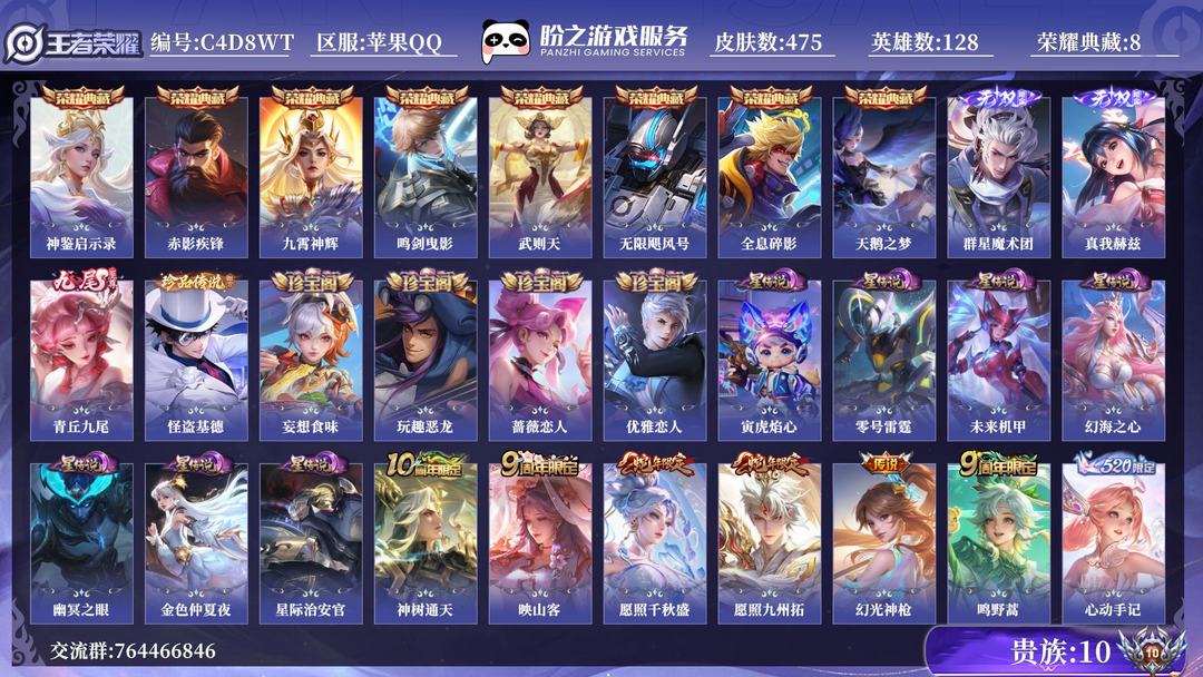 装备描述:贵族10 荣耀典藏8 无双3 珍品传说1 星传说7 传说皮肤61 星元套装29 史诗皮肤142 发育路28段 皮肤数量475 皮肤价值:499596 天幕3 英雄128 尊贵铂金II