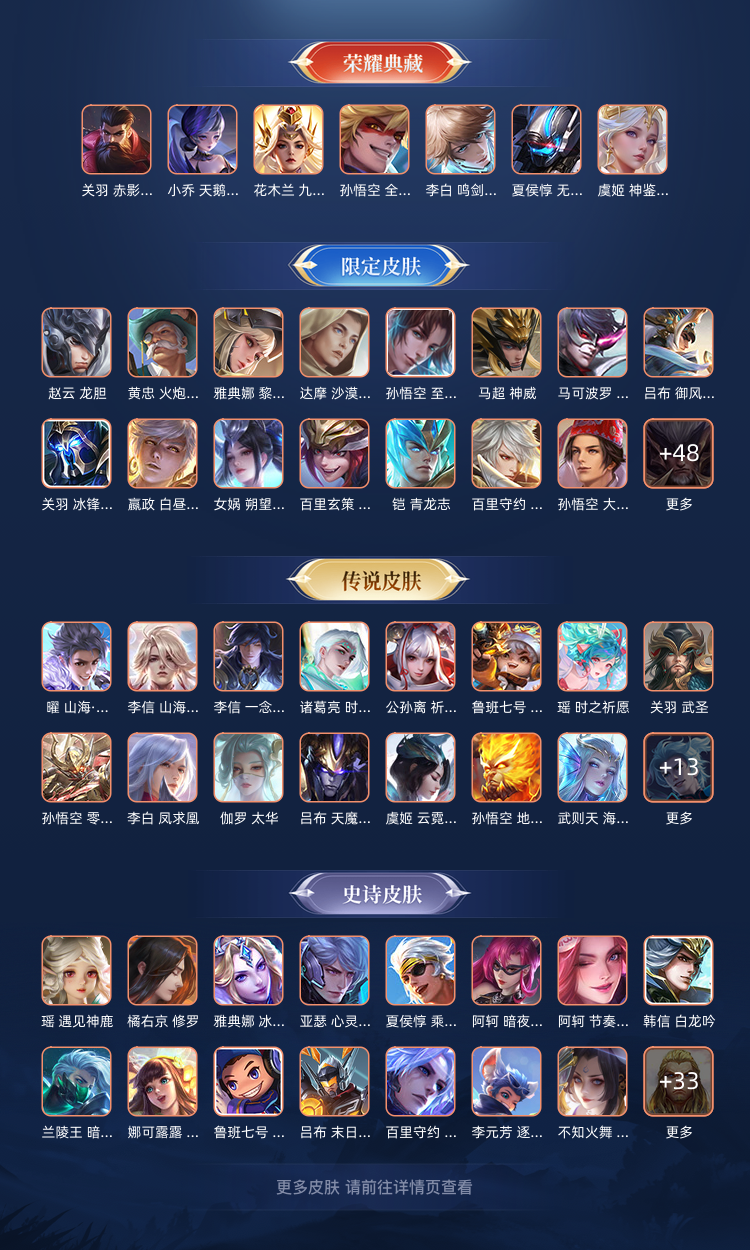 贵族10 荣耀典藏8 无双3 珍品传说1 星传说7 传说皮肤61 星元套装29 史诗皮肤142 发育