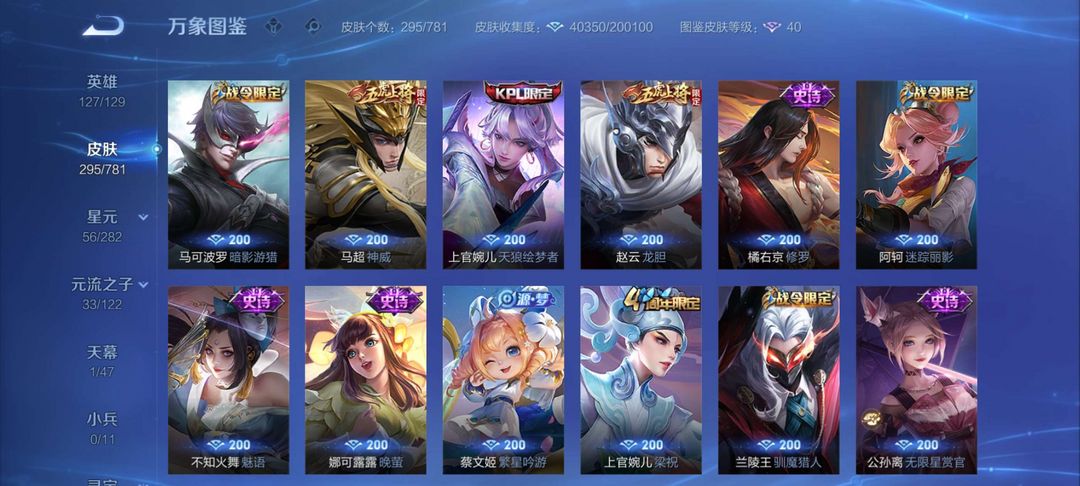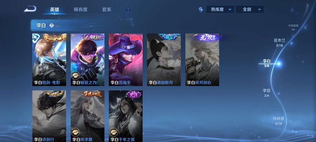 二典藏鸣剑戈影,千魇归渊,神威,龙胆,李逍遥,未来机甲,幽冥之眼,295皮肤,全铭文,满级等级