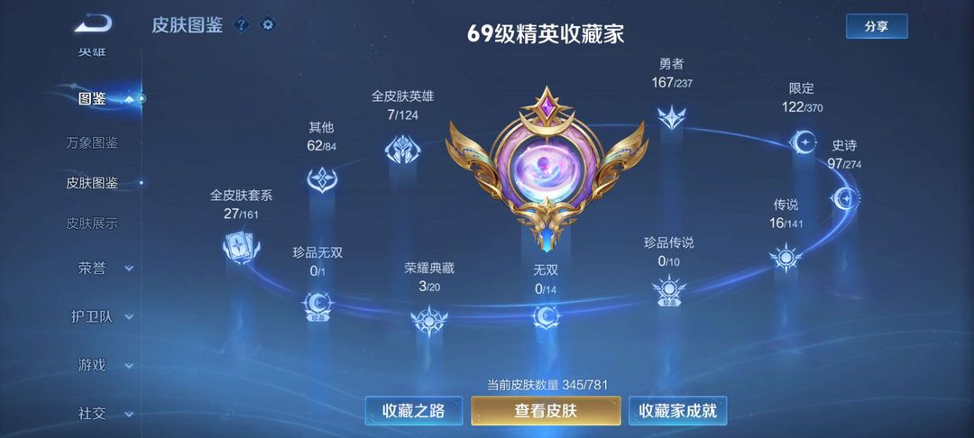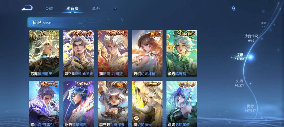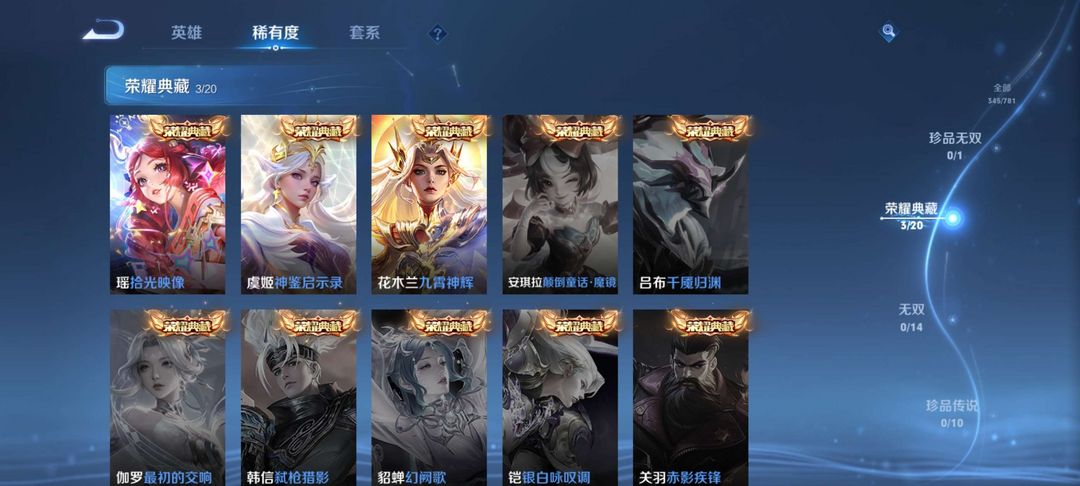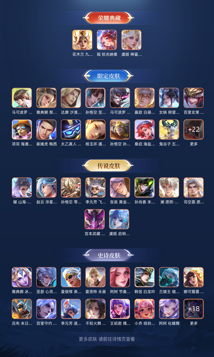 装备描述:英雄差个武则天,三个荣耀典藏,2个星传说,总共345个皮肤基本上每个英雄都有皮肤