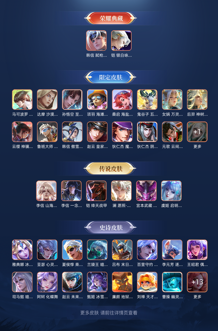 2个荣耀铠和韩信,一个李信无双,126个英雄,296个皮肤,满级铭文。