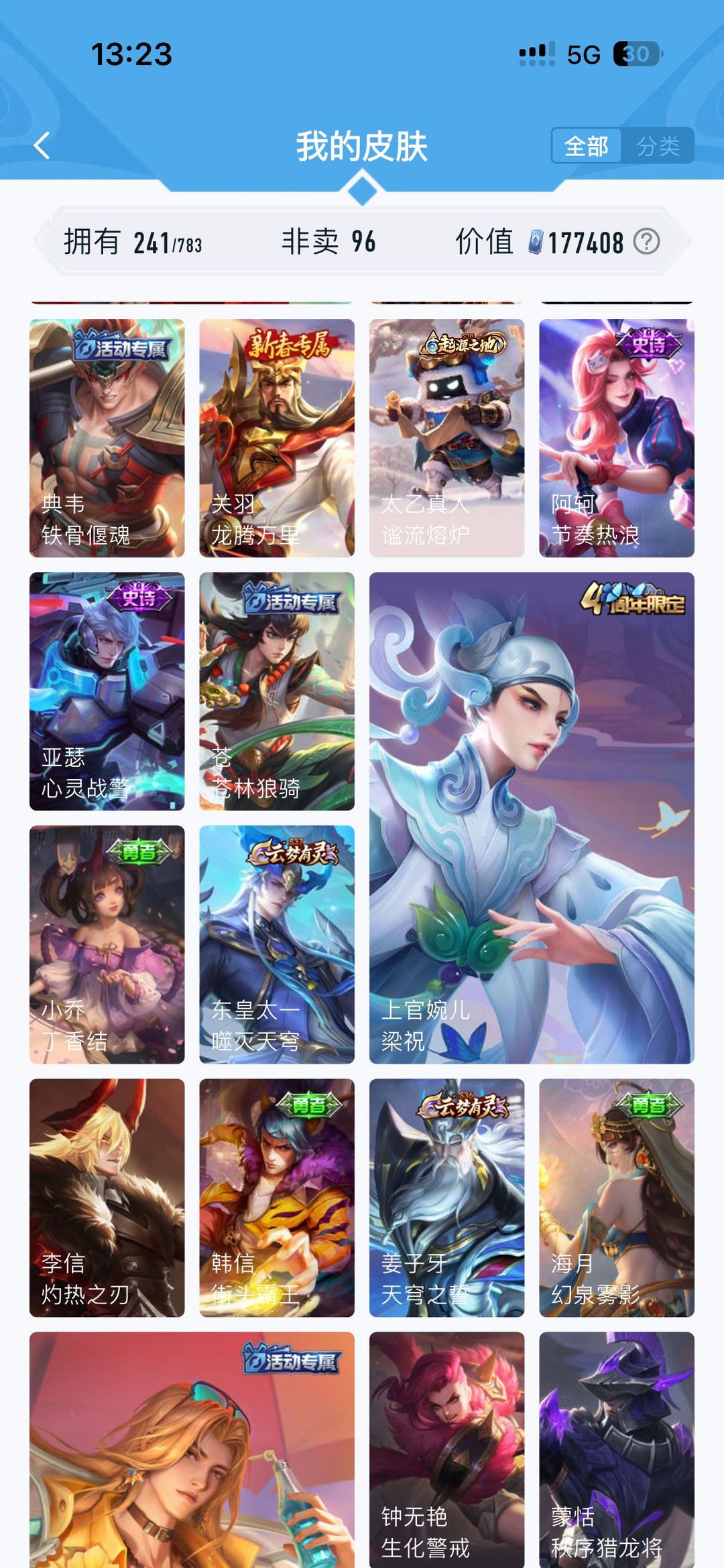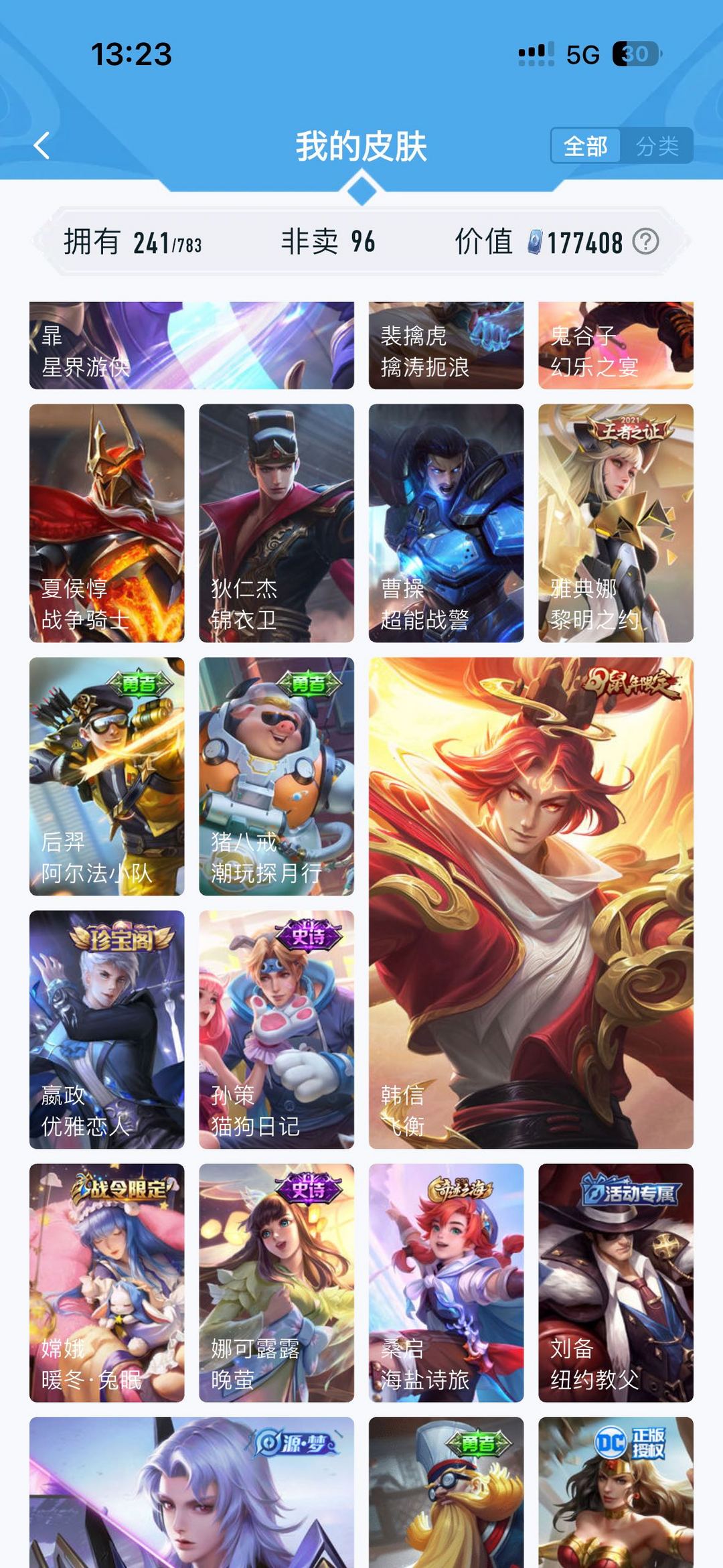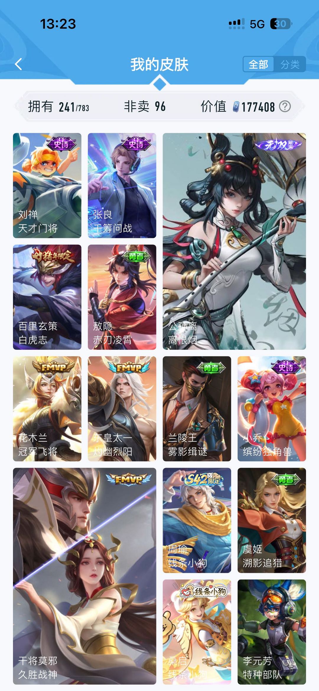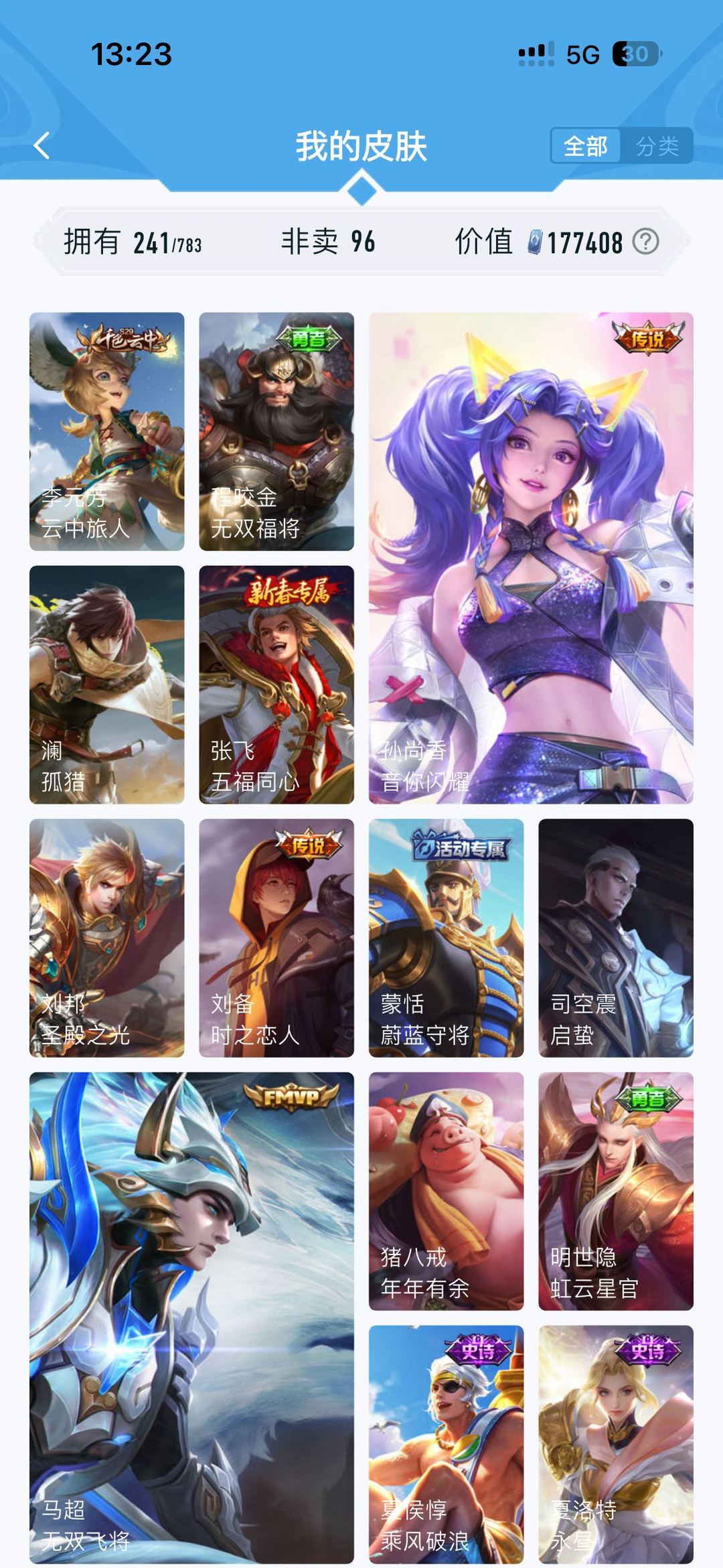 公孙离无双牛年限定 虞姬典藏 韩信飞衡 雅典娜神奇队长 玄策白虎志 马超fmvp 神威 干将fmvp