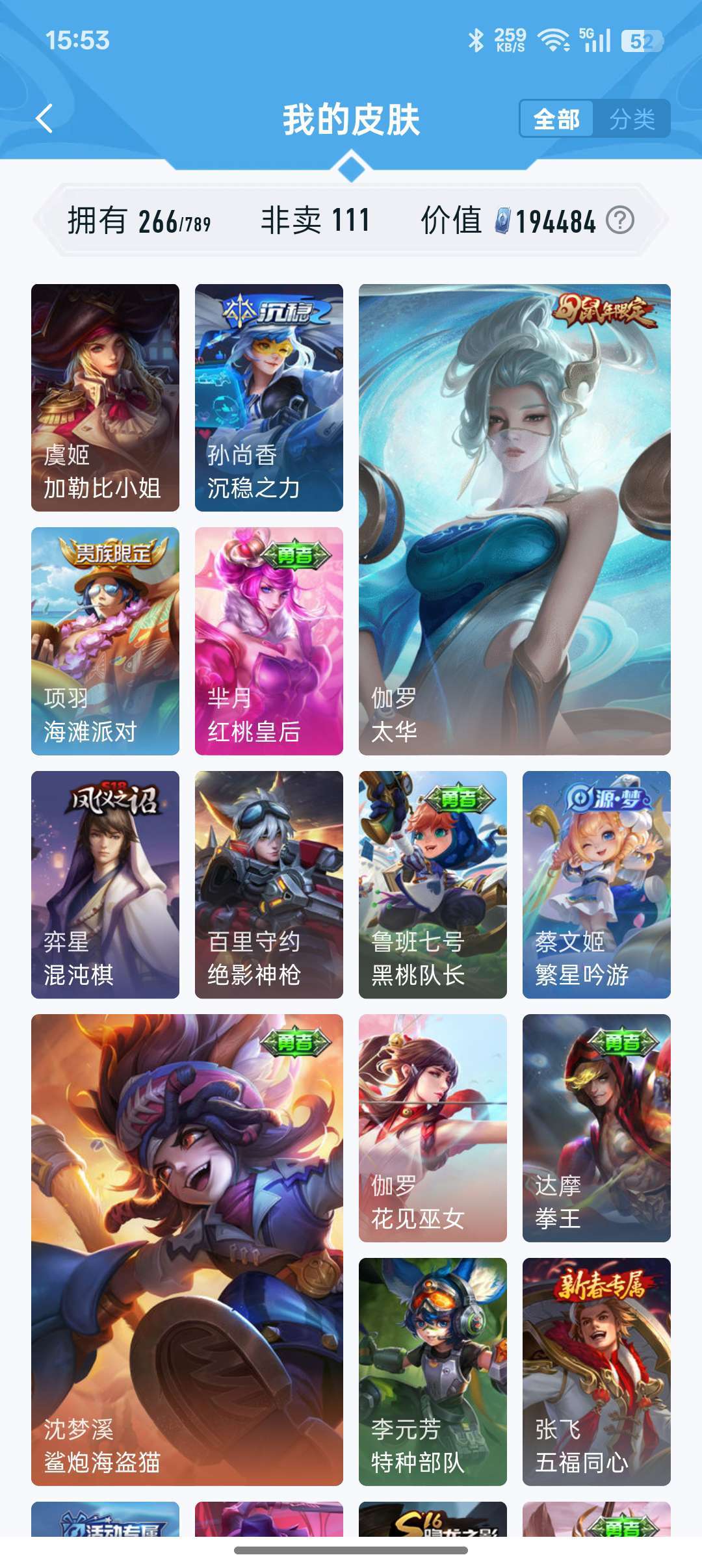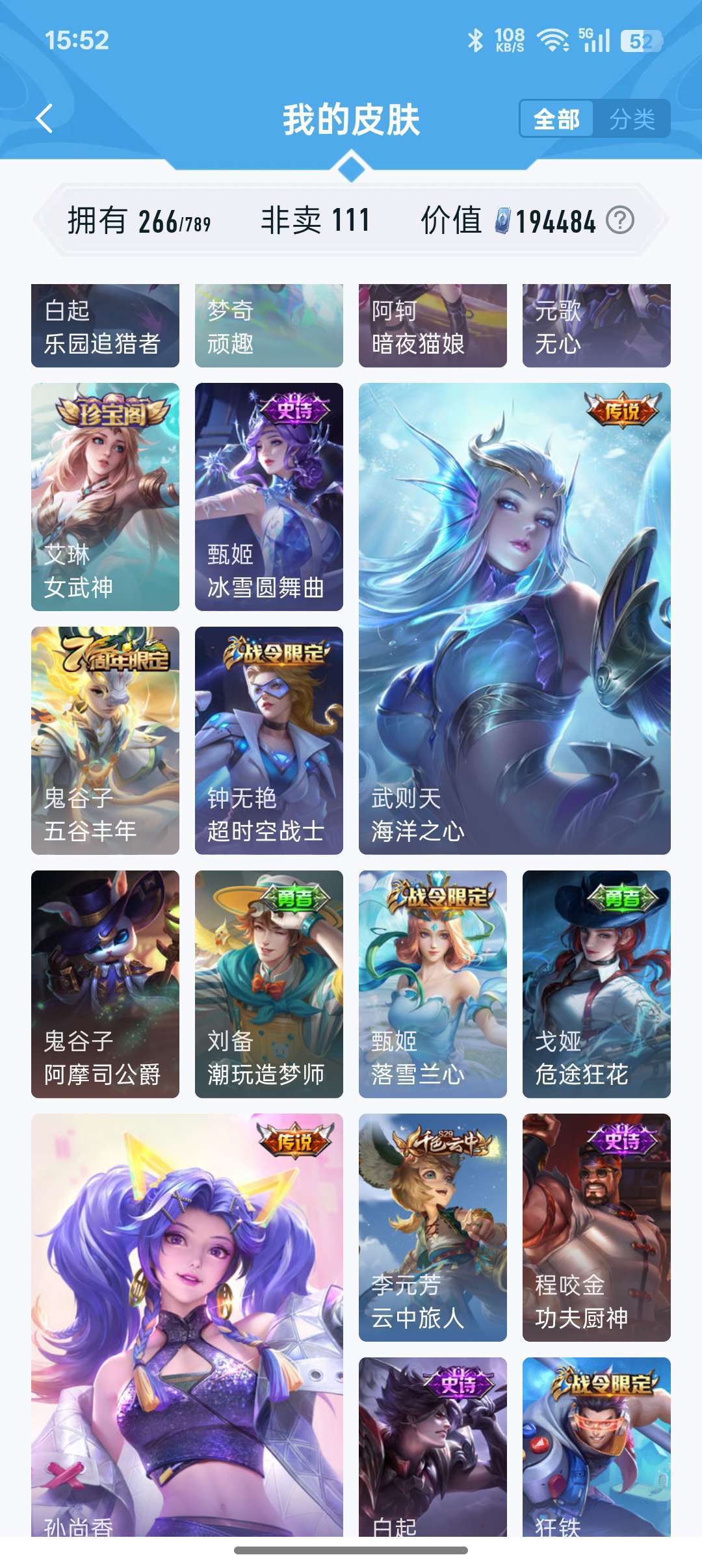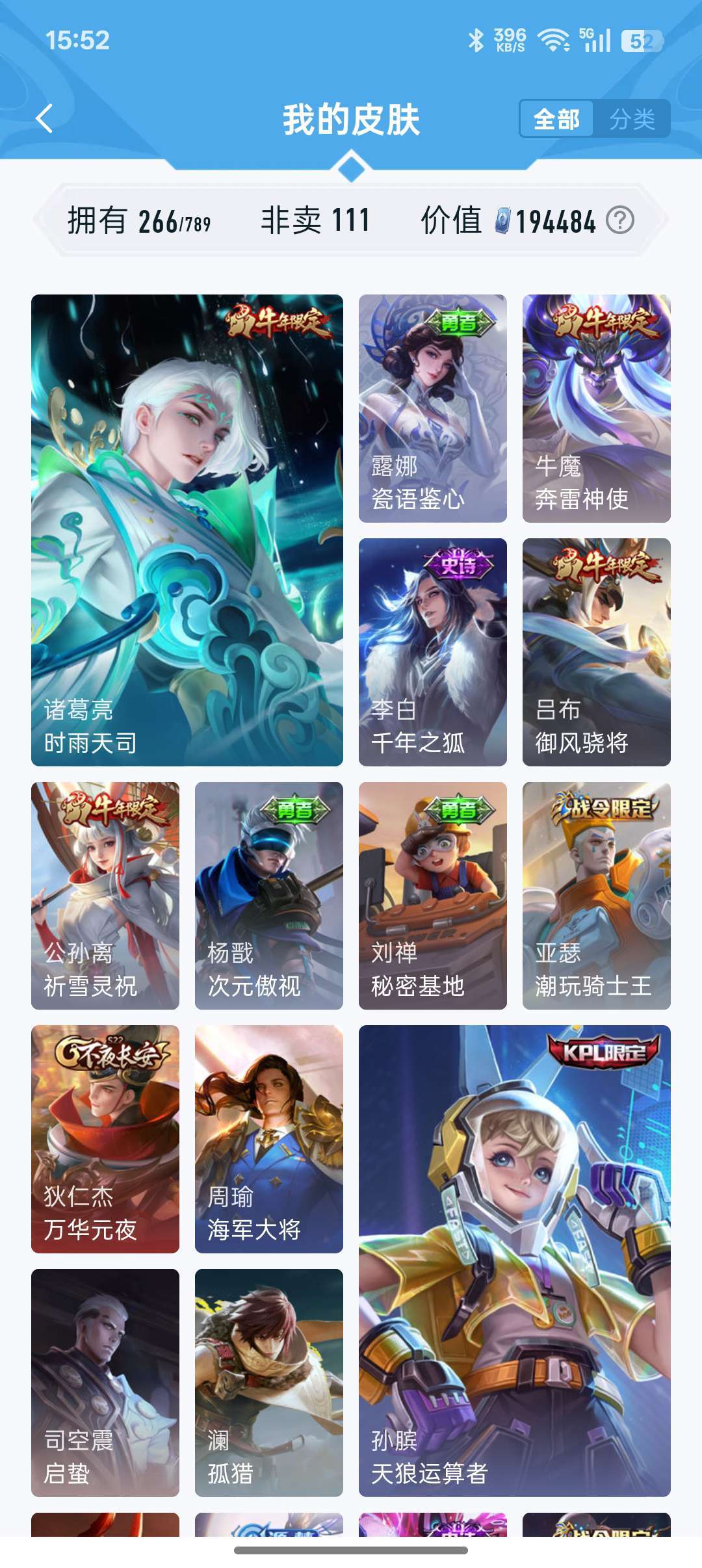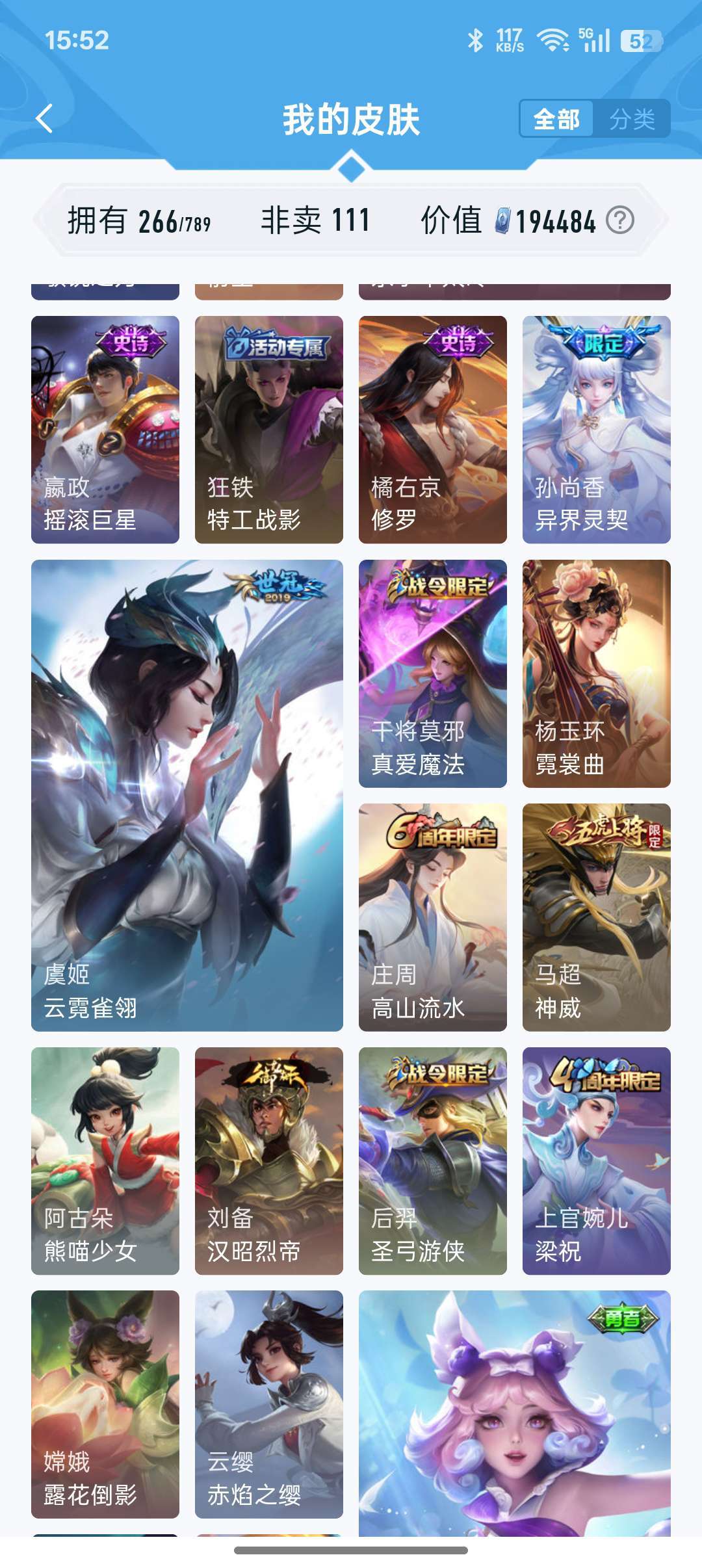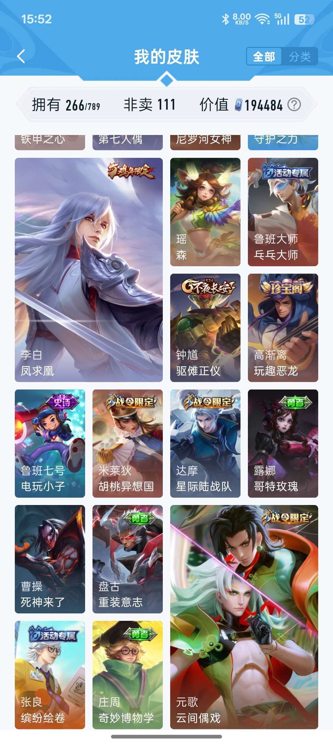 装备描述:牛年限定都有,凤求凰李白,孙尚香大部分皮肤都有,后来出的不玩了没买,战队赛太乙,等等200多皮肤,至尊宝,耀fmvp好多传说,白虎志,看图吧