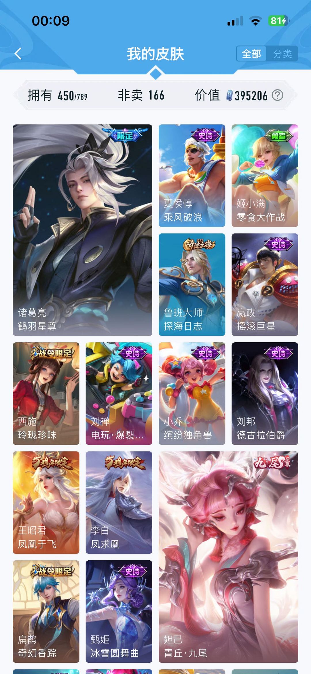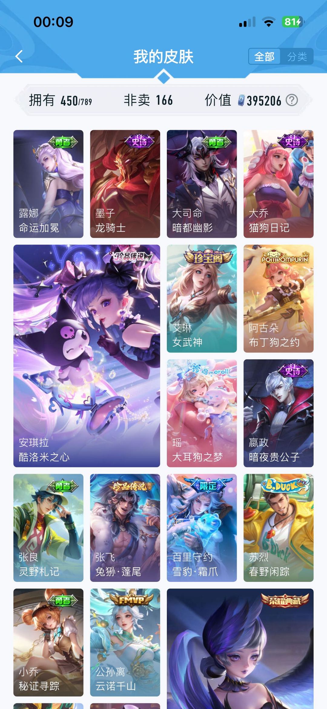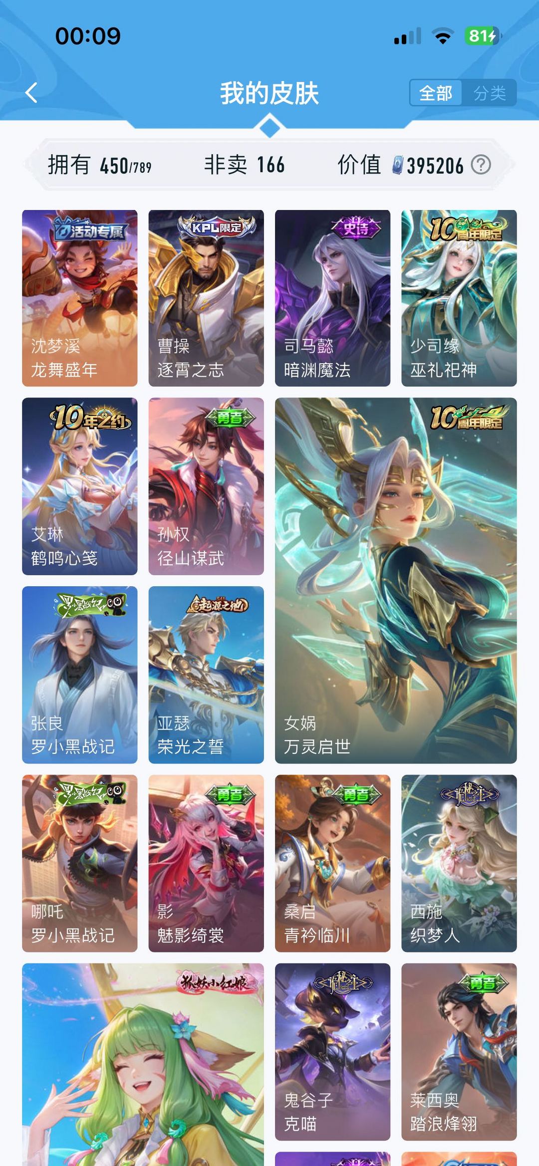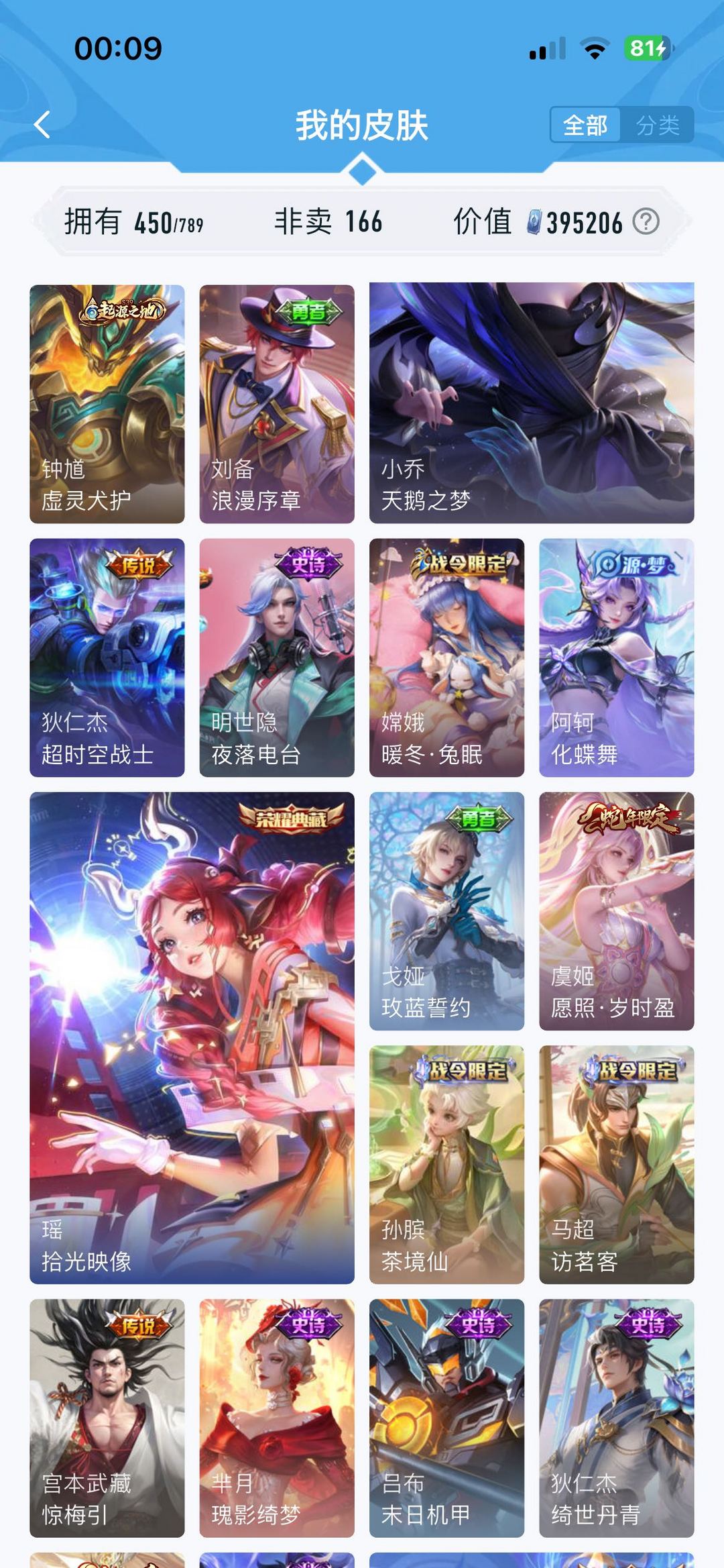 v10带妹必备、荣耀典藏:伽罗、小乔、李白、瑶。多个无双皮肤、超多传说史诗皮肤等你来玩