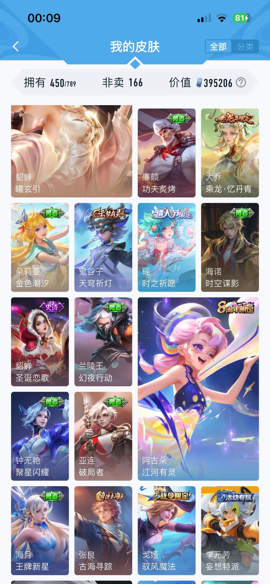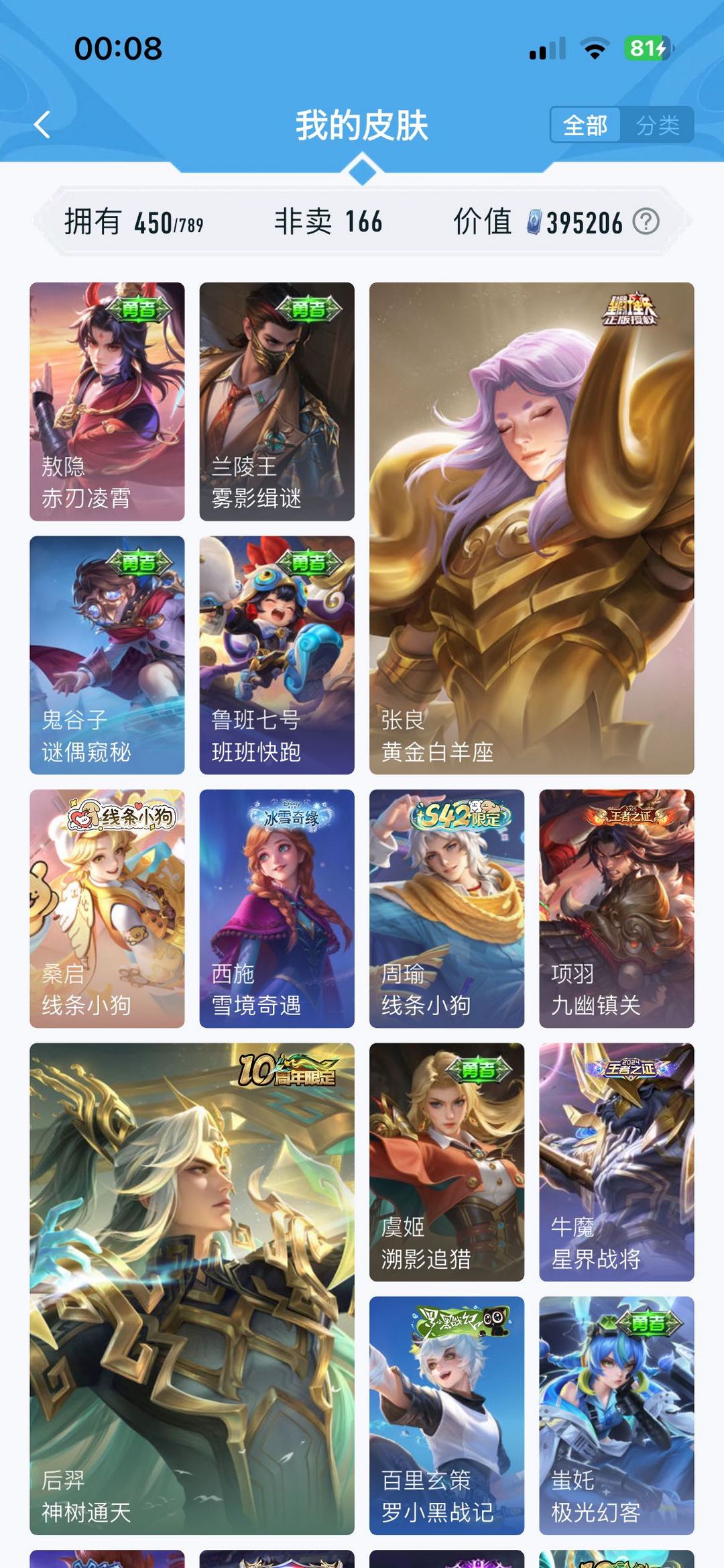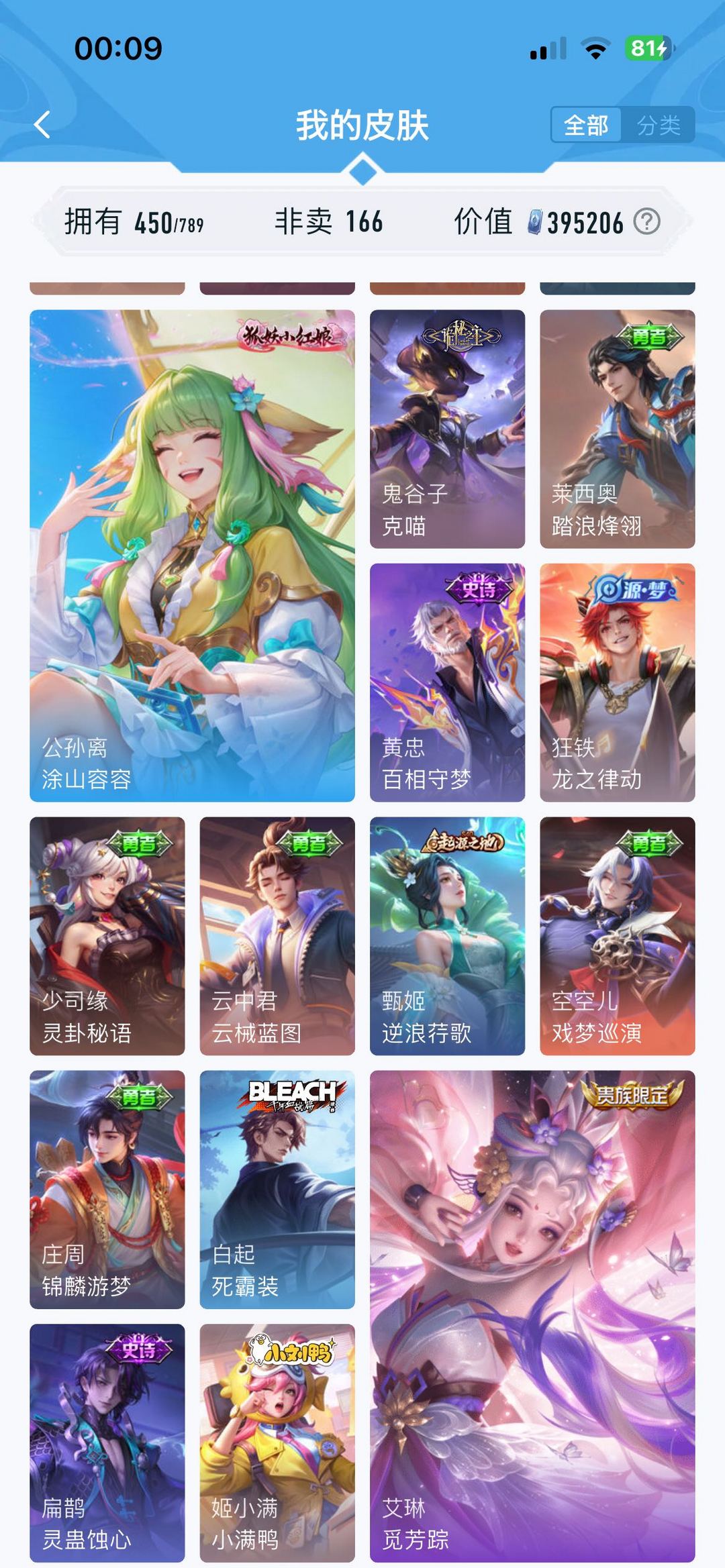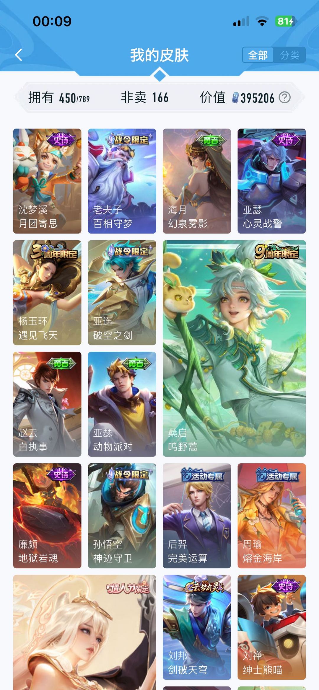 v10带妹必备、荣耀典藏:伽罗、小乔、李白、瑶。多个无双皮肤、超多传说史诗皮肤等你来玩