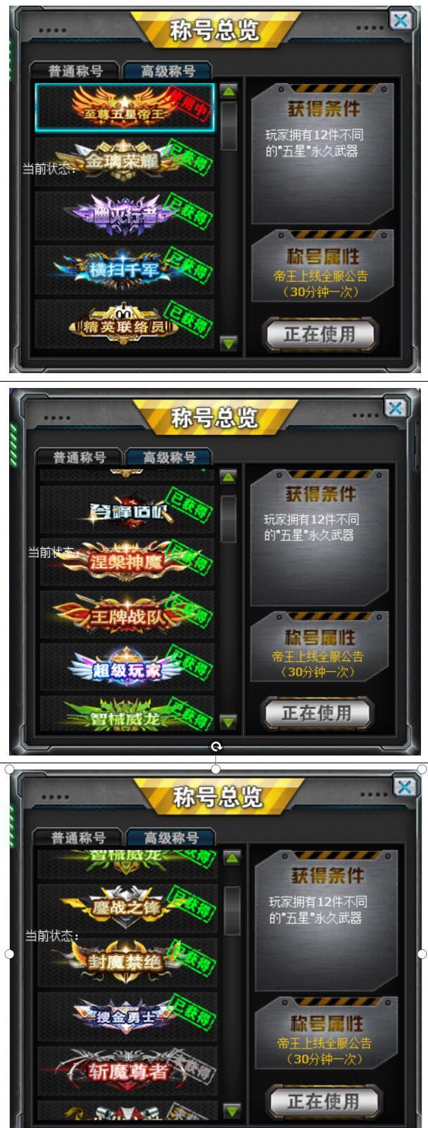 装备描述:封魔、龙域、涅槃、幽灭、冲击、赤血、海滩套、幽星套、贝瑟vip5一百多天可以关闭队友称号不挡视野。