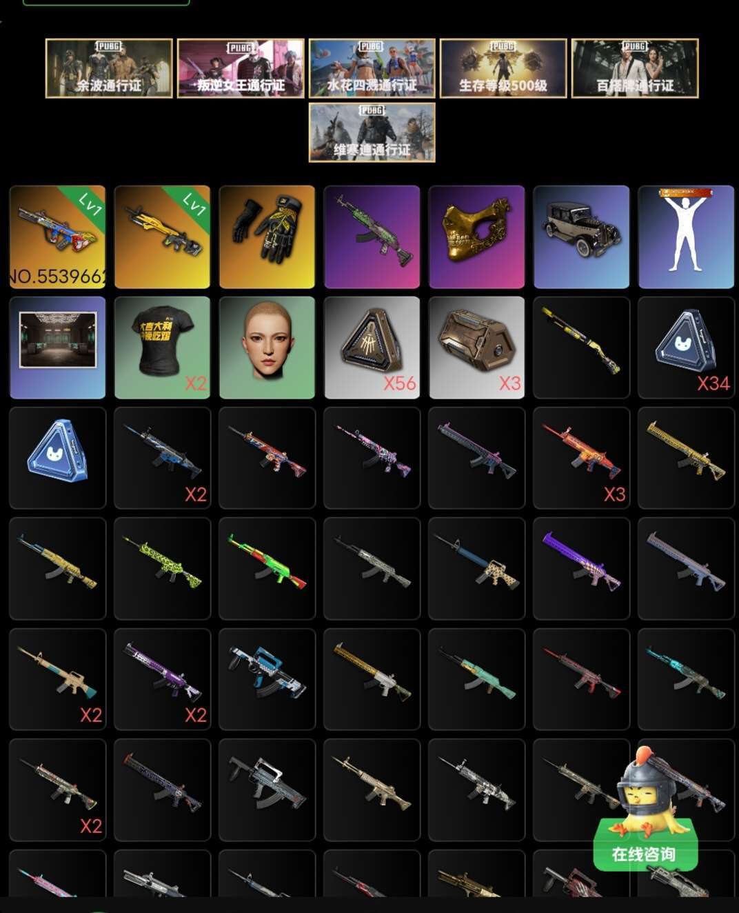 限制: 租号2次及以上 |装备描述:全武器皮肤,满级通行证,衣服裙子一大堆全网绝地吃鸡皮肤排位极品账号m4 akm m762 m24 98k绝版枪皮 绝版皮肤