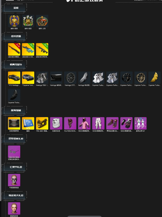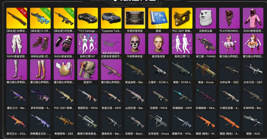 马丁跑车√时空使者M416√保时捷月光石漆√6级悟空M24√3神器√权志龙AUG√柏林鞋√悲喜套
