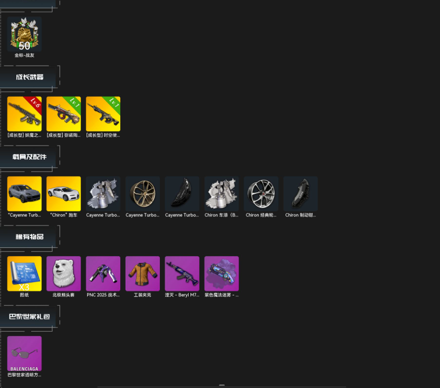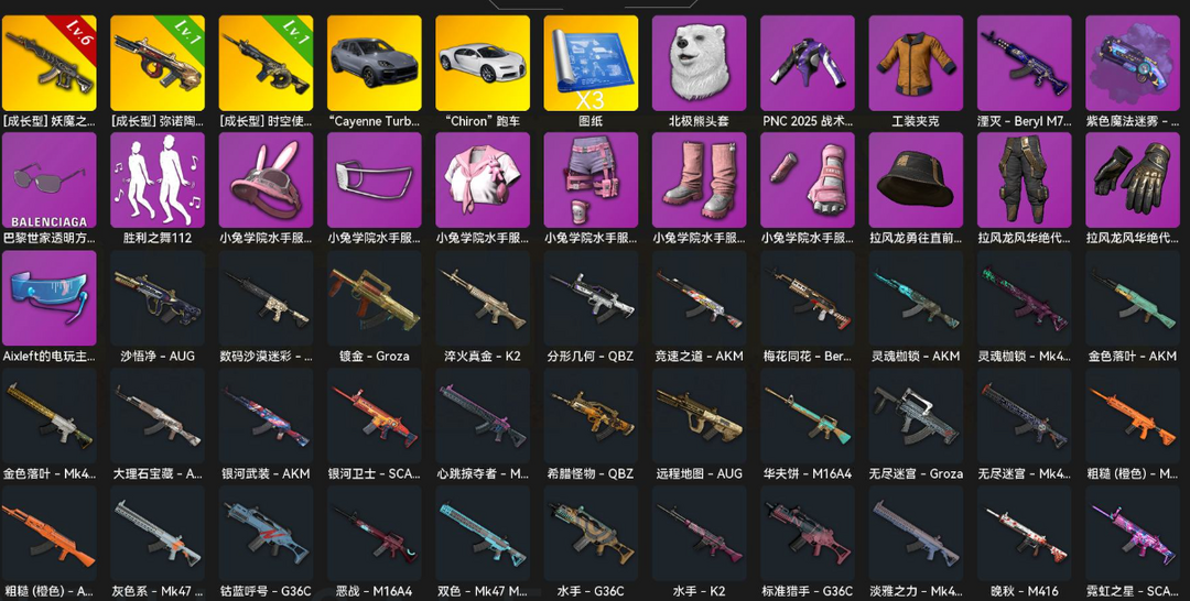 6级妖魔之触√保时捷跑车√布加迪跑车√时空使者M416√弥诺陶格诺斯AUG√紫色魔法迷雾