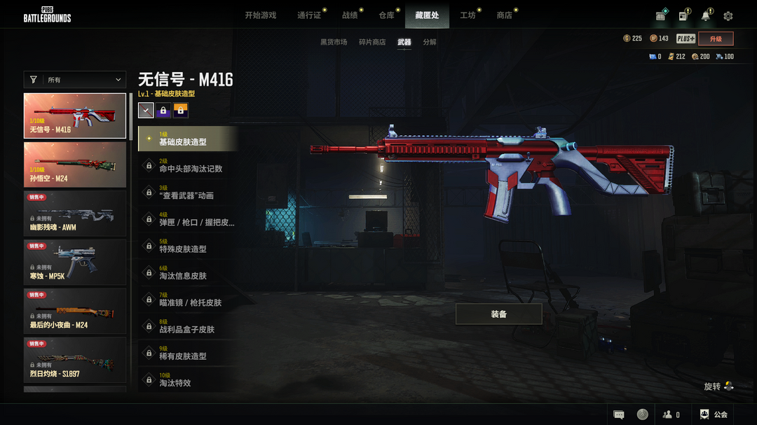 无信号M416√孙悟空M24√女皇套装√悲喜套柏林鞋√胜利收割者全套√猫咪挠摩托车√王者风衣√红面巾