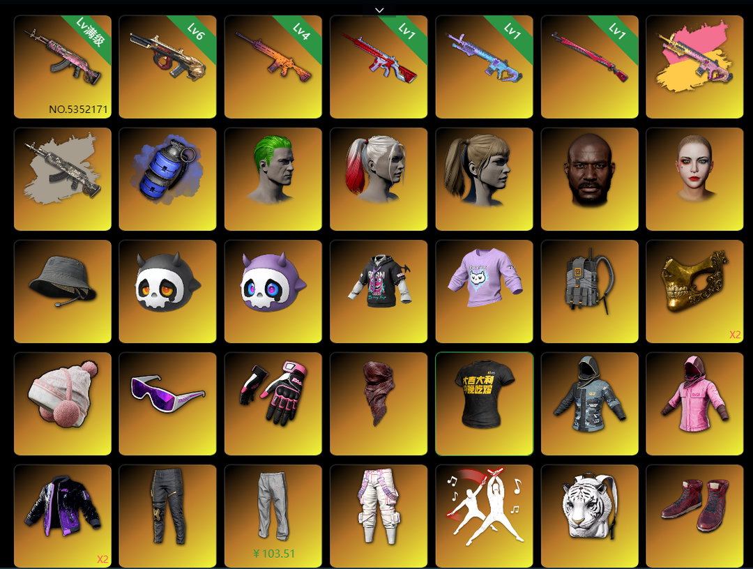 6神器10级异色火麒麟✅5级牛头aug✅4级南瓜m4✅午夜98k✅魔咒mk12✅彩烟双头小战神✅金面