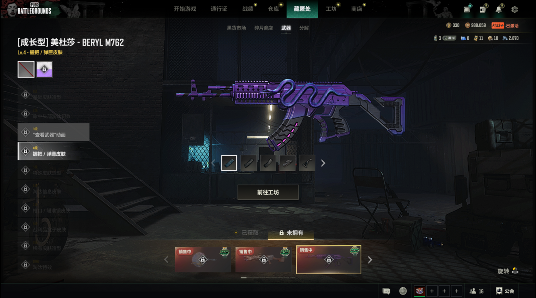 装备描述:二级密码963385阿斯顿马丁SUV美杜莎762三级无信号M4暗影MK12紫色烟枪双马尾绿头枫叶滑雪