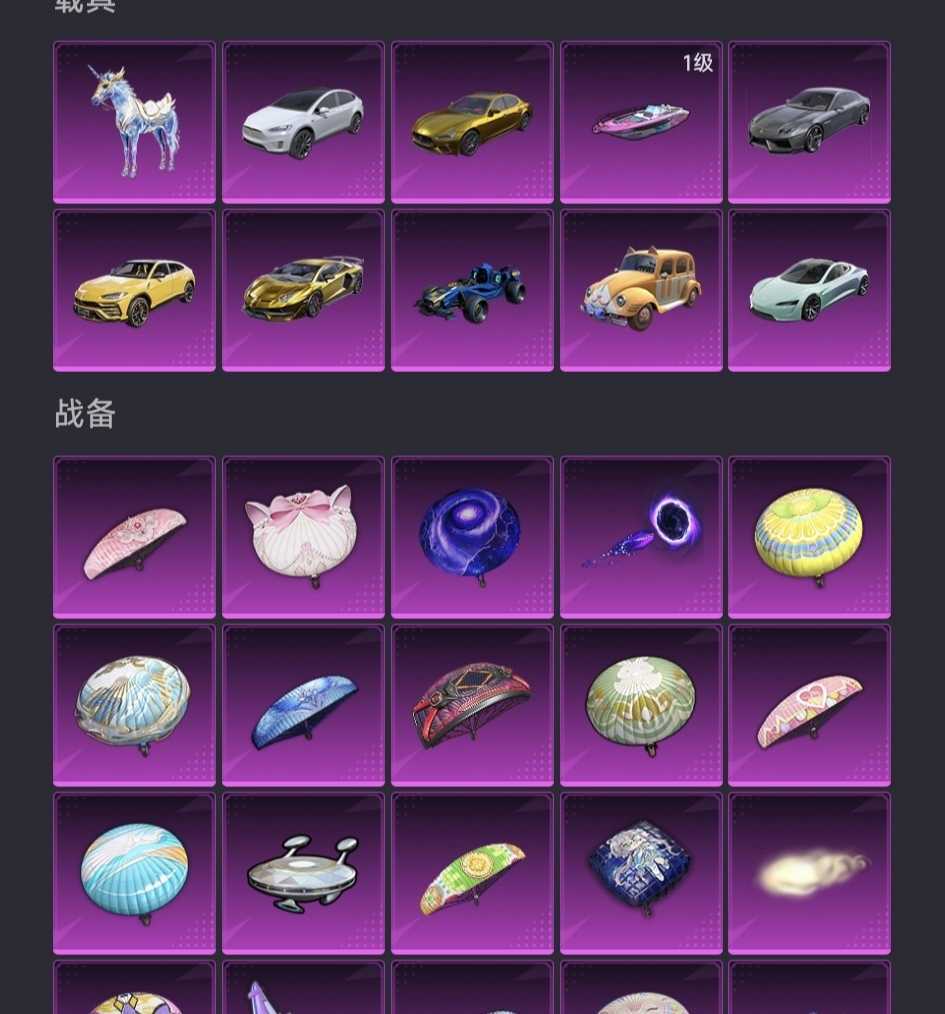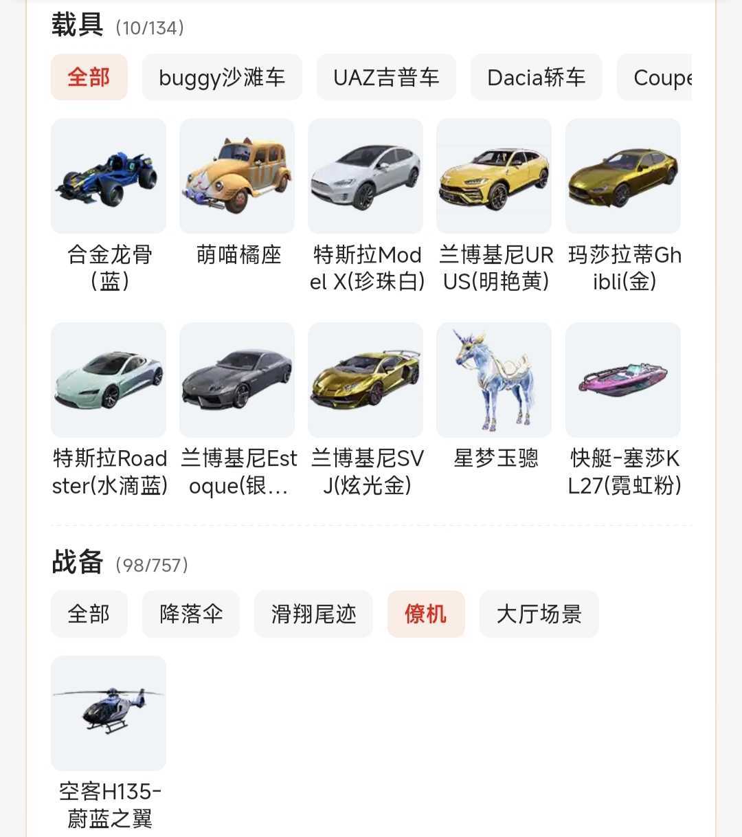 16粉装/10特效枪/10载具/1僚机/金玛莎拉蒂/金兰博/星梦玉璁/合金龙骨/特斯拉/萌猫橘座/