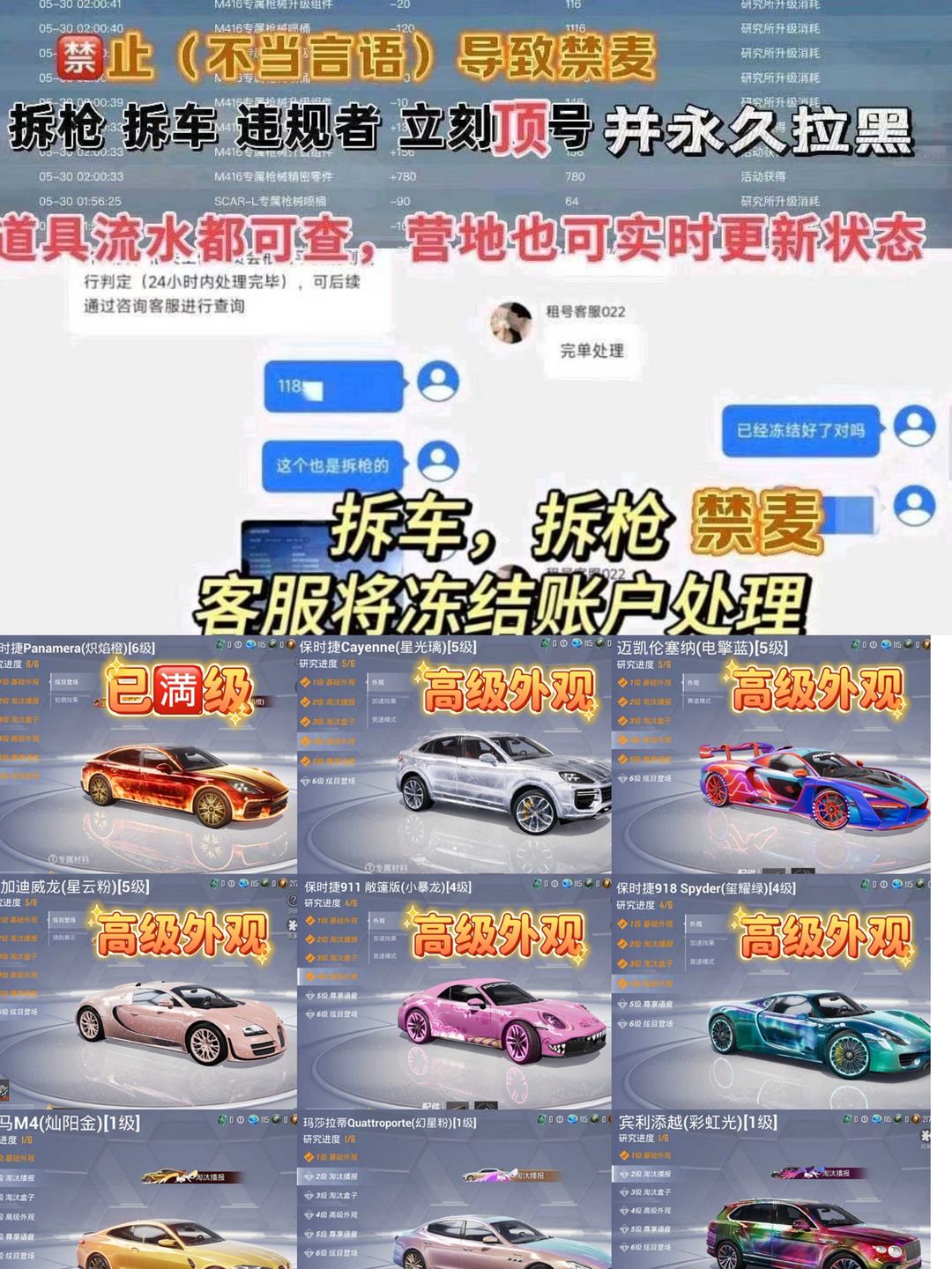 限制: 租号13次及以上 | 撤单率<60%才可租用此帐号装备描述:特别声明!!!! 分解载具枪械永久拉黑不解除 【乱投诉拉黑】和平号有问题/上不去/其他问题/ 特殊需求/投诉没用等问题 账号累计充值超35万!切勿开挂/分解装备/恶意骂人/等等违规行为,发现违规必追查到底(平台登录记录,游戏登录ip手机号 设备串号 充值付款记录不要侥幸现在网警都能调到你的所有行为记录就算盗用他人信息也一样能查到你头上)按账号充值金额=起诉/刑事立案/追责赔偿! 非速玩【非云!本机设备畅玩不卡顿】