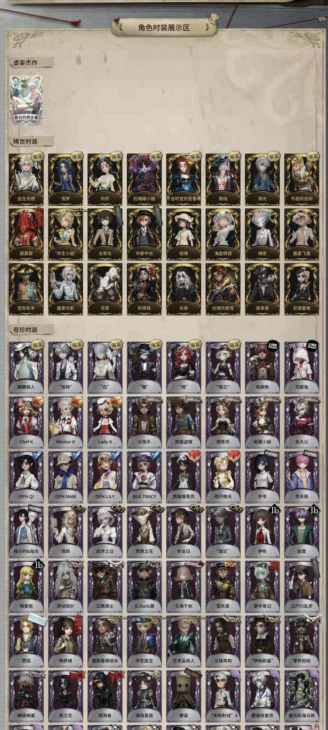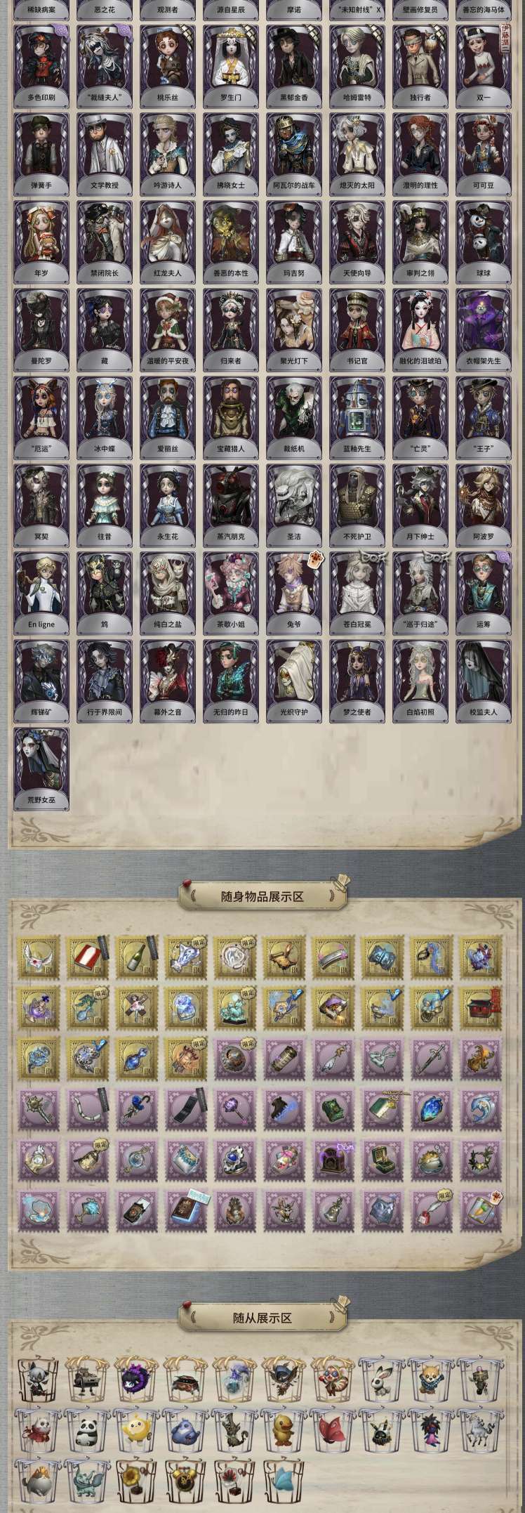 装备描述:白黯绯加特麒麟,太宰治,中原中也,先知虚妄-昔日的预言者,石榴碟,聂莫黎,华生小姐 电竞系列套:佣兵、古董、拉拉、机械 布朗熊、可妮兔、熊猫保育员 kfc:骑士、调香、渔女 有山庄和221b 随从:邦哥、托特