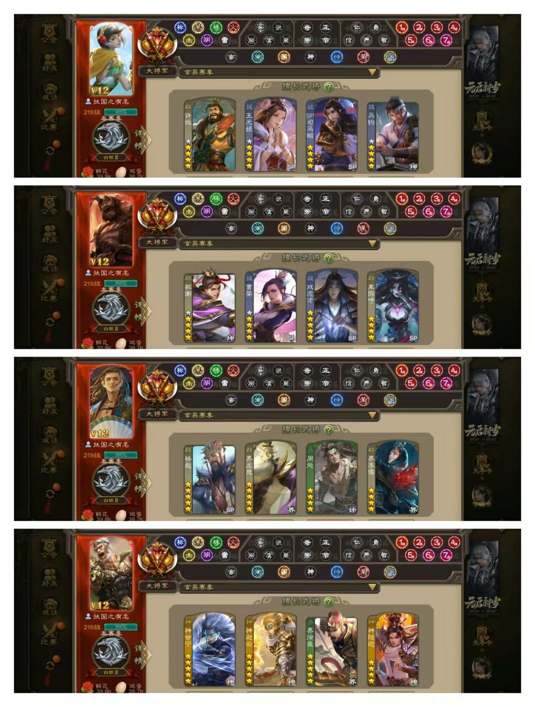 限制: 撤单率<19%才可租用此帐号装备描述:官方一等大将军,无卡,VIP12! 8五星炎龙:神甘宁动皮! 29四星玉龙:王元姬许攸卑弥呼界左慈李儒动皮,曹婴神陆逊赵云戏志才曹纯动皮,杨彪马钧界徐盛金皮,神郭嘉杜预祢衡司马师! 60史诗武将,庞德公南华老仙司马徽周处等! 72动皮149金皮190国战皮肤!