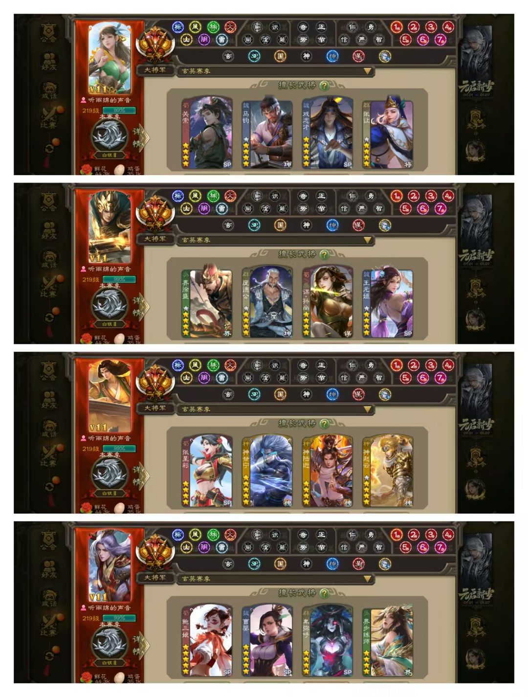限制: 撤单率<19%才可租用此帐号装备描述:官方二等大将军,无卡,VIP11! 5五星炎龙:曹婴动皮,马钧金皮! 25四星玉龙:鲍三娘马云禄手办动皮,神甘宁陆逊赵云庞德公卑弥呼动皮,关索戏志才界孙权王元姬曹纯动皮,界徐盛金皮,谋孙尚香谋孙策郝昭骆统! 55史诗武将,界钟会动皮,张星彩金皮,界李儒步练师郑玄等! 43动皮93金皮160国战皮肤!