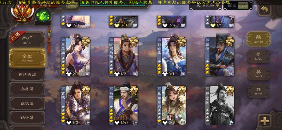 有手气卡-蒋济笮融友诸葛亮伪全扩100ss130排位1等大将军回廊皮肤全◆神司马懿回廊神荀彧十常侍