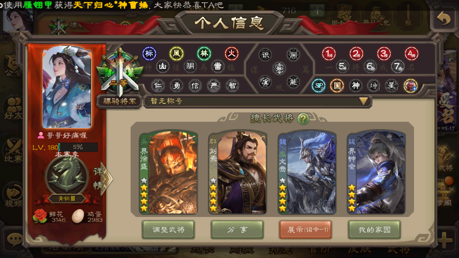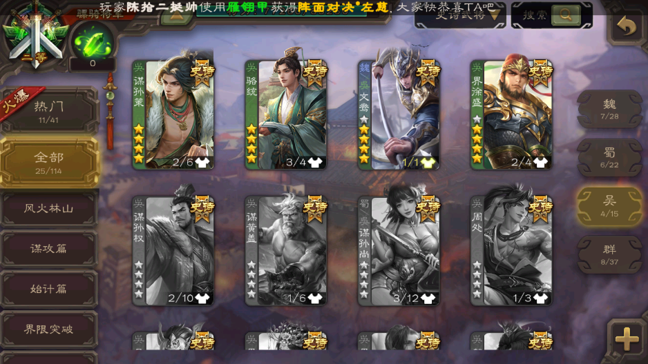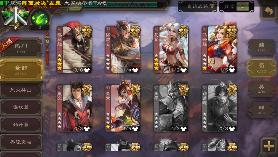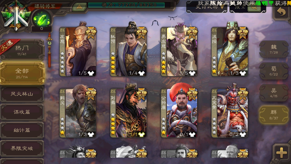 限制: 撤单率<80%才可租用此帐号装备描述:【有点将卡】大将军◆动刘焉◆动神甘宁◆动徐荣◆58史诗动神赵云神刘备马钧戏志才界徐盛留赞骆统祢衡左慈