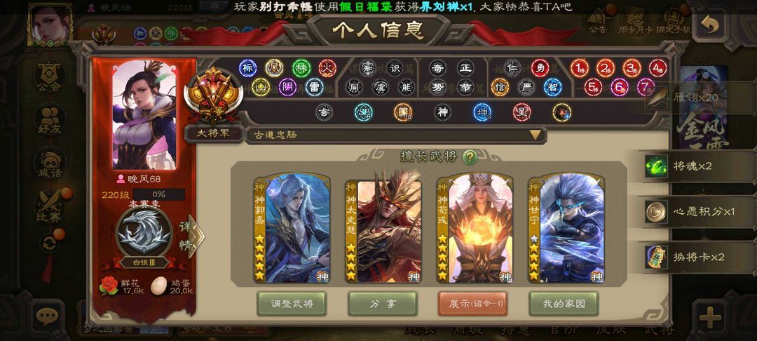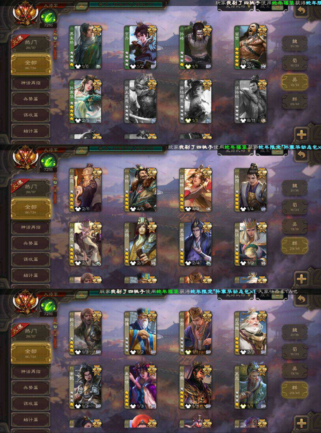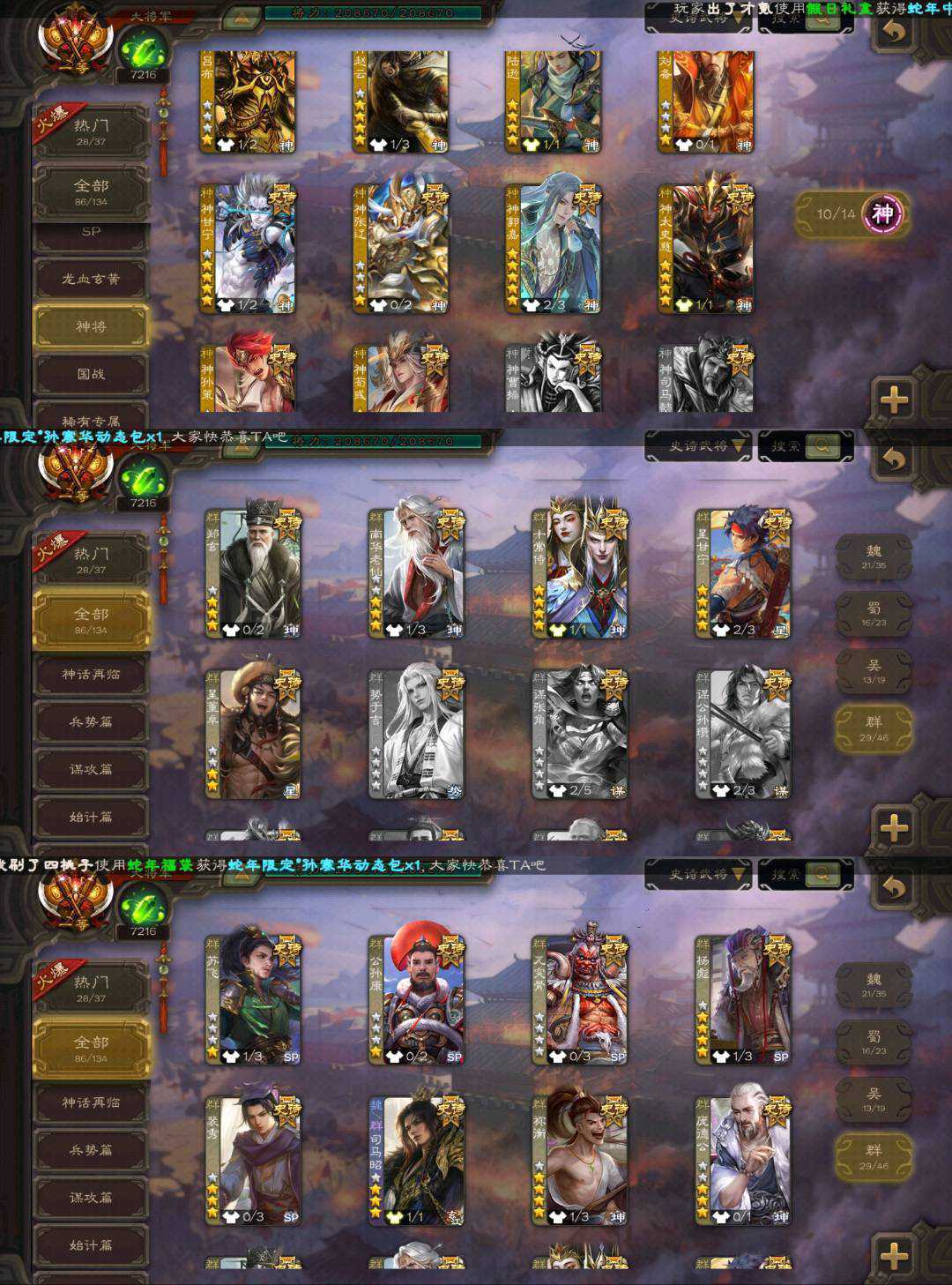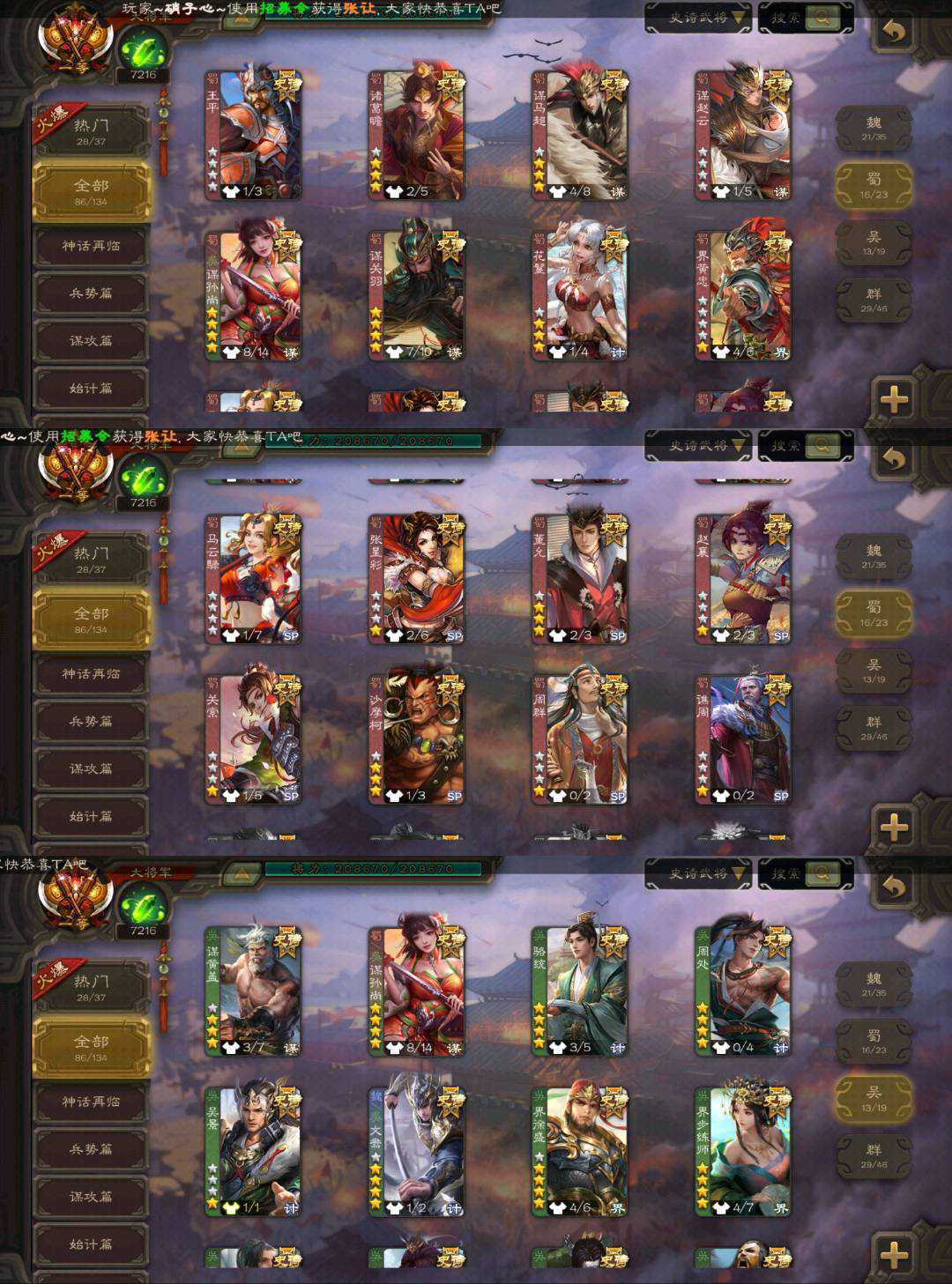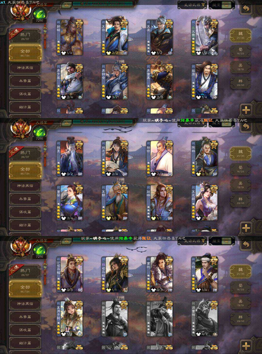 装备描述:魏:动态文鸯 界钟会 双形态司马昭 马钧 曹婴 蜀:动态谋关羽 谋孙尚香 吴:谋黄盖 界徐盛 动态孙寒华 留赞 群:动态刘焉 至臻十常侍 动态谋貂蝉 杜预 南华老仙 裴秀 神:动态神甘宁 双形态神郭嘉 动态神太史慈 动态神孙策 动态神荀彧 神赵云