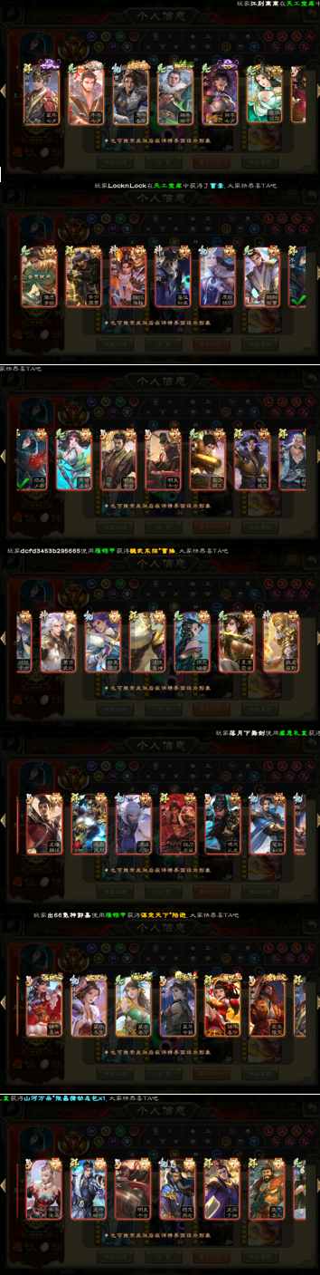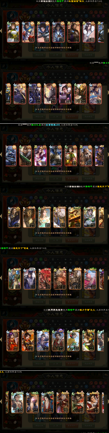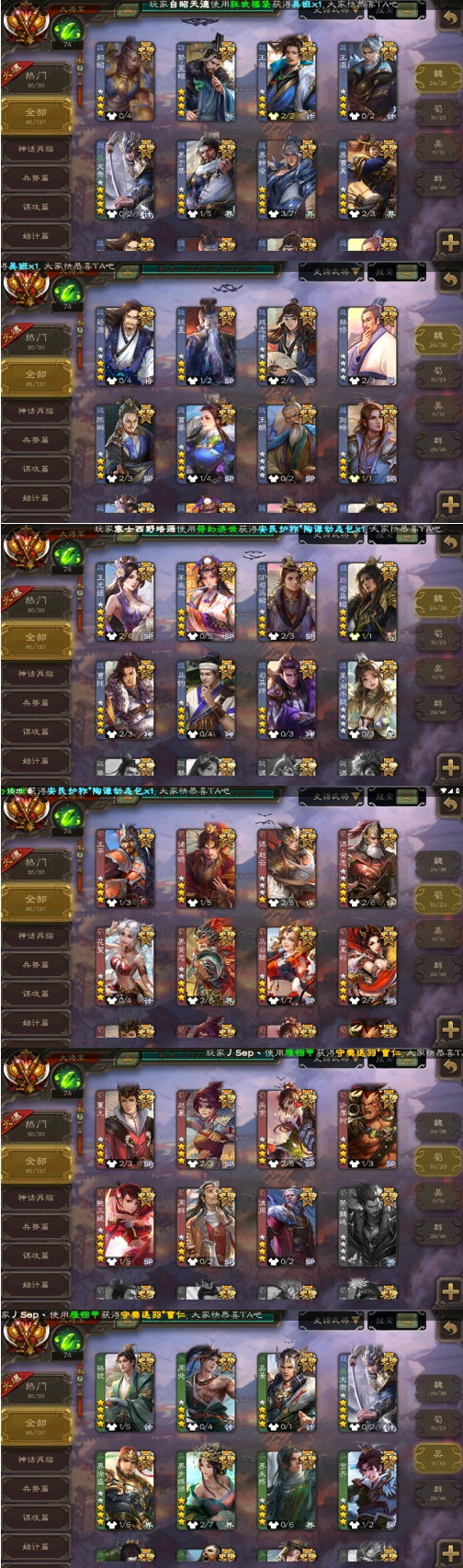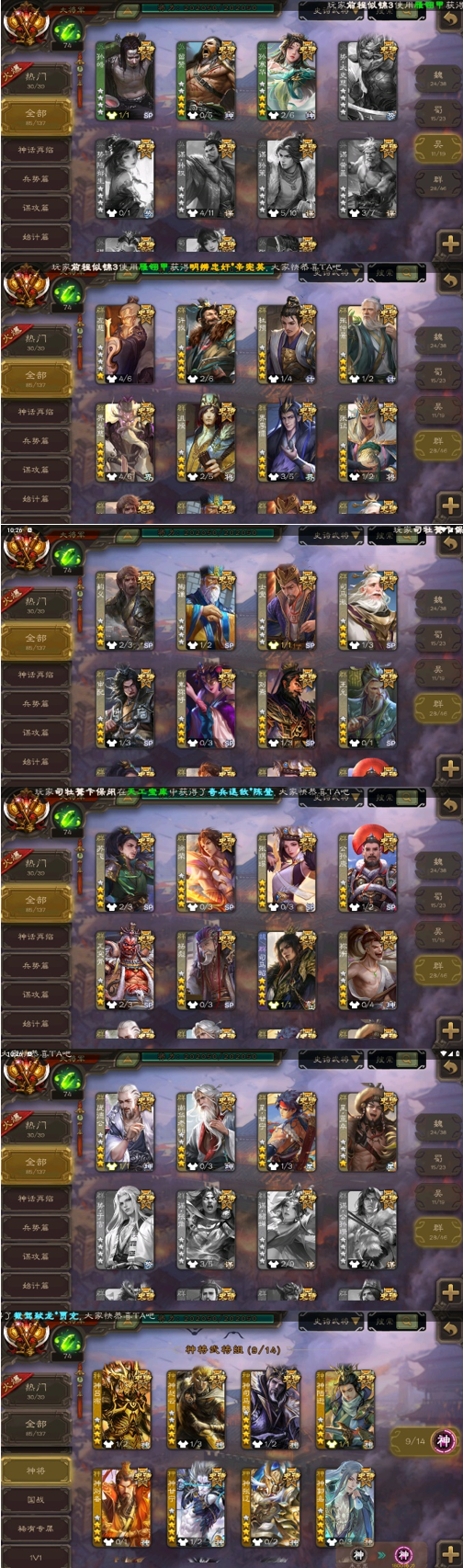 装备描述:魏---文鸯、司马昭、界钟会、羊徽瑜、戏志才、马钧、王元姬、SP司马昭、曹婴、星周不疑、司马师、曹纯、程昱、郝昭王朗、界曹真、王粲、界于禁、刘晔、陈琳、杨修、嵇康、王凌、势董昭 蜀---鲍三娘、花鬟、关索、张星彩谋黄忠、沙摩柯、谋赵云、诸葛瞻、谯周、赵襄。界黄忠、董允、马云、周群、王平 吴---界徐盛、孙寒华、文鸯、留赞、骆统、周处、界步练师、界朱然、吴景、贺齐、孙皓 群---刘焉、杜预、杨彪、麹义、许攸、徐荣界左慈、界李儒、南华老仙、星董卓、祢衡、卑弥呼、张让、张琪瑛、张仲景、司马徽、星甘宁、左慈、沮授、庞德公、公孙康、兀突骨、苏飞、审配、士燮、王允、陶谦、司马昭 神---神司马懿、神郭嘉、神甘宁、神太史慈神赵云、神吕布、神陆逊、神张辽、神诸葛亮、神刘备