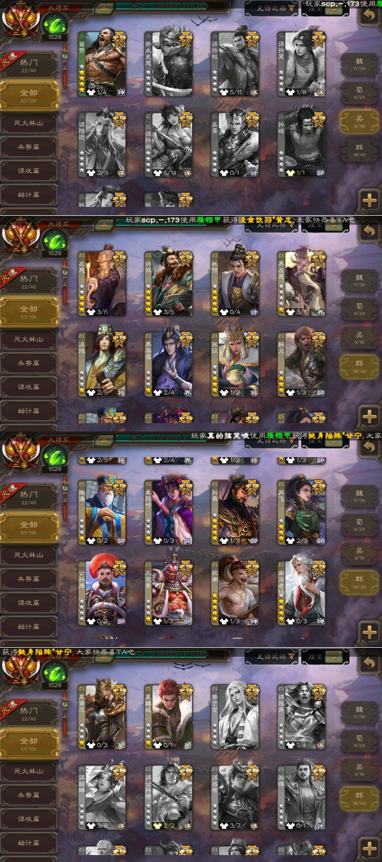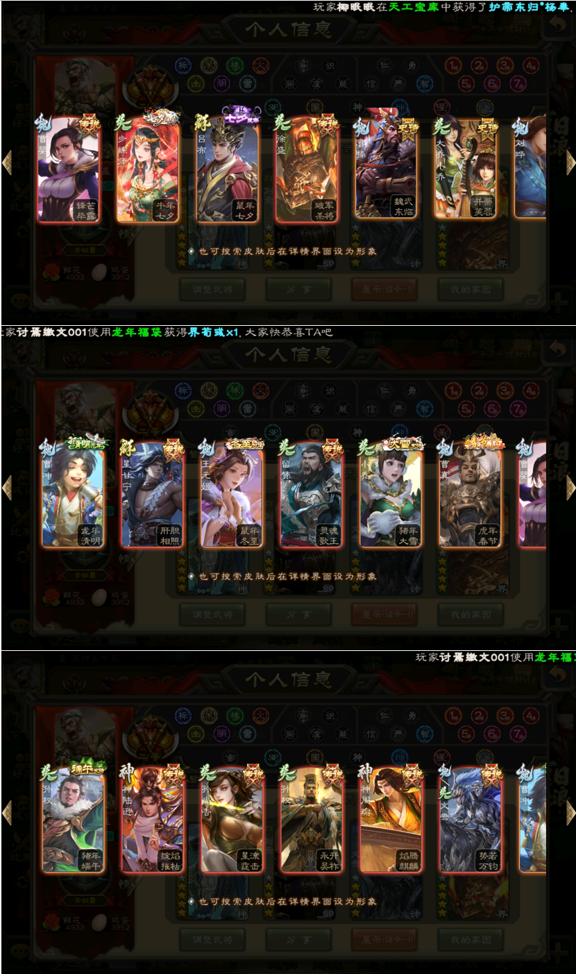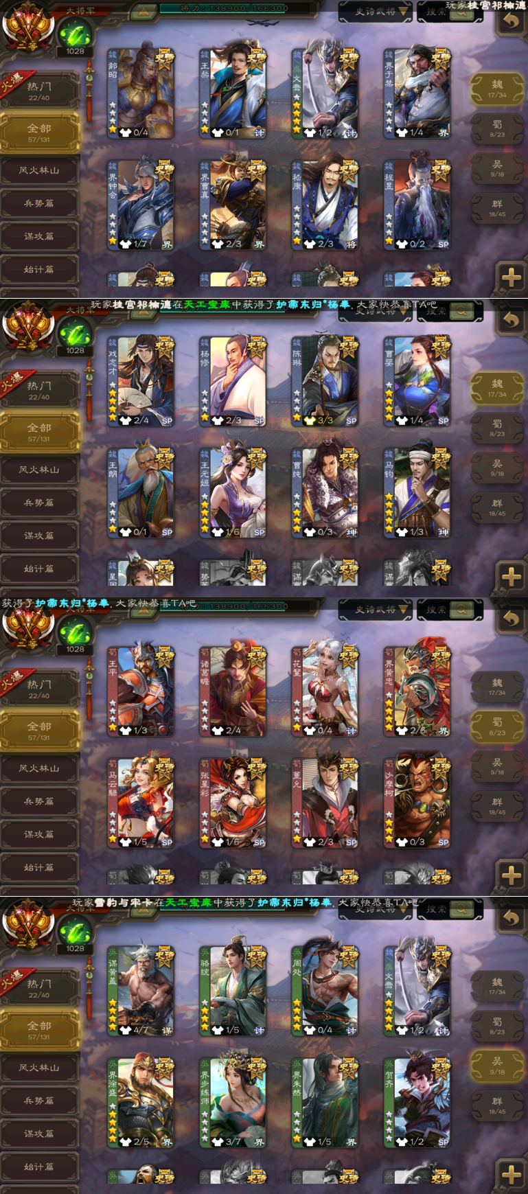 装备描述:◆◆魏◆◆文鸯、界钟会、戏志才、马钧、王元姬、曹婴、星周不疑、曹纯、程昱、郝昭、王朗、界曹真、王粲、界于禁、陈琳、杨修、嵇康 ◆◆蜀◆◆花鬟、张星彩、沙摩柯、诸葛瞻、谯周、界黄忠、董允、马云、王平 ◆◆吴◆◆留赞、骆统、周界徐盛、文鸯、谋黄盖、处、界步练师、界朱然、贺齐 ◆◆群◆◆刘焉、杜预、麹义、许攸、界左慈、界李儒、南华老仙、星黄忠、祢衡、卑弥呼、张让、左慈、沮授、星魏延、公孙康、兀突骨、苏飞、陶谦 ◆◆神◆◆神郭嘉、神太史慈、神赵云、神吕布、神陆逊、神张辽