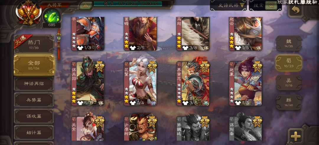 50史诗130排位傲凌绝顶谋孙策鳞振神赵动谋陆逊动谋关羽动留赞文鸯大宝清河司马昭陆郁生