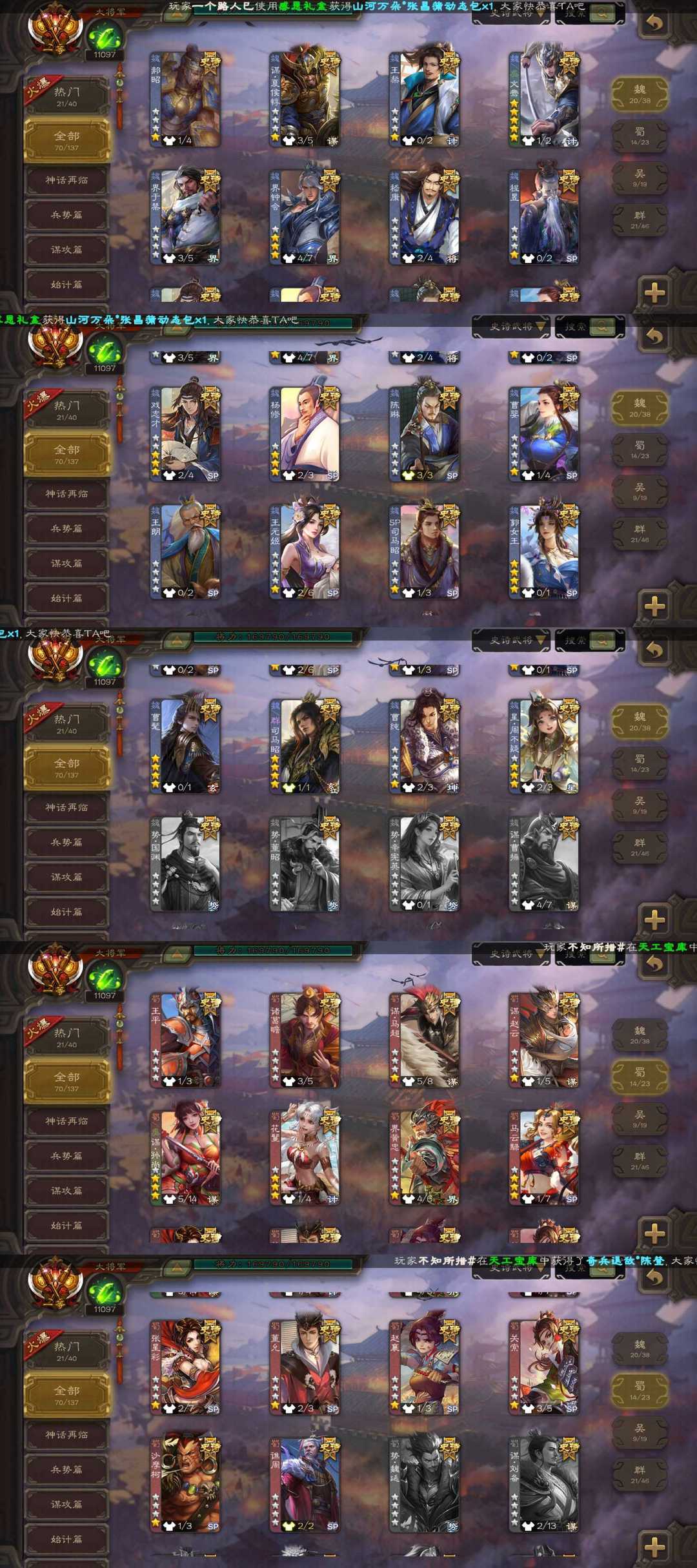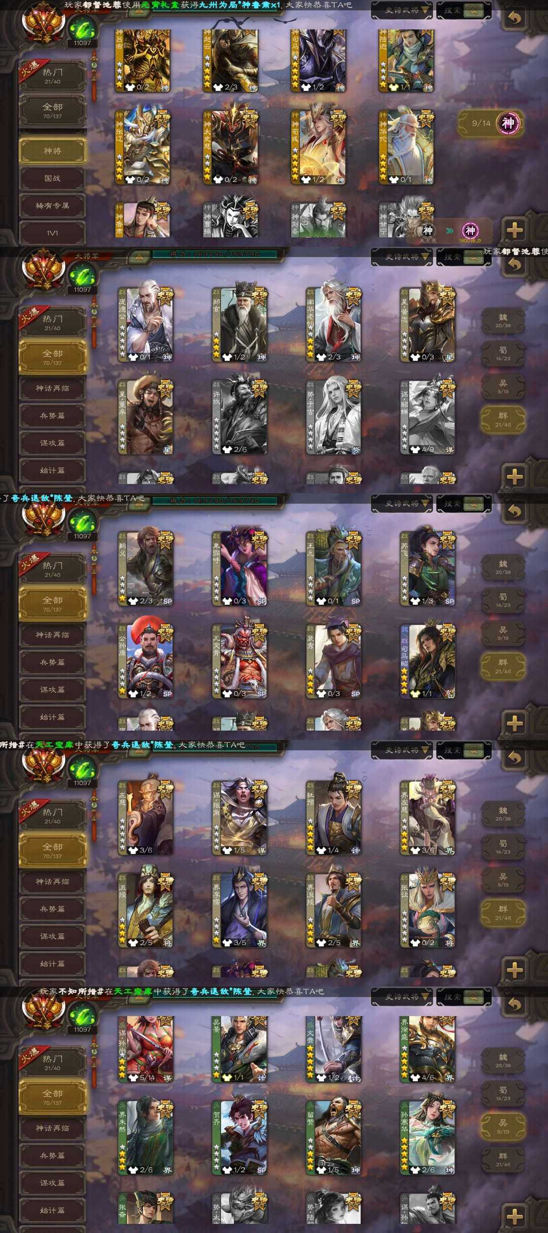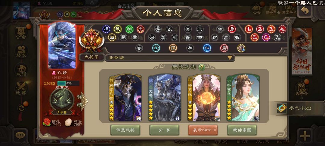 装备描述:魏国:⚡郝昭⚡谋夏侯惇⚡王粲⚡文鸯⚡界于禁⚡界钟会⚡嵇康⚡程昱⚡戏志才⚡杨修⚡陈琳⚡曹婴⚡王朗⚡王元姬⚡SP司马昭⚡郭女王⚡曹髦⚡司马昭⚡曹纯⚡星周不疑⚡ 蜀国:⚡王平⚡诸葛瞻⚡谋马超⚡谋赵云⚡谋孙尚香⚡花鬘⚡界黄忠⚡马云禄⚡张星彩⚡董允⚡赵襄⚡关索⚡沙摩柯⚡谯周⚡ 吴国:⚡吴景⚡界徐盛⚡界朱然⚡贺齐⚡留赞⚡孙寒华⚡张奋⚡ 群雄:⚡左慈⚡谋张角⚡杜预⚡界左慈⚡沮授⚡界李儒⚡界沮授⚡张让⚡麴义⚡卑弥呼⚡王允⚡苏飞⚡公孙康⚡兀突骨⚡裴秀⚡庞德公⚡郑玄⚡南华老仙⚡星黄忠⚡星董卓⚡ 神将:⚡神吕蒙⚡神周瑜⚡神吕布⚡神赵云⚡神司马懿⚡神陆逊⚡神张辽⚡神太史慈⚡神荀彧⚡神华佗⚡神鲁肃⚡ 排位:121 国战:96 战龙在野-神赵云 鉴往知来-神司马懿 绽焰摧枯-神陆逊 匡汉延祚-神荀彧 势若万钧-文鸯 举棋若定-戏志才 锋芒毕露-曹婴 鼠年冬至-王元姬 明良千古-孙尚香 临军对阵-张星彩 破军杀将-徐盛 灵魂歌王-留赞 蛇年限定-孙寒华 莲华熠熠-孙寒华 道法显威-左慈 弼朝博虬-杜预 鸠杀少帝-李儒 扬刀立威-麹义 野鹤闲云-南华老仙 冠绝天下-南华老仙