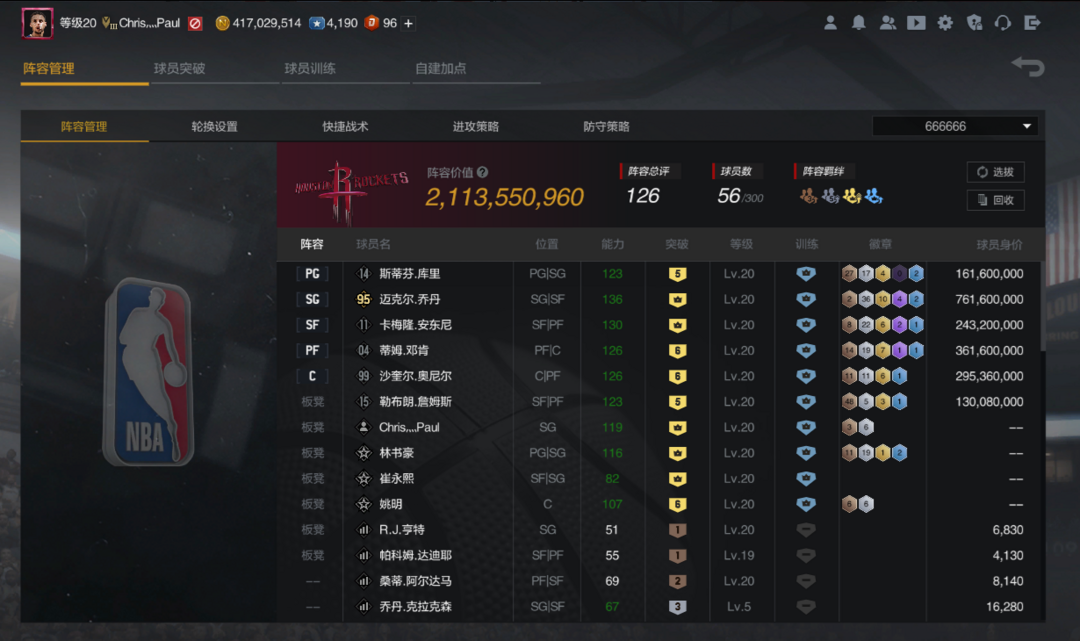 22E亿阵容】5突14库里满突纽约安东尼6突邓肯6突奥尼尔5突骑士詹姆斯满突95公牛乔丹带空中飞人