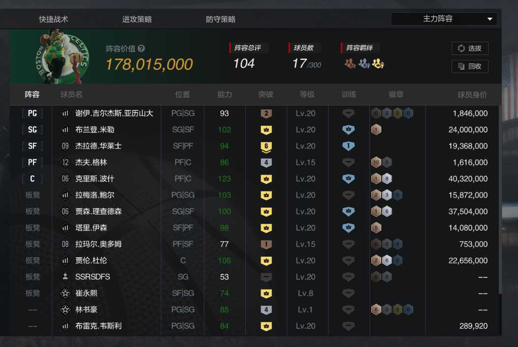 限制: 撤单率<80%才可租用此帐号装备描述:★金州扣篮王贾森理查德森★06波什★三球拉梅洛★布兰登米勒★塔里伊森★贾伦杜伦★猫王